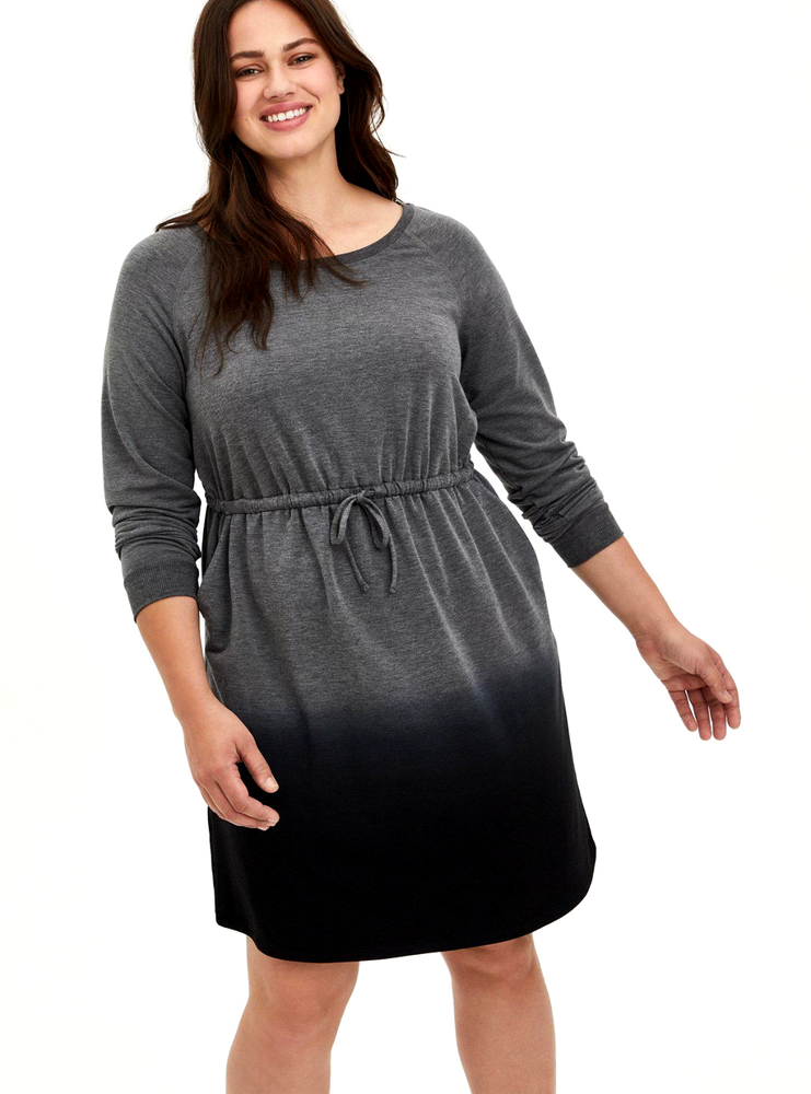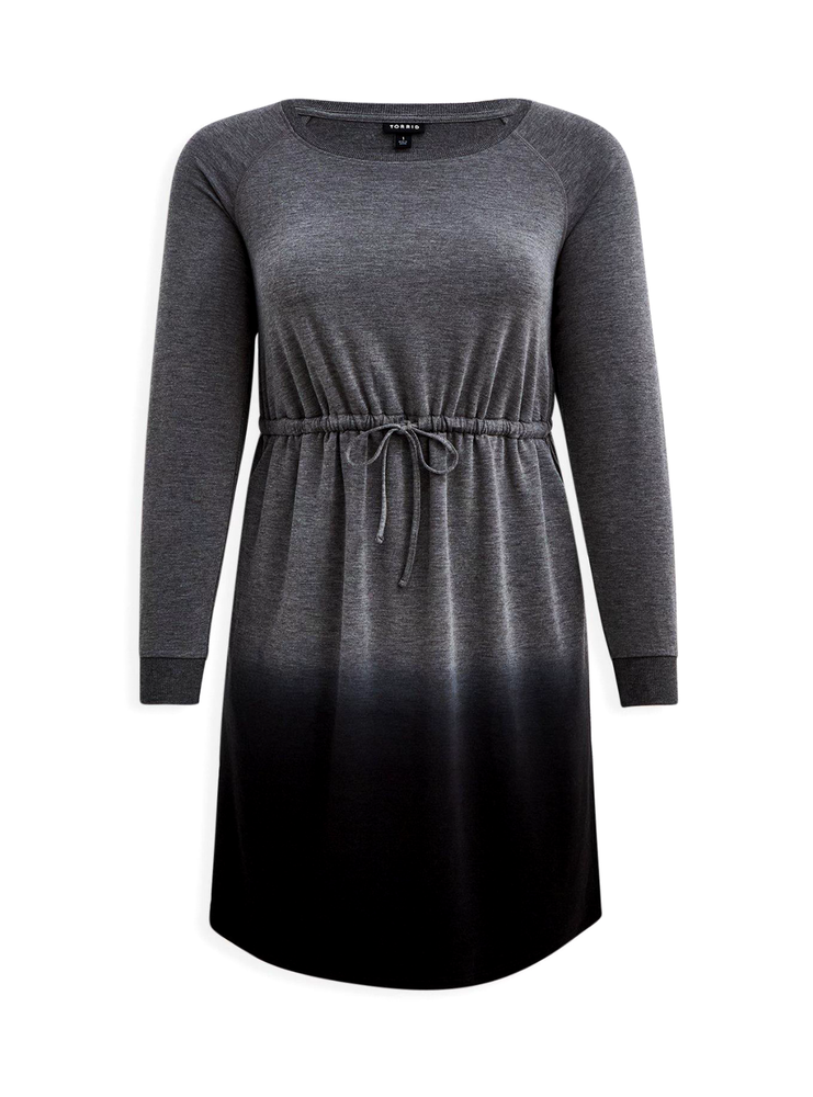 This Torrid skater dress in heather grey dip dye is a perfect addition to your winter and fall wardrobe. With a scoop neck, 3/4 sleeves and pullover closure, this knee-length dress is ideal for casual occasions. The dress is made of 57% cotton, 37% rayon and 6% spandex, making it comfortable and machine washable. The dress is a plus size 2 (18-20) and has a solid pattern. It comes from a trusted brand, Torrid, and the fabric type is French Terry. This sweatshirt style dress is suitable for any season and can be paired with your favorite accessories to complete your look. French terry knit fabric. 57% cotton, 37% rayon, 6% spandex. Wash cold. Line dry. Scoop neck. Off shoulder. Skater silhouette. Tie front detail. Long sleeves. Dip dye.