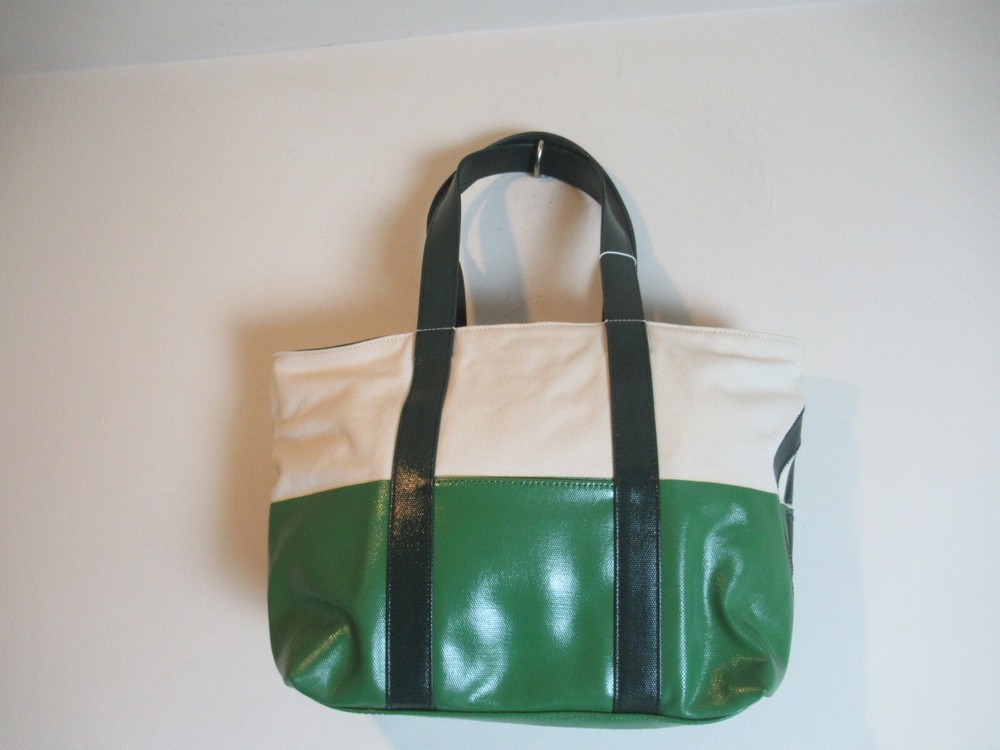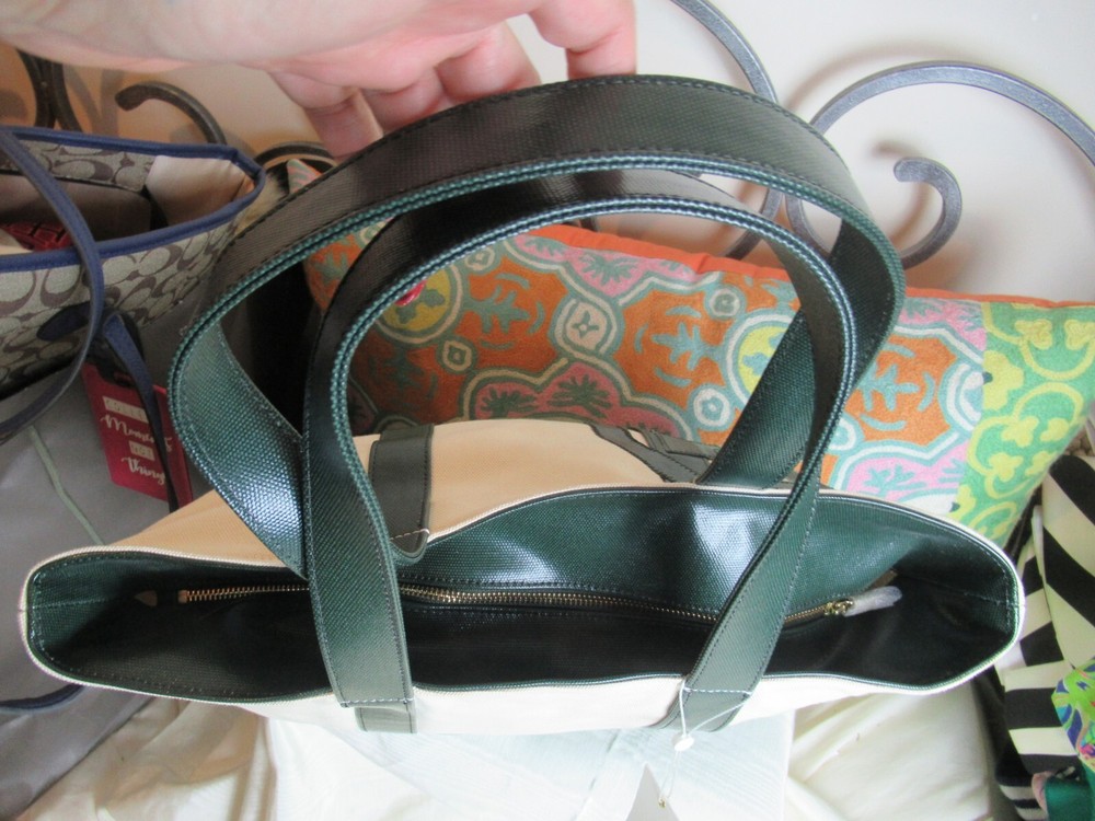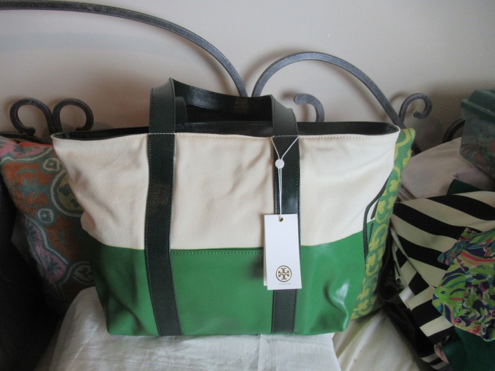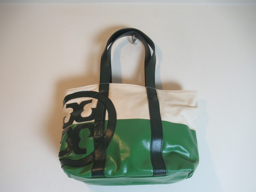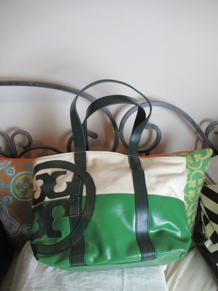 The Beach Dipped Small Zip Tote is a classic must have silhouette with a graphic color-blocked design. Made of durable canvas with glossy coated detailing along with an oversized fun logo, color: natural/peapod and jitney green Interior hanging pocket at back wall with two slit pockets. Zipper closure. Flat coated canvas shoulder straps with 9" Height: 11" (28 cm) Length: 12.5" to 17" top Depth: 5.5" Tory Burch 21159620 dipped beach tote. New with tags!!! Perfectly styled for the beach or everyday. This spacious tote is crafted from durable coated canvas with a glossy finish and half dipped in a contrasting hue for a gorgeous pop of color. * Double top handles 9" (22.8 cm) drop Top zip closure. *style No:21159620 color: natural/peapod and jitney green