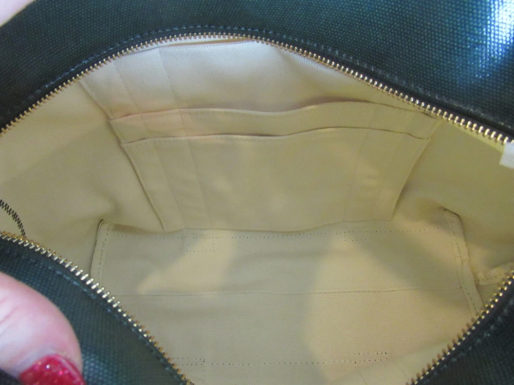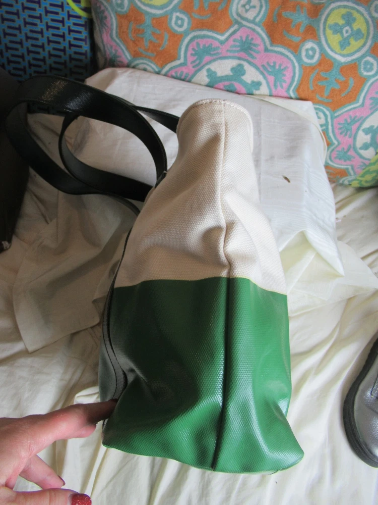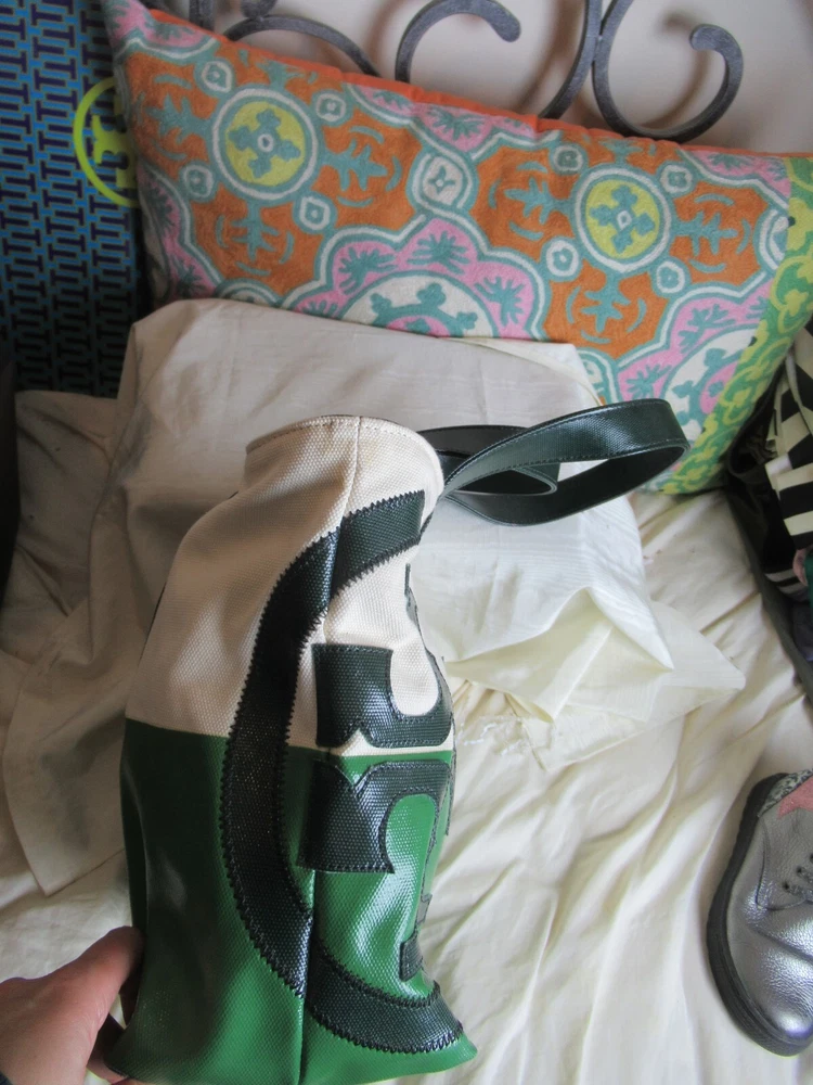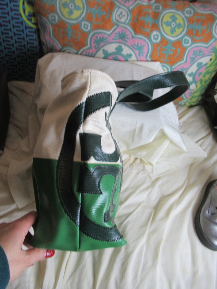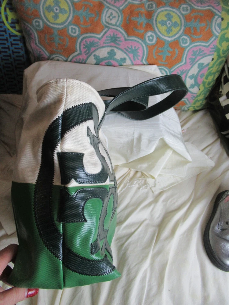 The Beach Dipped Small Zip Tote is a classic must have silhouette with a graphic color-blocked design. Made of durable canvas with glossy coated detailing along with an oversized fun logo, color: natural/peapod and jitney green Interior hanging pocket at back wall with two slit pockets. Zipper closure. Flat coated canvas shoulder straps with 9" Height: 11" (28 cm) Length: 12.5" to 17" top Depth: 5.5" Tory Burch 21159620 dipped beach tote. New with tags!!! Perfectly styled for the beach or everyday. This spacious tote is crafted from durable coated canvas with a glossy finish and half dipped in a contrasting hue for a gorgeous pop of color. * Double top handles 9" (22.8 cm) drop Top zip closure. *style No:21159620 color: natural/peapod and jitney green