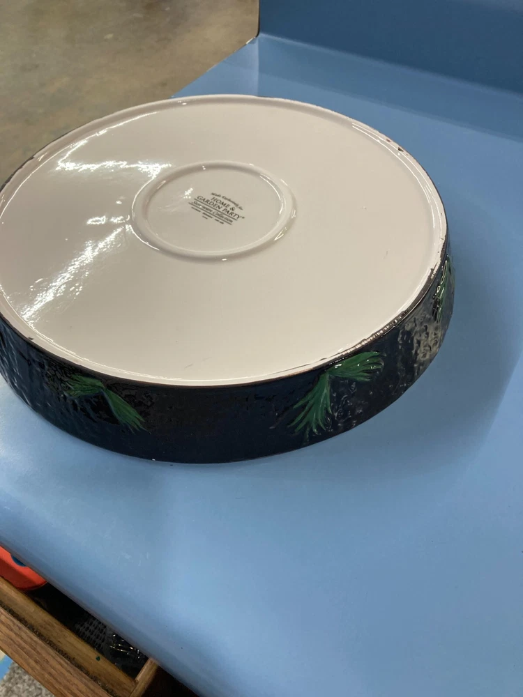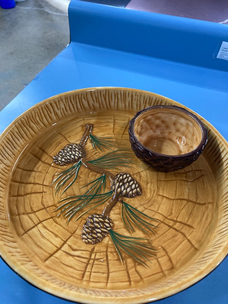 Elevate your party serving with the Celebrating Home Tray with Bowl, perfect for an array of occasions from Christmas to graduations. The set, crafted from durable glass, boasts a stylish woodland theme with a glossy finish that captures the essence of a rustic charm. With dimensions of 14 inches round and a depth of 2 inches, it's an ideal size for serving chips and salsa or veggies for a crowd.The tray features a large, brown-gold leaf design that exudes elegance, complemented by a pair of place settings. The accompanying 3-inch diameter bowl sits snugly on the tray, making it a convenient and aesthetically pleasing addition to your entertaining ensemble. Hand wash care is recommended to maintain the set's beauty. Whether it's for a festive gathering or a casual get-together, this tray with bowl dips adds a touch of sophistication to your event. Note; box is a little dusty from storage, but set is beautiful and never used.