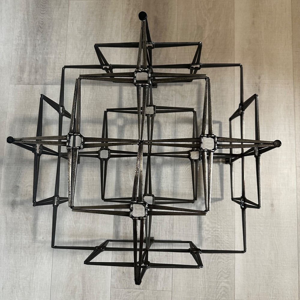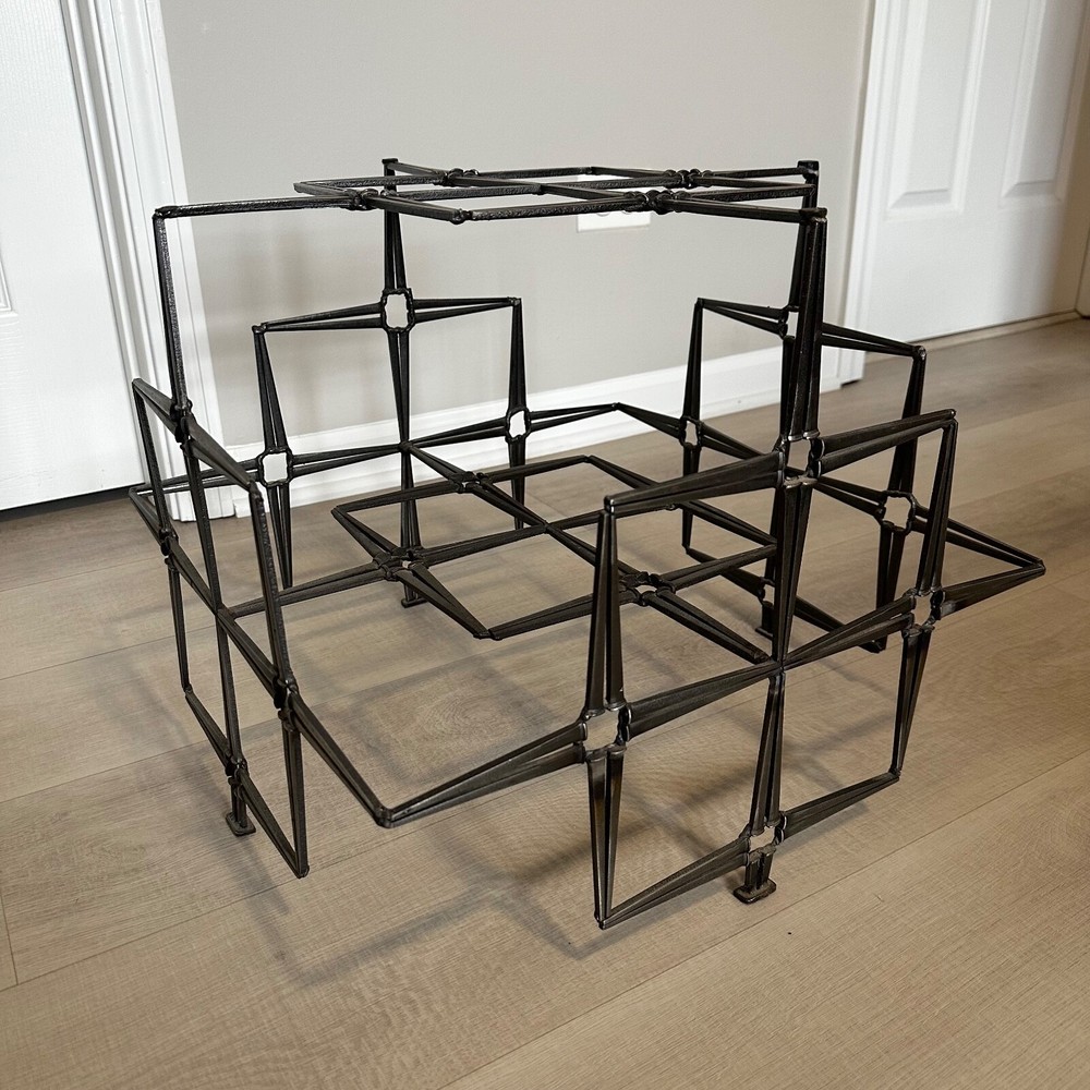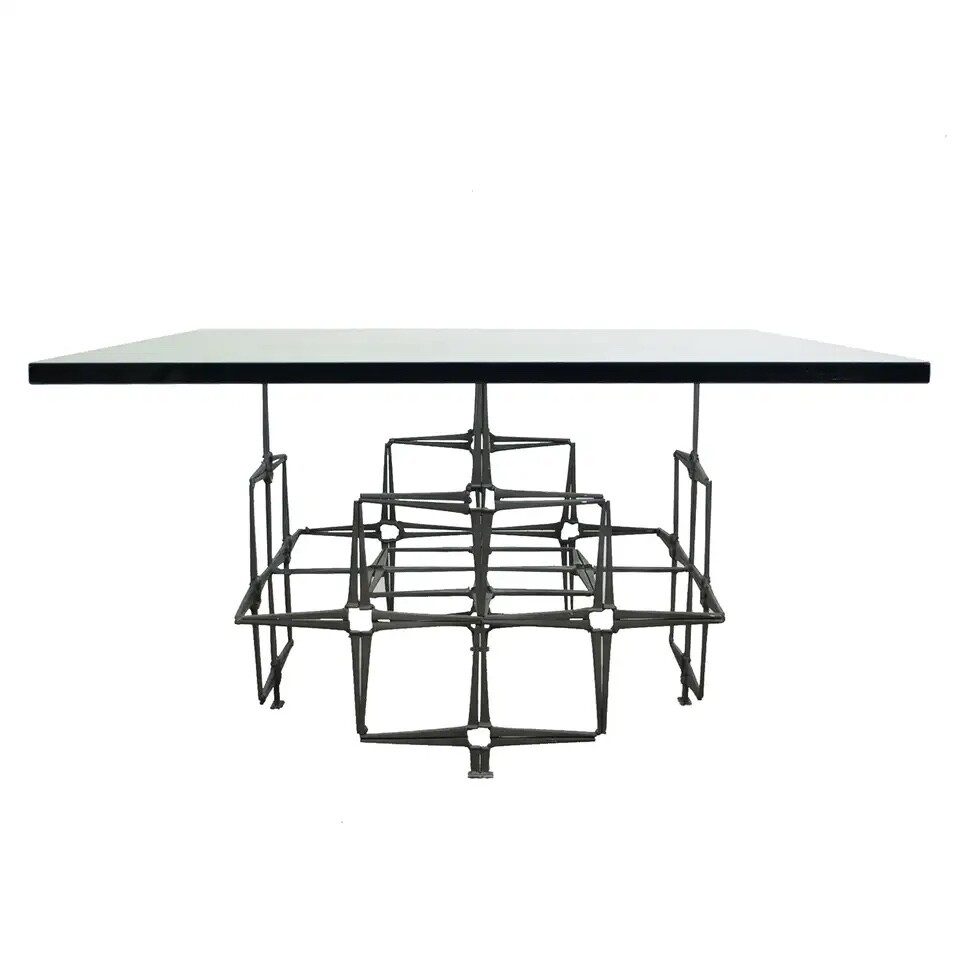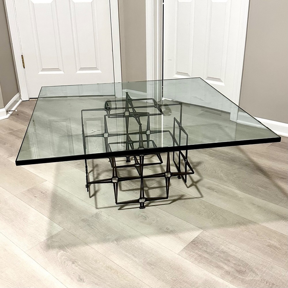 Unique vintage Tri-Mark Brutalist inspired handcrafted coffee table constructed of welded steel masonry nails and a thick square glass top in the Paul Evans style. Item features one of kind high quality construction, army green finish to the steel nails, geometric sculpted base, beautiful .75" thick square glass top and great modernist lines. Table measures 16.25" H x 29.75" W x 29.75" D. The glass is .75" thick and the base alone measures 15.5" H x 19" W x 19" D.