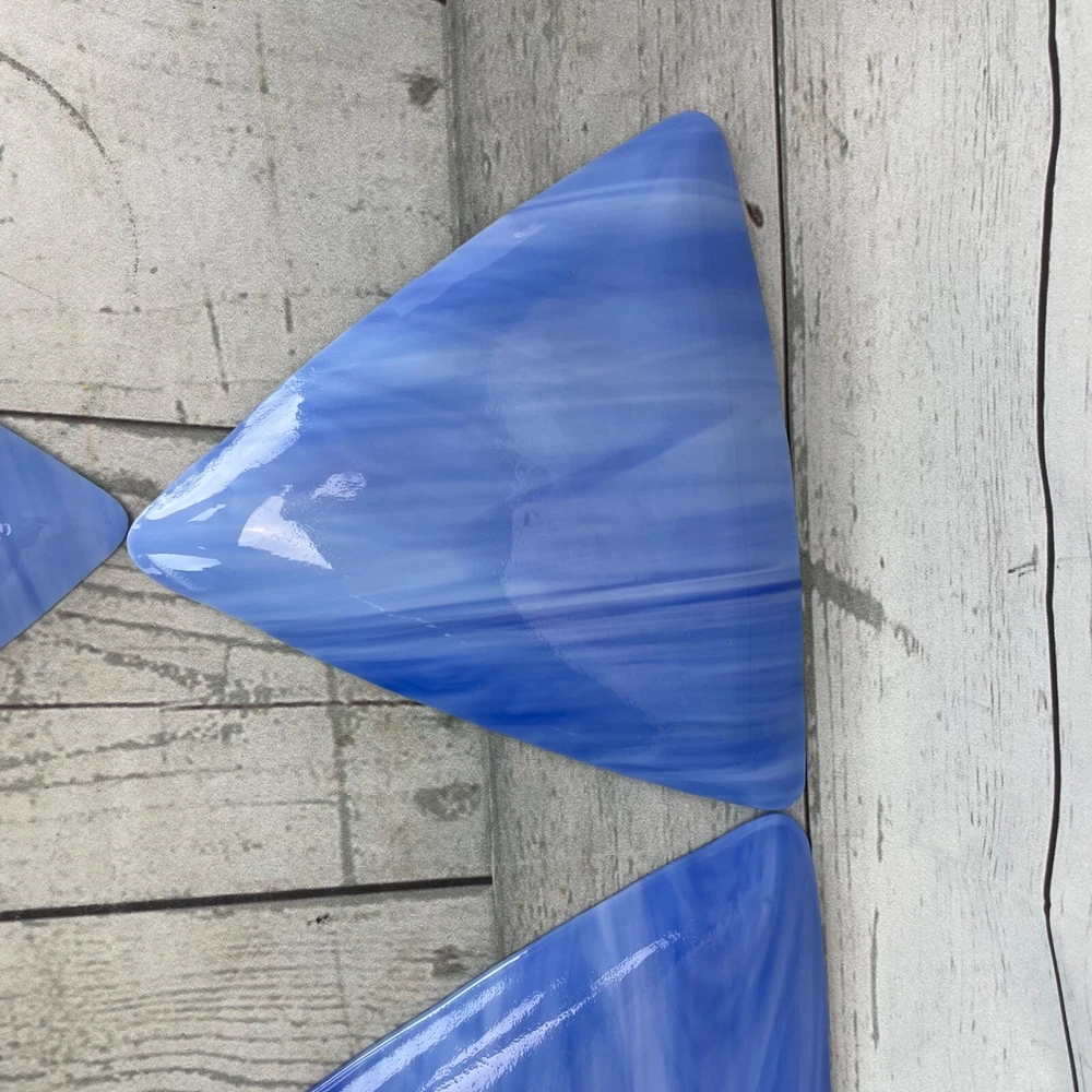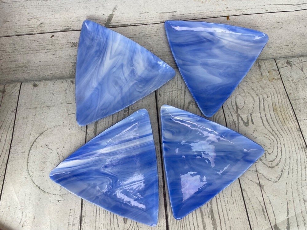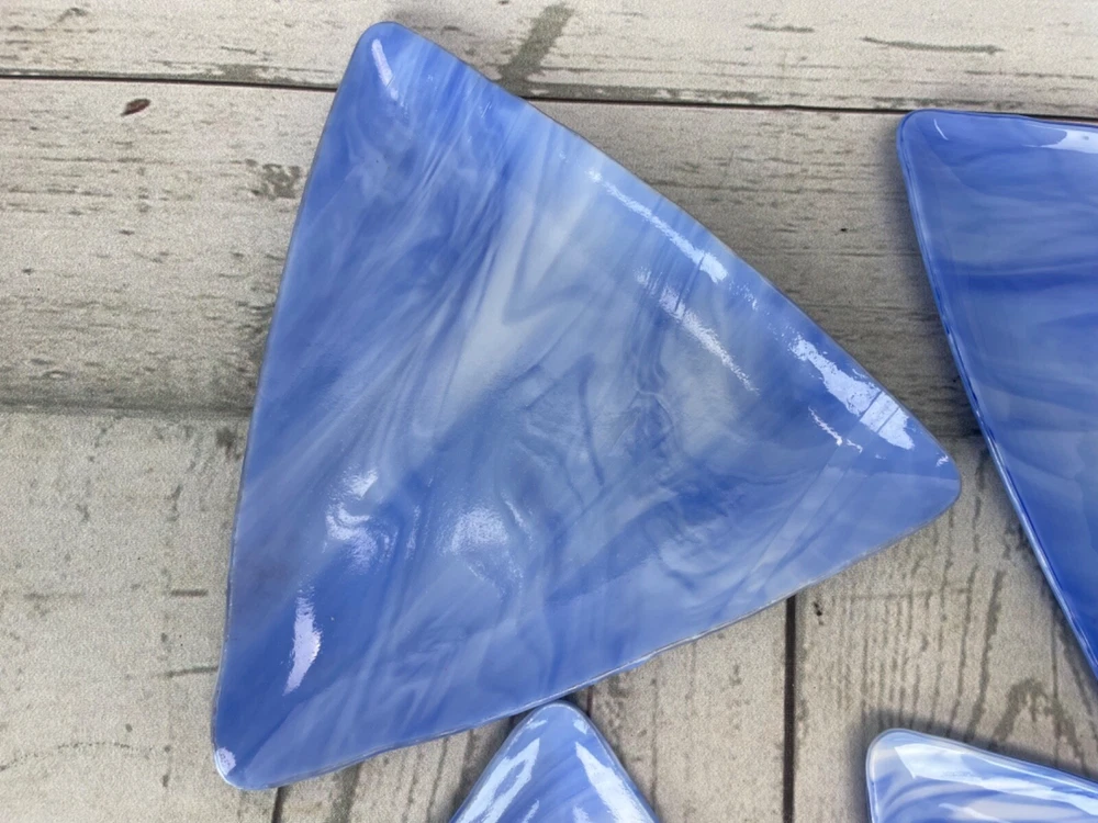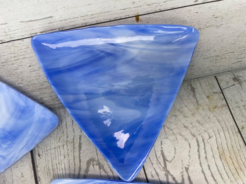 Triangle Shaped Studio Art Fused Glass Dishes 4 Plates Mid-Century Modern Approximate measurements: sides are 8in long. 1/2 in high. Condition: pre owned. No chips, cracks, or breaks. See photos....