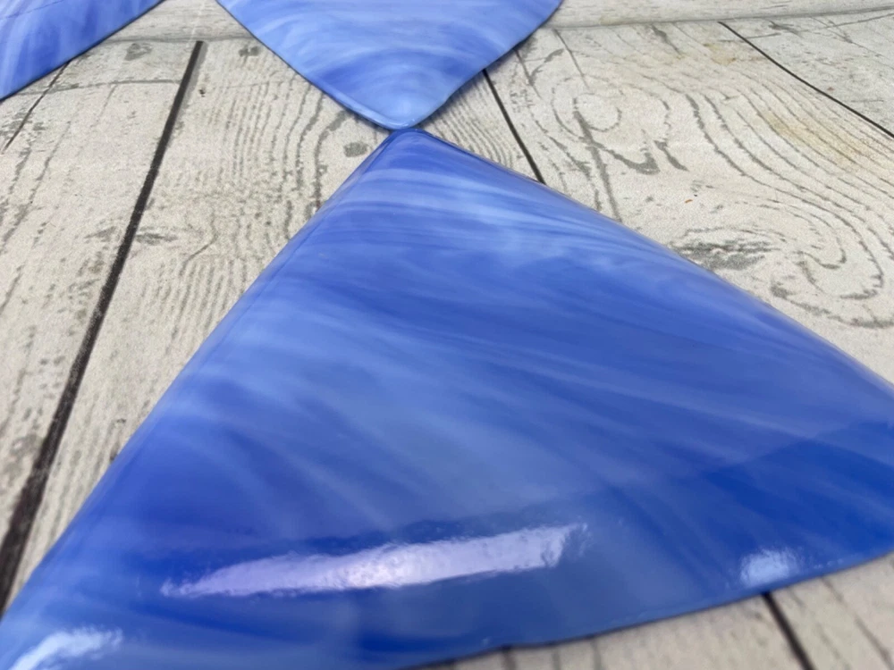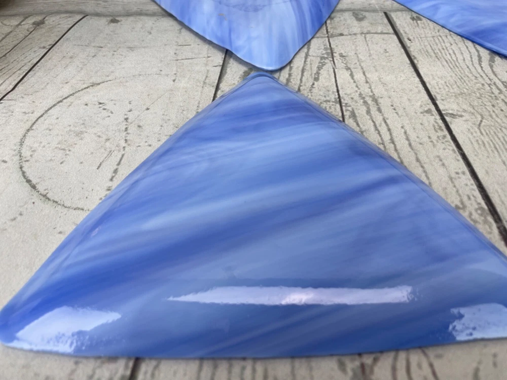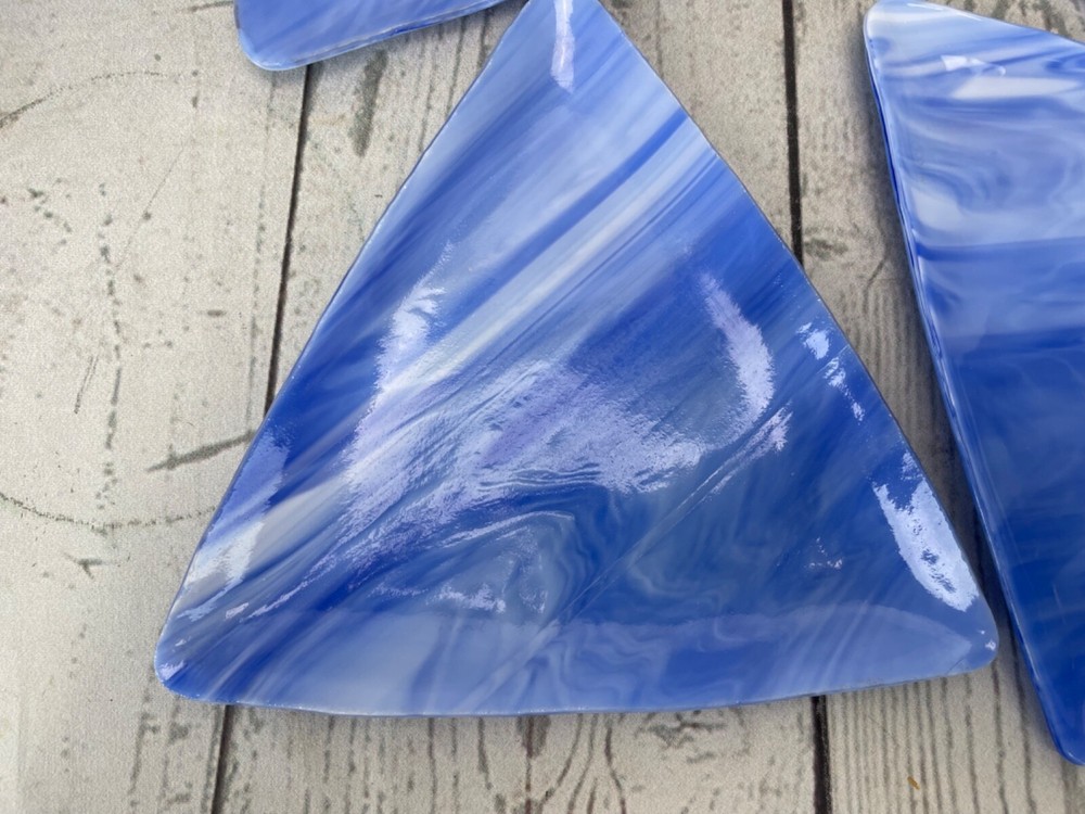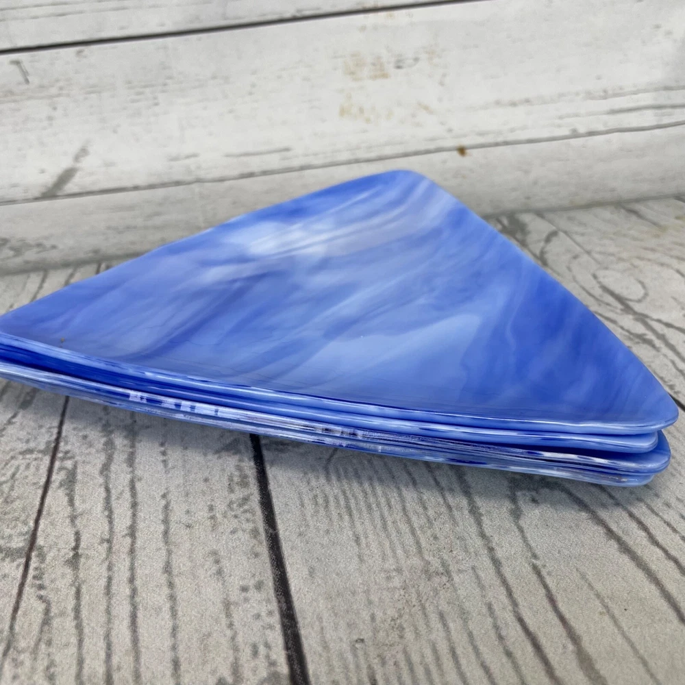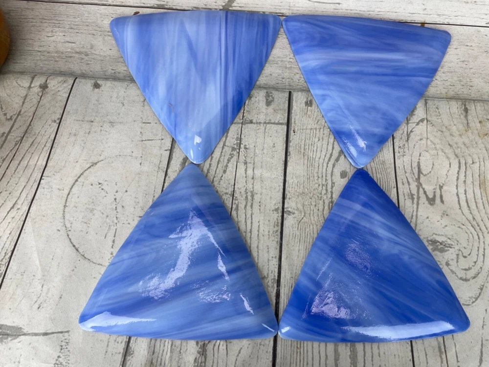 Triangle Shaped Studio Art Fused Glass Dishes 4 Plates Mid-Century Modern Approximate measurements: sides are 8in long. 1/2 in high. Condition: pre owned. No chips, cracks, or breaks. See photos....