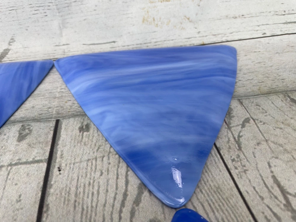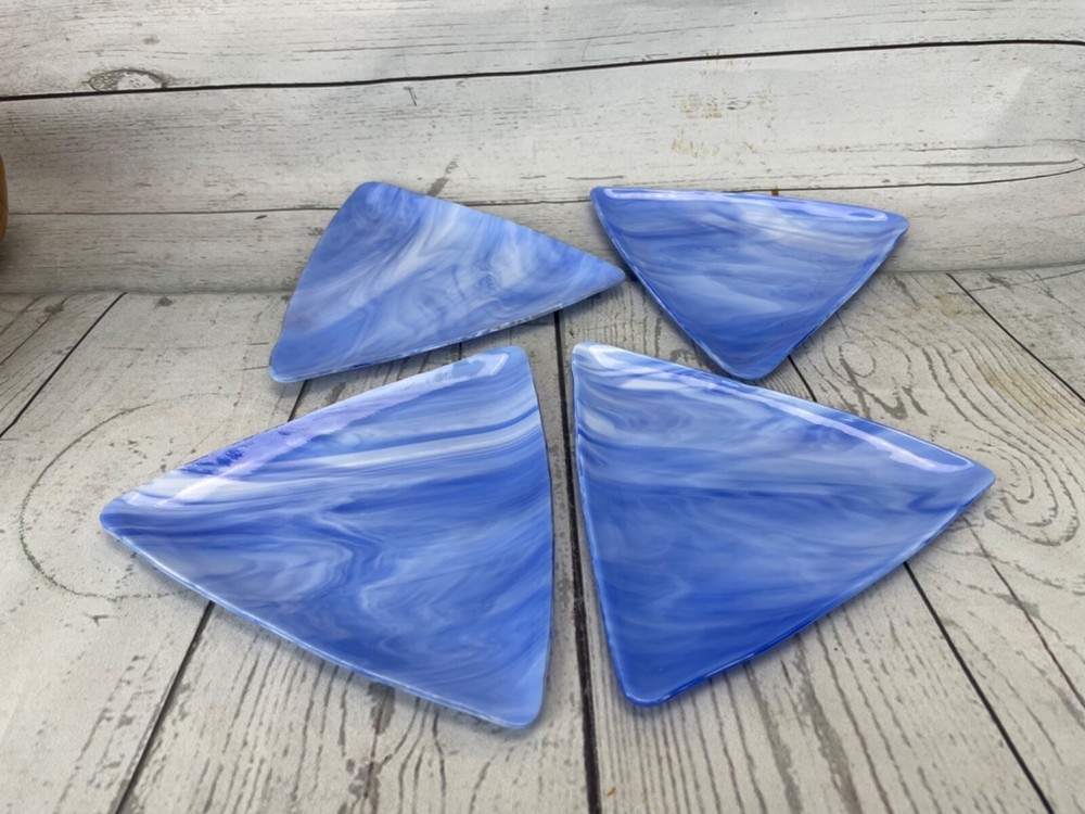Triangle Shaped Studio Art Fused Glass Dishes 4 Plates Mid-Century Modern Approximate measurements: sides are 8in long. 1/2 in high. Condition: pre owned. No chips, cracks, or breaks. See photos.