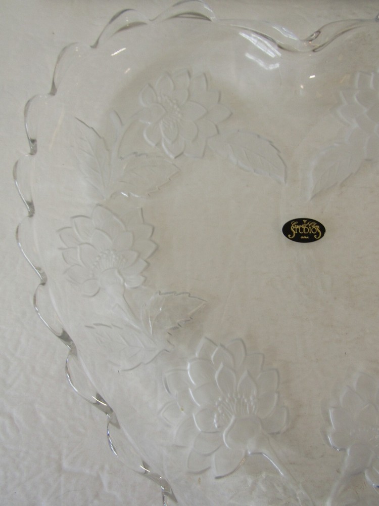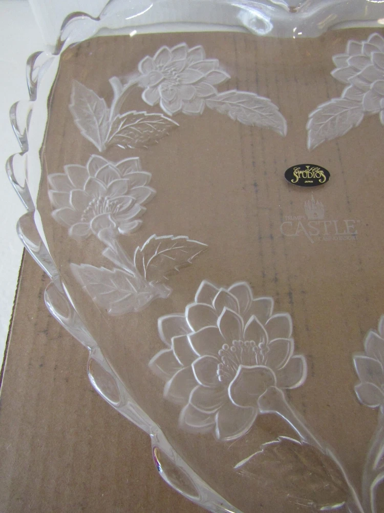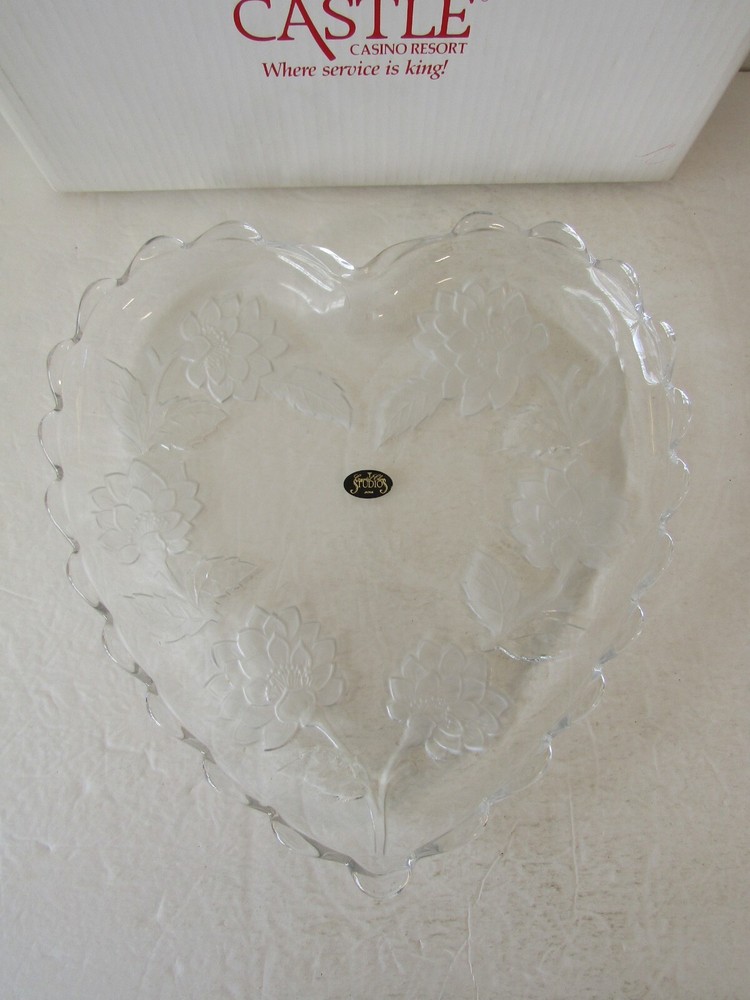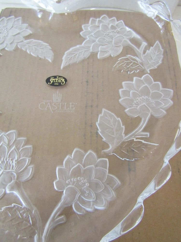 Trump's Castle Casino Resort Heart Shaped Etched Crystal Platter 12" BRAND NEW GOOD CONDITION BOX HAS SOME WEAR PLEASE SEE PHOTOS