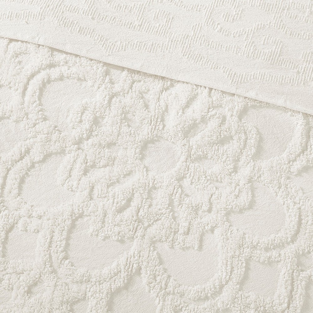 Specification Product Information Item Code:B03597524 UPC:086569030542 Product Type:Single Box Product Product Name:Tufted Cotton Chenille Medallion Fringe Coverlet Mini Set Off-White King/Cal King Place of Origin:India Main Color:Off White Main Material:Cotton Bed Size:King Product Dimensions Assembled Length (in.):Not Applicable Assembled Width (in.):Not Applicable Assembled Height (in.):Not Applicable Product Weight (lbs.):5.40 Package Size Length (in.):18.11 Width (in.):16.14 Height (in.):5.91 Weight (lbs.):8.81 Product Features Globally inspired/Shabby Chic/Boho lifestyle solid cotton chenille in large medallion pattern at the center Coverlet is 100% cotton in tufted chenille pattern, no quilting or filling Use coverlet in the summer, or layer it on as a bedspread Set includes 1 coverlet and 2 matching shams (1 in Twin/Twin XL) Oeko-Tex Certified, includes no harmful substances or chemicals (# 19.HIN.73178) Machine washable for easy care Due to the nature of the chenille fabric, some shedding will occur naturally in the first 3-4 washes Description Description The Madison Park Laetitia Tufted Cotton Chenille Medallion Fringe Coverlet Set provides an alluring shabby chic update to your bedroom. This globally inspired coverlet features a 100% cotton face and reverse with a tufted chenille medallion centered on top of the bed. A decorative fringe hem adds dimension, while 2 matching shams (1 in Twin/Twin XL) complete the boho look. Perfect for all season use, this bedding set is also OEKO-TEX certified, meaning it does not contain any harmful substances or chemicals to ensure quality comfort and wellness. Due to the nature of the chenille fabric, some shedding will occur naturally in the first 3-4 washes. Product Details King/Cal King 1 Coverlet:104"W x 92"L 2 King Shams:20"W x 36"L (2) Material Coverlet/Sham: 100% cotton chenille face and cotton reverse