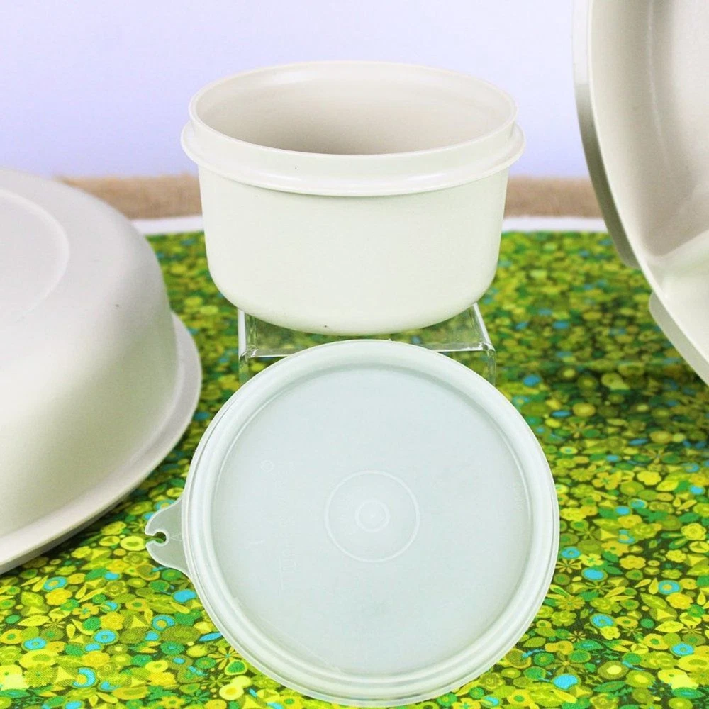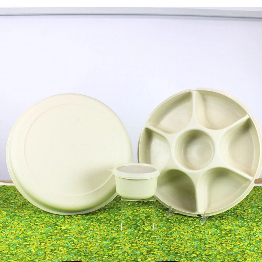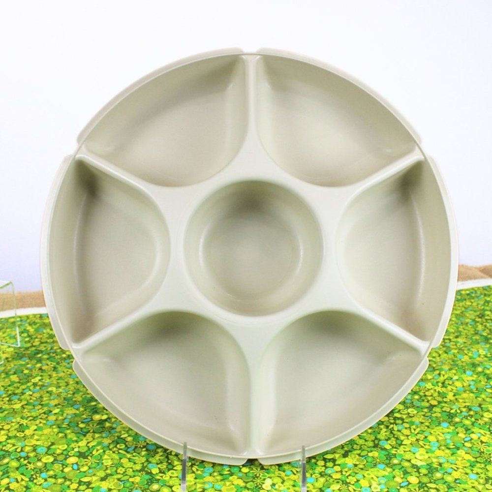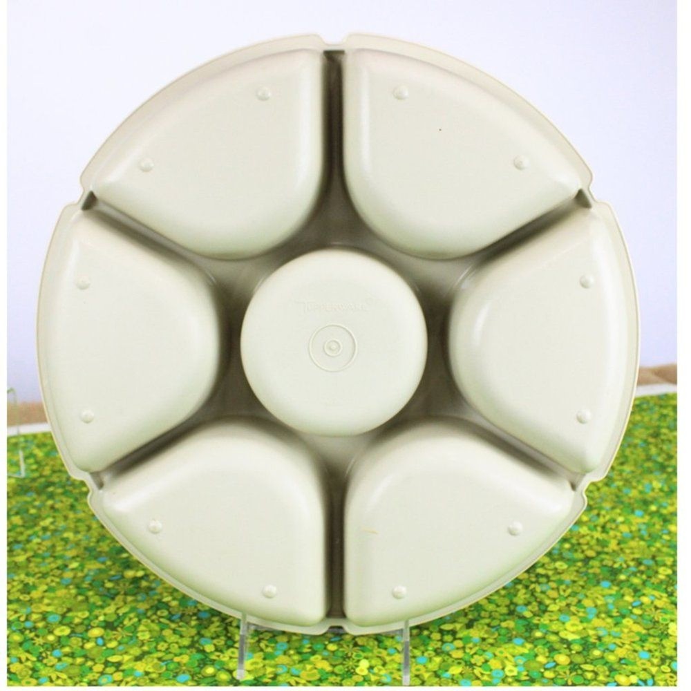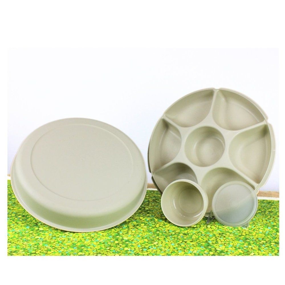 Vintage Tupperware 13” Divided Veggie Fruit Dip Snack Party Tray 1665 Lid 1666 Bowl 1697 Features six 2-cup/500 mL compartments and one 14-oz./400mL center bowl compartment 13½ x 3¾"/34 x 9.5 cm The divided serving tray is a true Tupperware party favorite! The domed cover doubles as a serving tray or keeps foods chilled when filled with ice. The unique design of their all-in-one 6-compartment serving tray helps separate and organize • taco fillings • ice cream toppings • vegetables with dip • snacks with dips • chips and dips • condiments for cookouts • and more The divided serving tray is ideal for indoor and outdoor use and entertaining. Excellent Pre-Owned Condition Made in the USA HLS-0533-EZZ-YD-0124-22(1/9.7)