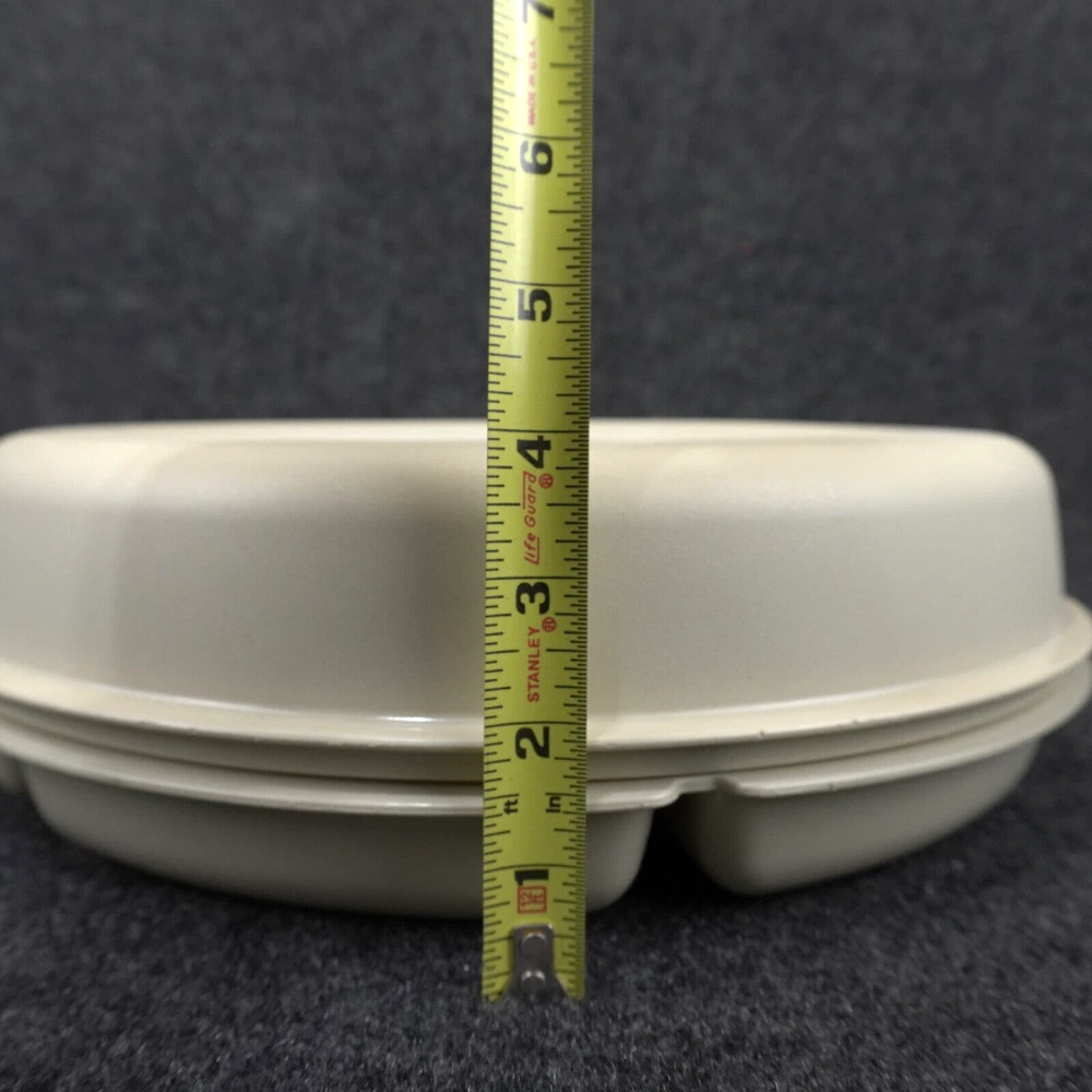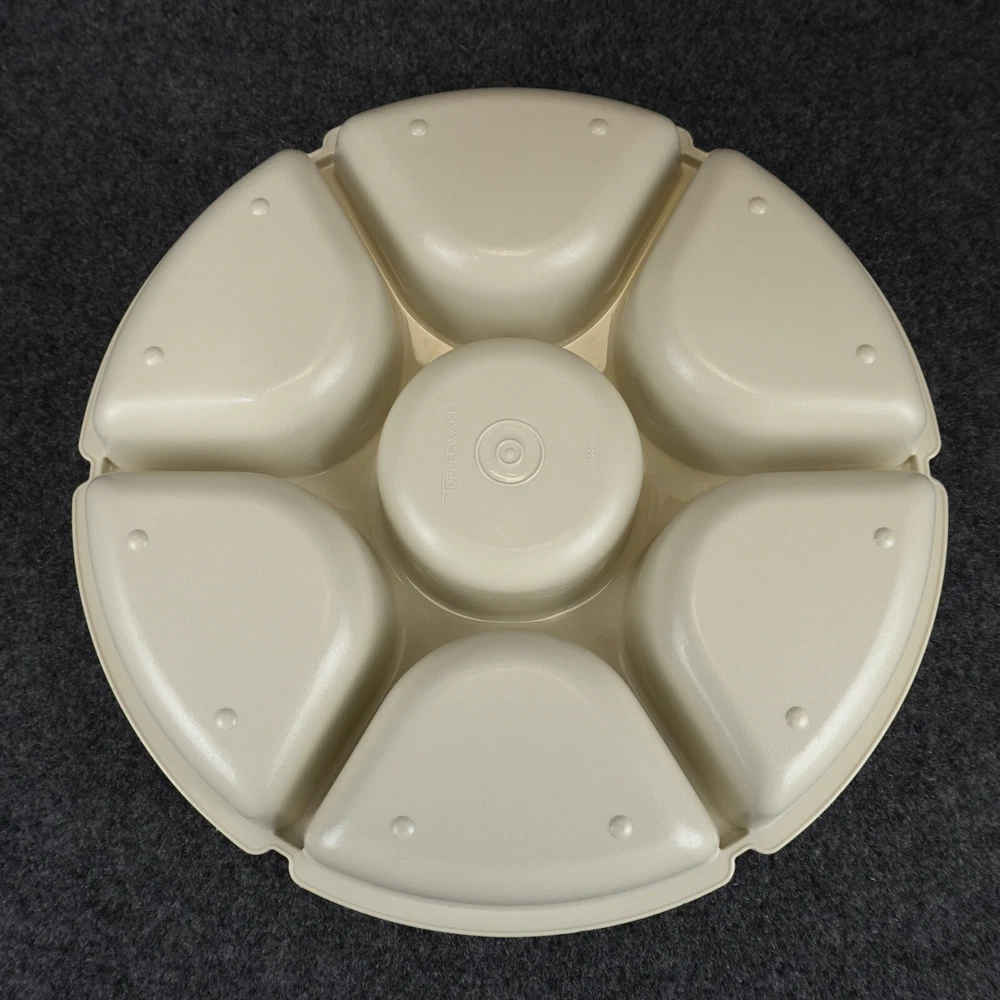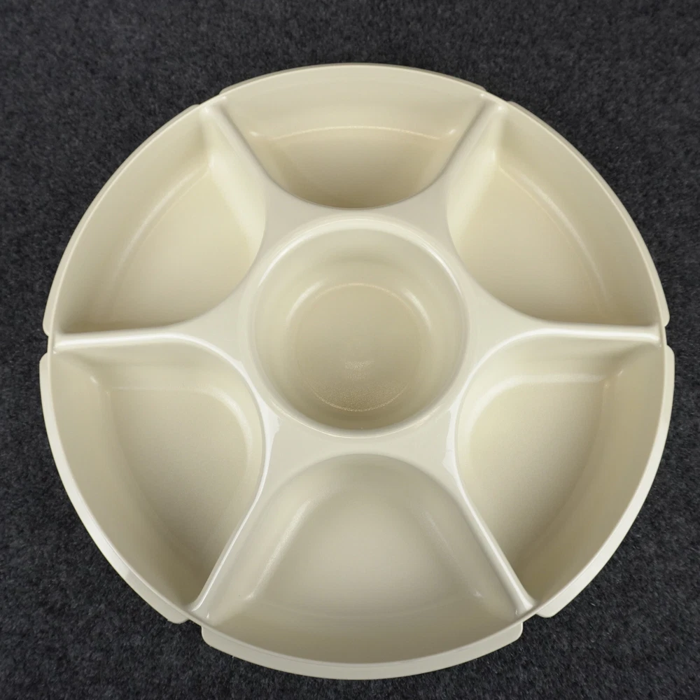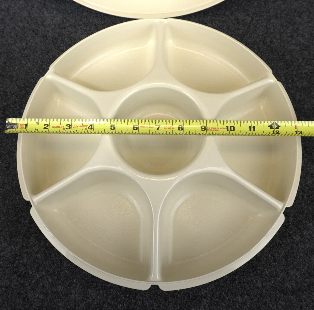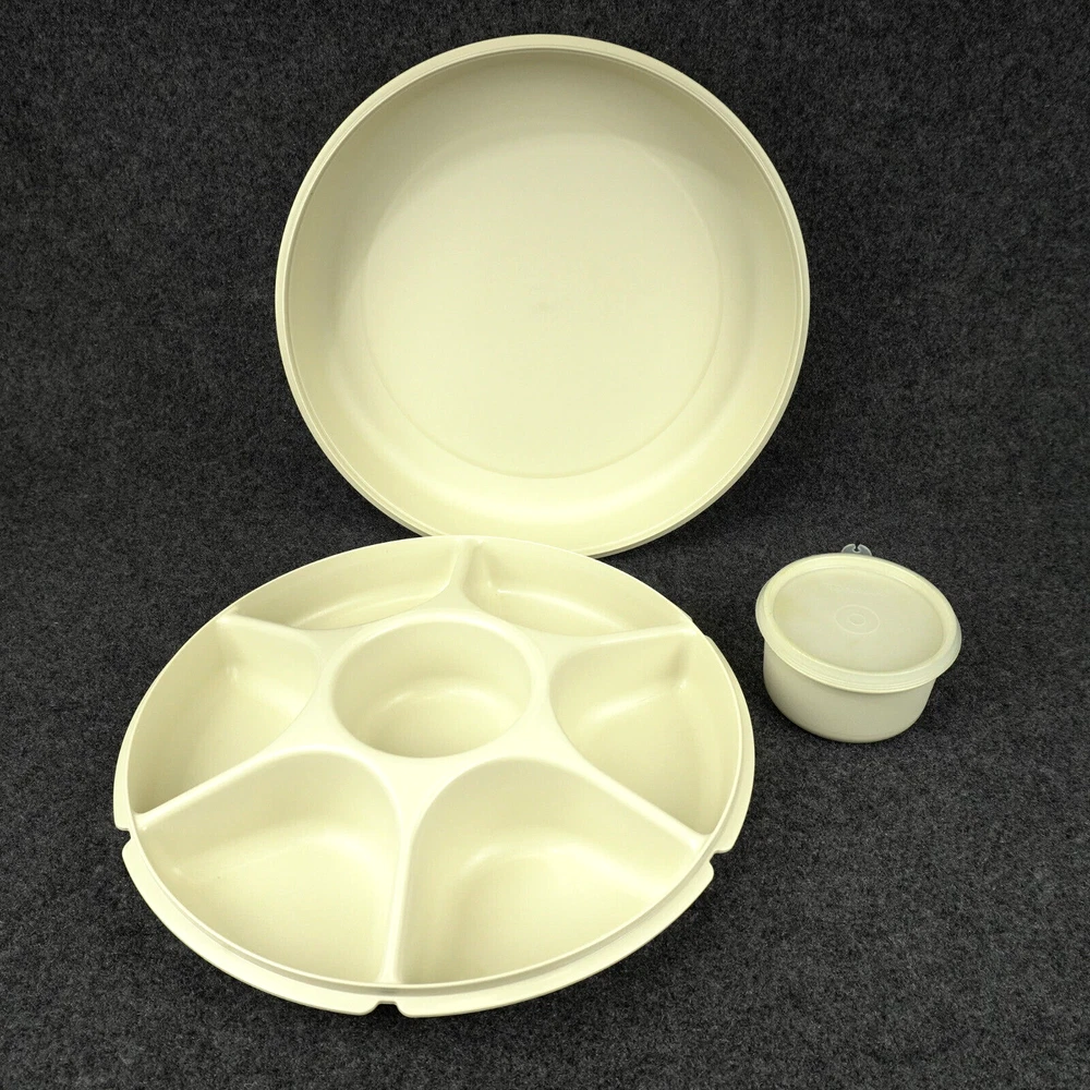 This vintage Tupperware #1665 serving tray set is perfect for entertaining guests or enjoying snacks with your family. The set includes a large round tray with 7 compartments, a veggie dip bowl, base tray, and lid. The solid pattern and almond color give it a retro feel that will enhance the look of any kitchen. The Tupperware #1665 serving tray set is made of durable plastic and features push-on lids for easy storage. It is easy to clean and has a number of features, including a large size of 13.75 inches in length and width, 3.875 inches in height, and 7 slots for different items. This tray set is perfect for adults and comes with a holiday and veggie character theme that will make your snacks look even more inviting. Ships USPS Ground Advantage (Ship in United States 2 to 5 Business Days)