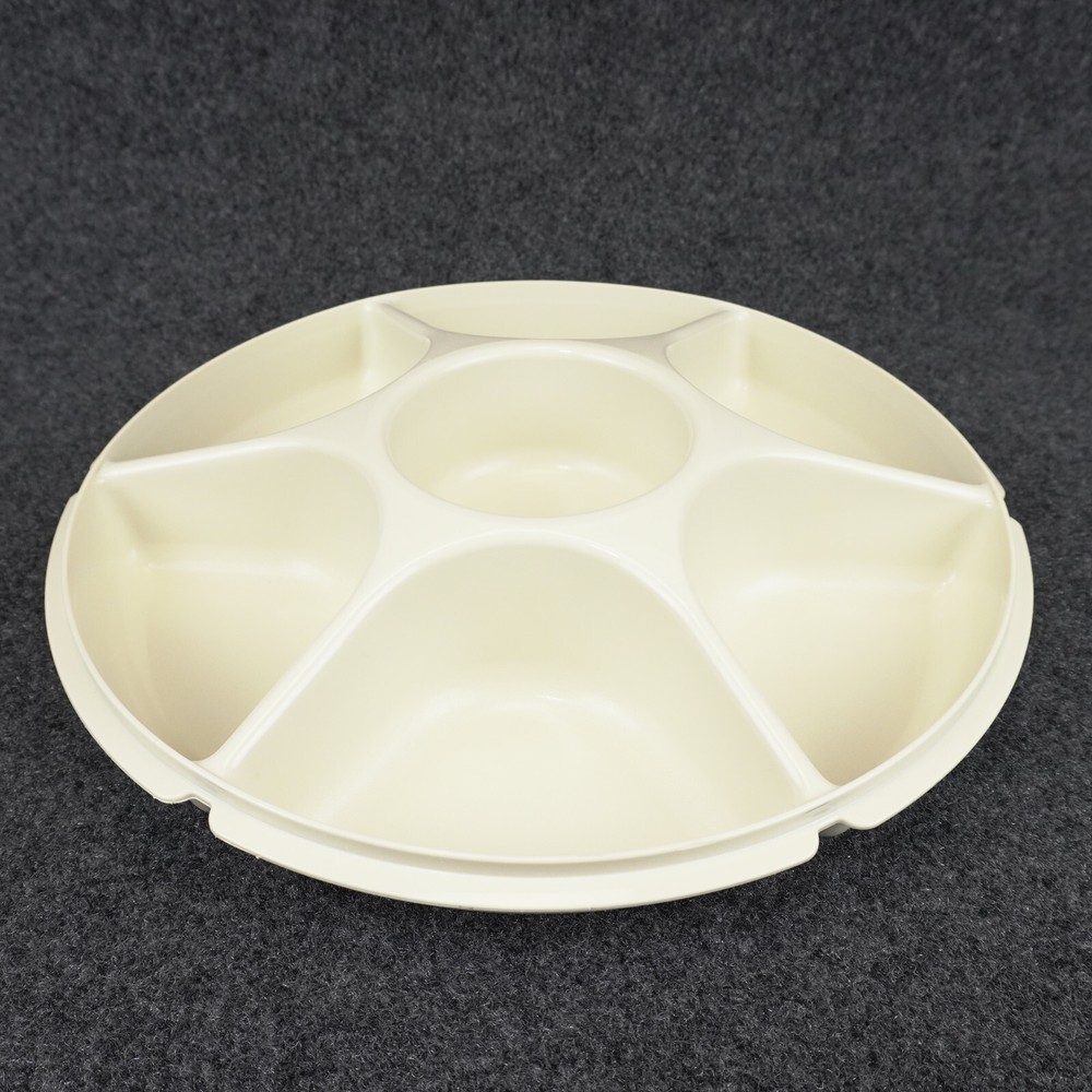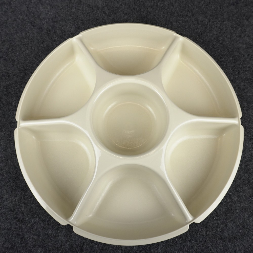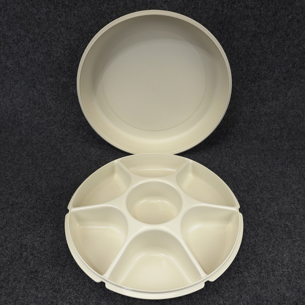 This vintage Tupperware tray is perfect for serving snacks and appetizers at your next gathering. With 7 compartments and a push-on lid, it's easy to keep your veggies, dips, and other treats organized and fresh. The almond-colored base and lid are in great shape and make a stylish addition to any kitchen or party table. This original Tupperware piece measures 13.75 inches in length and width and 3.875 inches in height, with a solid pattern and a fun veggie character design. The tray is made of easy-to-clean plastic and is perfect for adults who appreciate retro and vintage styles. Whether you're hosting a party or just looking for a convenient way to store and serve your favorite snacks, this Tupperware tray is a must-have. It is missing the veggie dip bowl #1667. Will Ship USPS Ground Advantage (Ship in United States 2 to 5 Business Days) Item has been washed/cleaned.