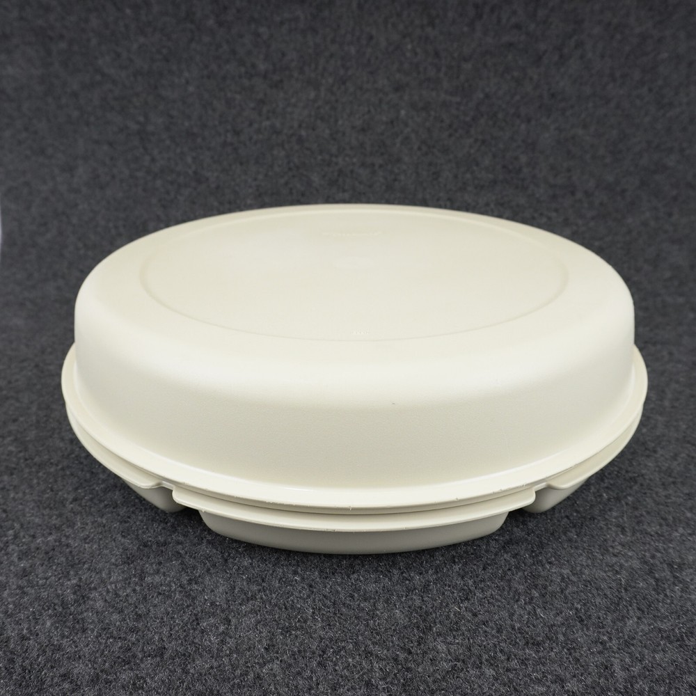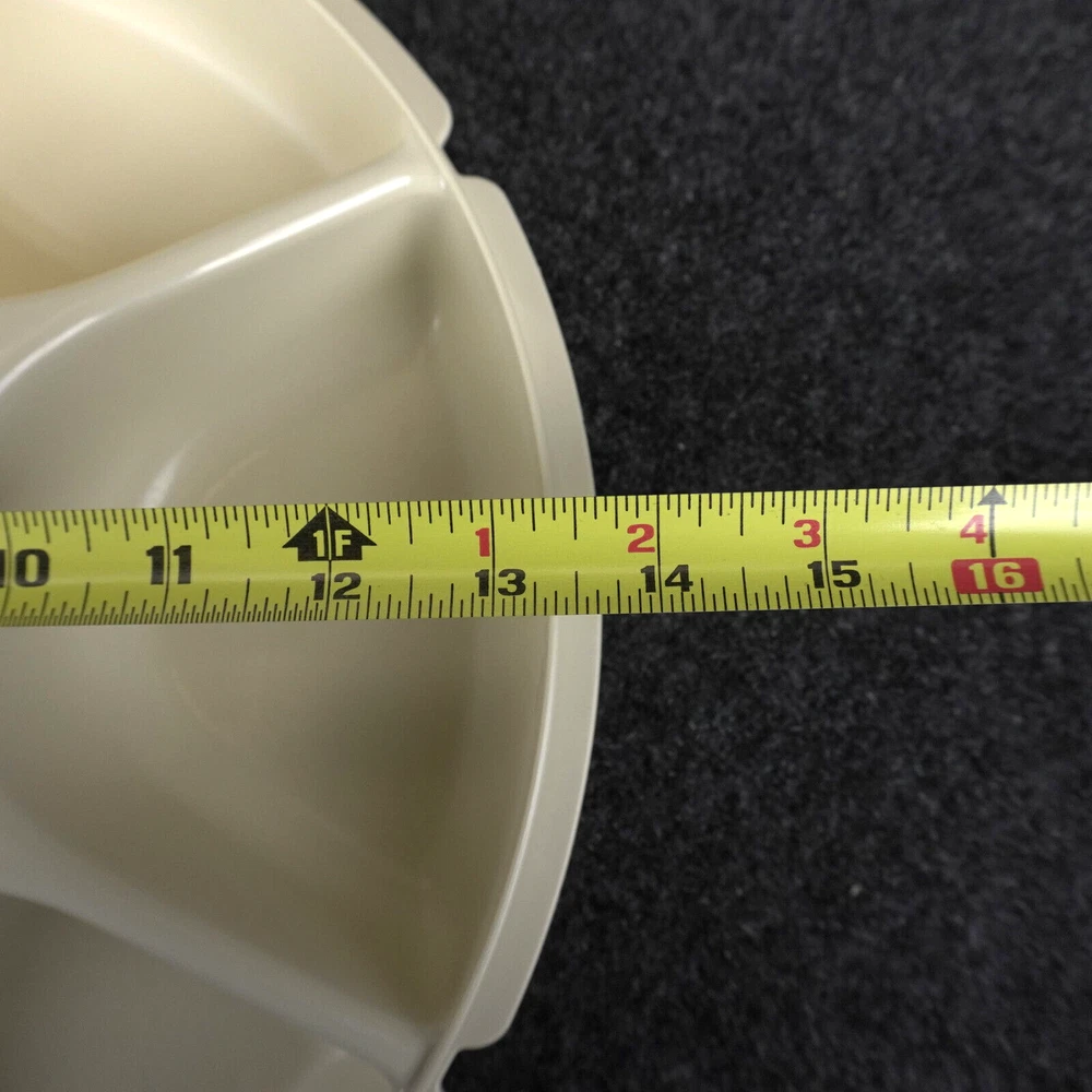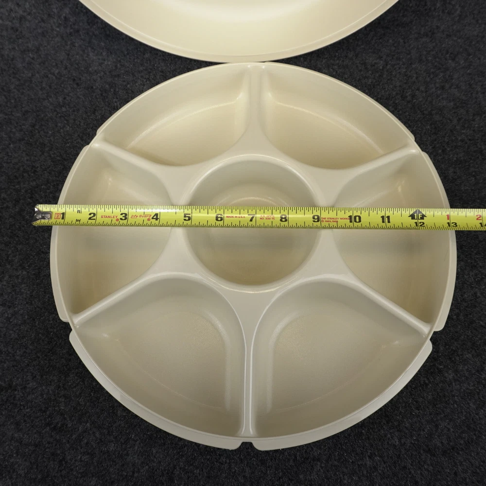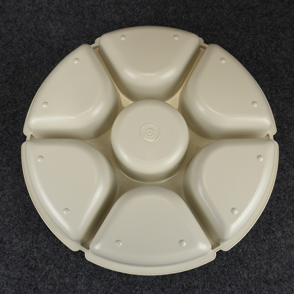 This vintage Tupperware tray is perfect for serving snacks and appetizers at your next gathering. With 7 compartments and a push-on lid, it's easy to keep your veggies, dips, and other treats organized and fresh. The almond-colored base and lid are in great shape and make a stylish addition to any kitchen or party table. This original Tupperware piece measures 13.75 inches in length and width and 3.875 inches in height, with a solid pattern and a fun veggie character design. The tray is made of easy-to-clean plastic and is perfect for adults who appreciate retro and vintage styles. Whether you're hosting a party or just looking for a convenient way to store and serve your favorite snacks, this Tupperware tray is a must-have. It is missing the veggie dip bowl #1667. Will Ship USPS Ground Advantage (Ship in United States 2 to 5 Business Days) Item has been washed/cleaned.