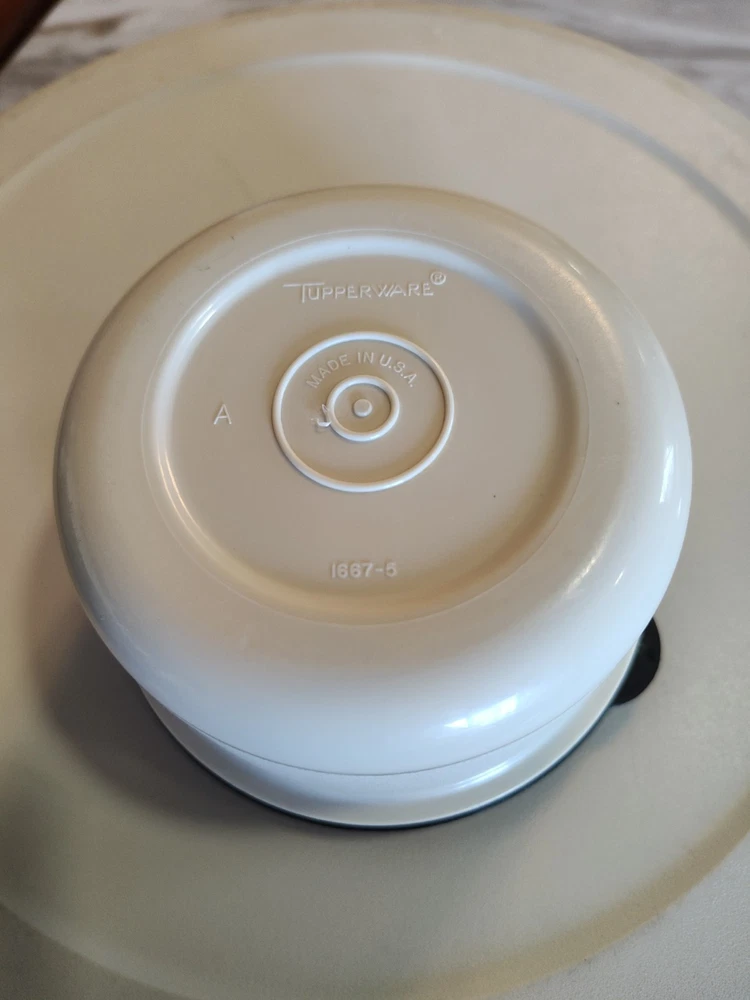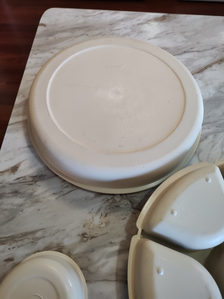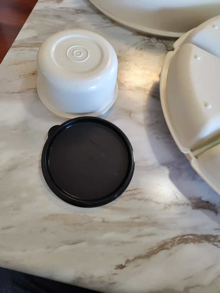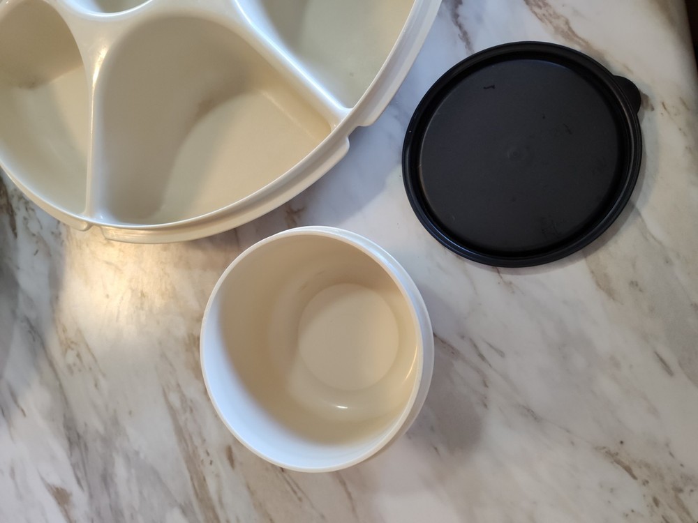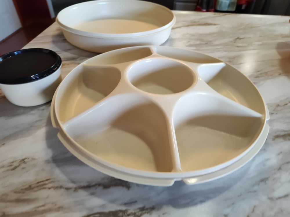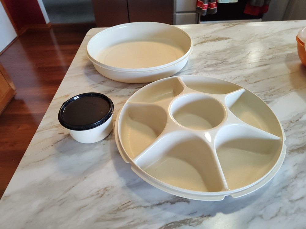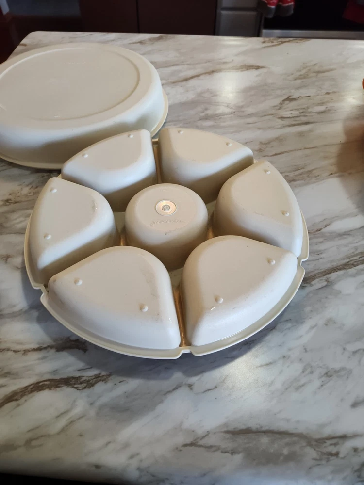 This Tupperware 1665-1 Divided Serving Tray Container is a must-have for any kitchen. With a pop-off lid and 7 compartments, it's perfect for storing vegetables, fruits, taco toppings and other snacks. The tray is made of high-quality materials and has a vintage look that adds charm to any kitchen. The round shape and large size of this tray make it perfect for serving guests at a dinner party or event. Measuring 14 inches in length and width, and standing 4 inches tall, it has seven slots for storing different types of snacks. This original Tupperware tray is an excellent addition to any kitchen and will make serving snacks, tacos and other treats a breeze. See photos as part of description. Thanks for stopping in and have fun shopping