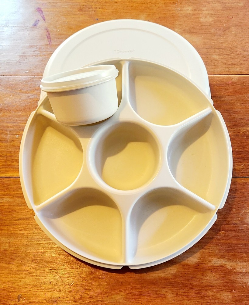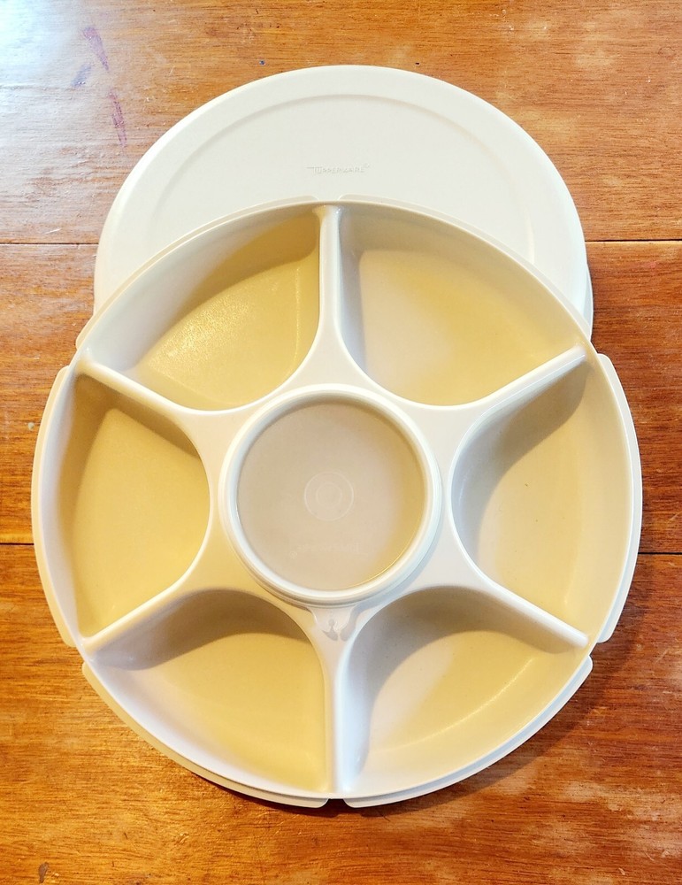 Tupperware 1666-1 6 Compartment Party Tray With Lidded Dip Container In excellent condition. Great for parties and potlucks. View all photos closely Sold as is...