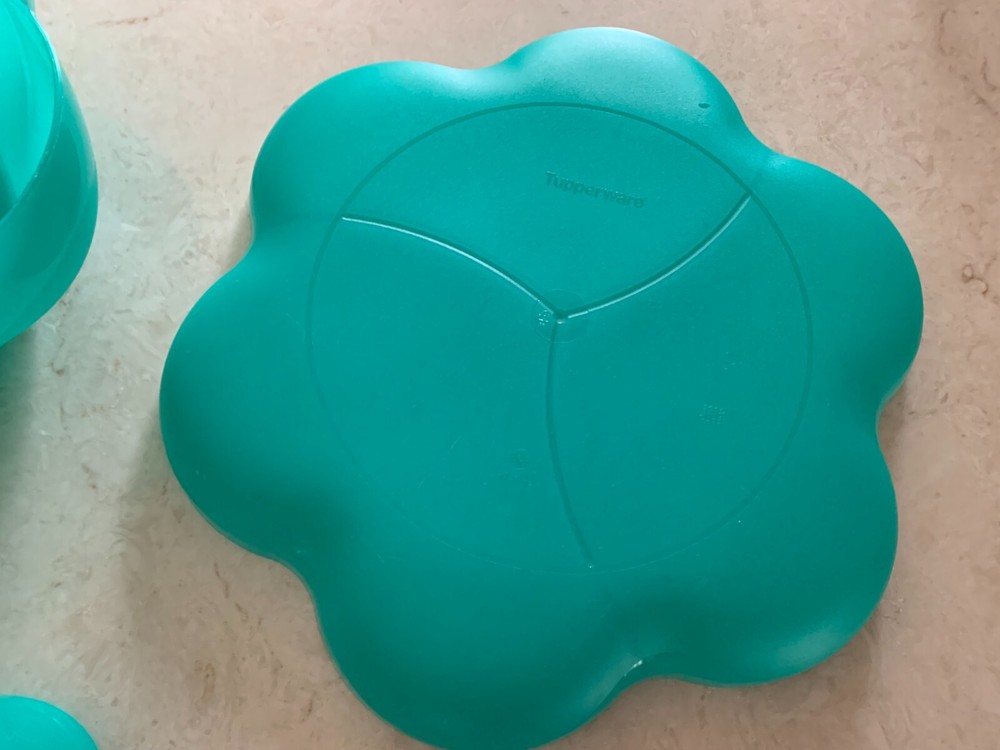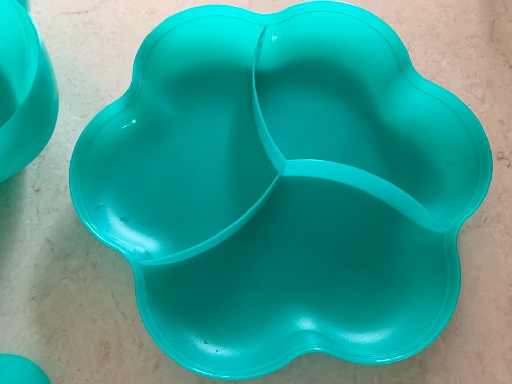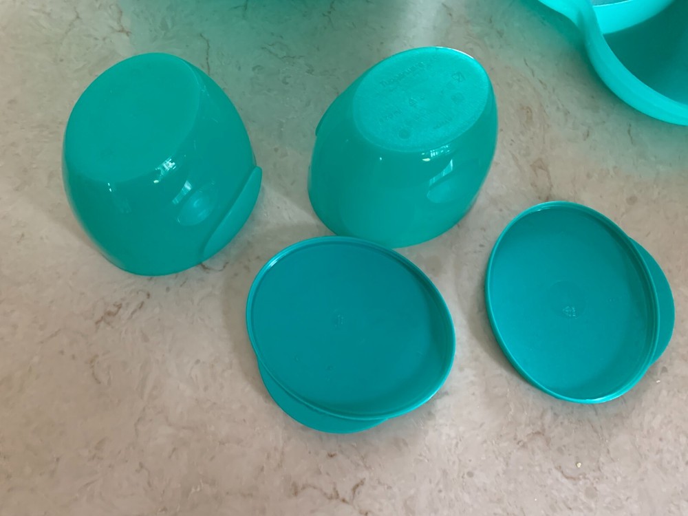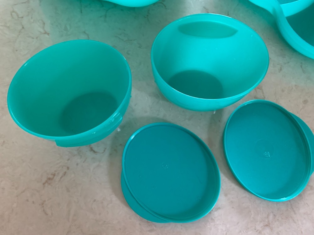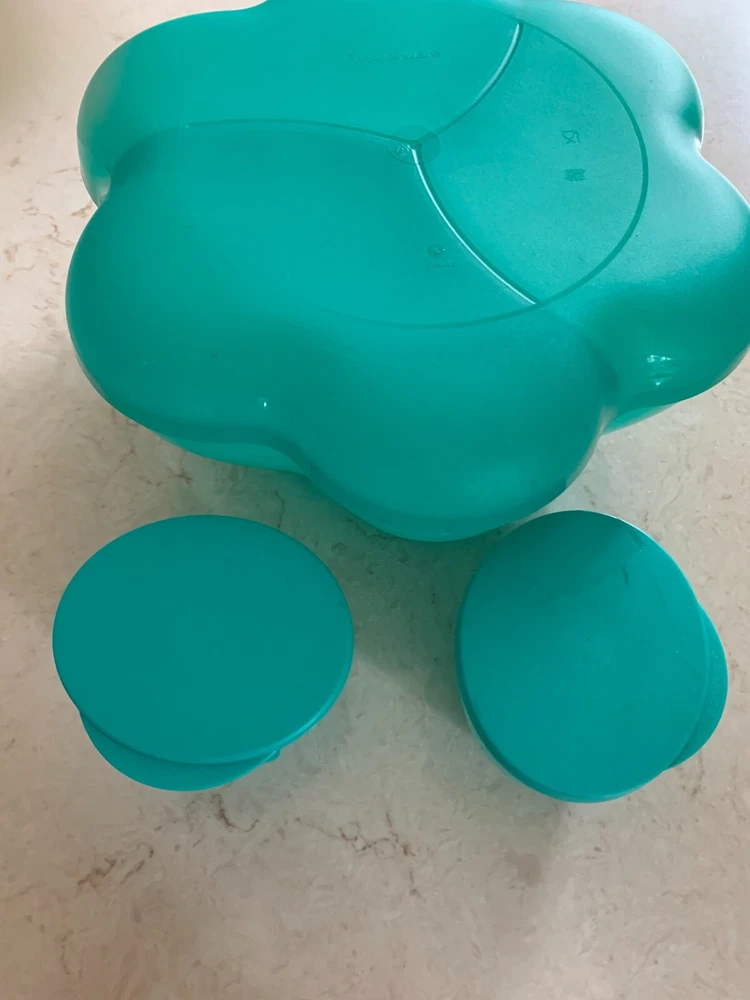 Tupperware Chip & Dip Bowl Set - Lot of 3 Containers with 3 Seals Condition: PreOwned Excellent condition Color: Spring Green Large Measures: 6" x 13" x 13" Very versatile piece. 5.6 liter bowl. Divided lid that can be used as a tray for veggies or cheese and sausage. 2 bowls with snap on lids that can be hung on side of large bowl or used separately. Please see pictures as they are part of the description