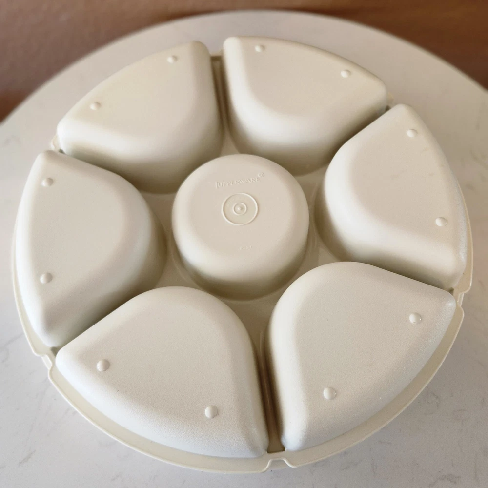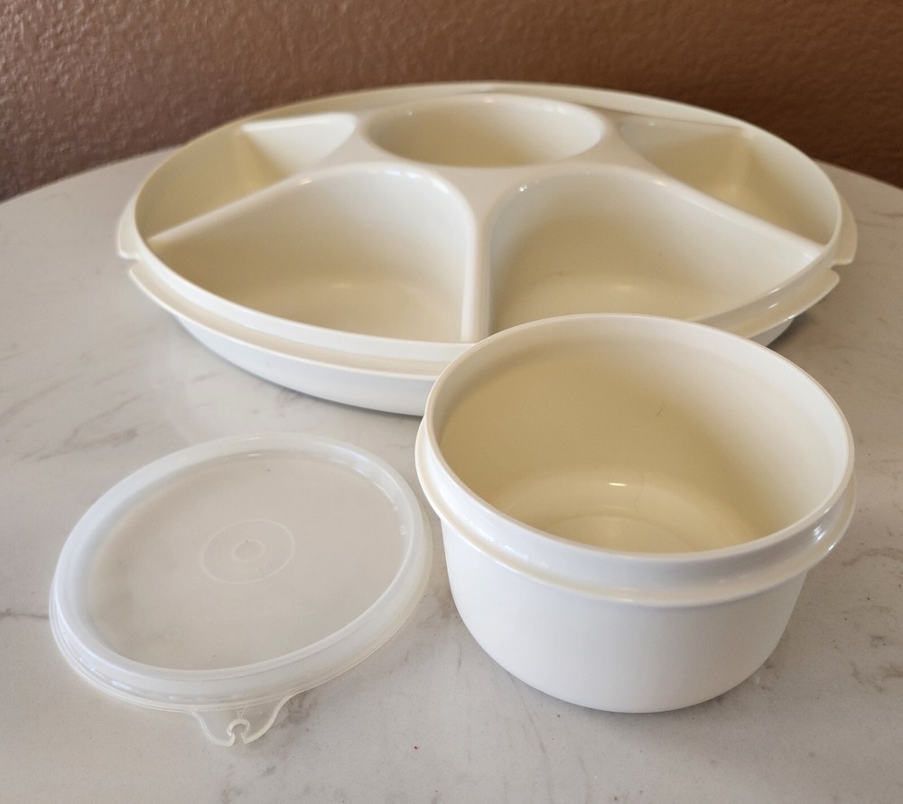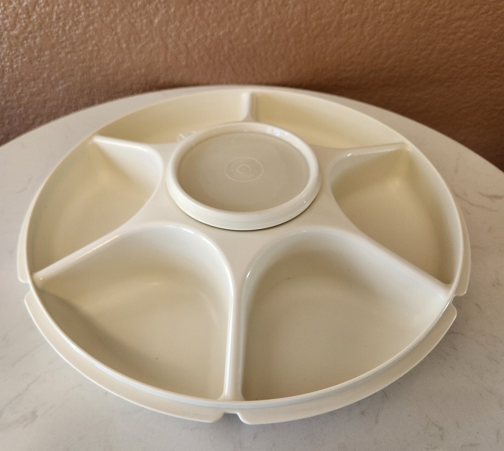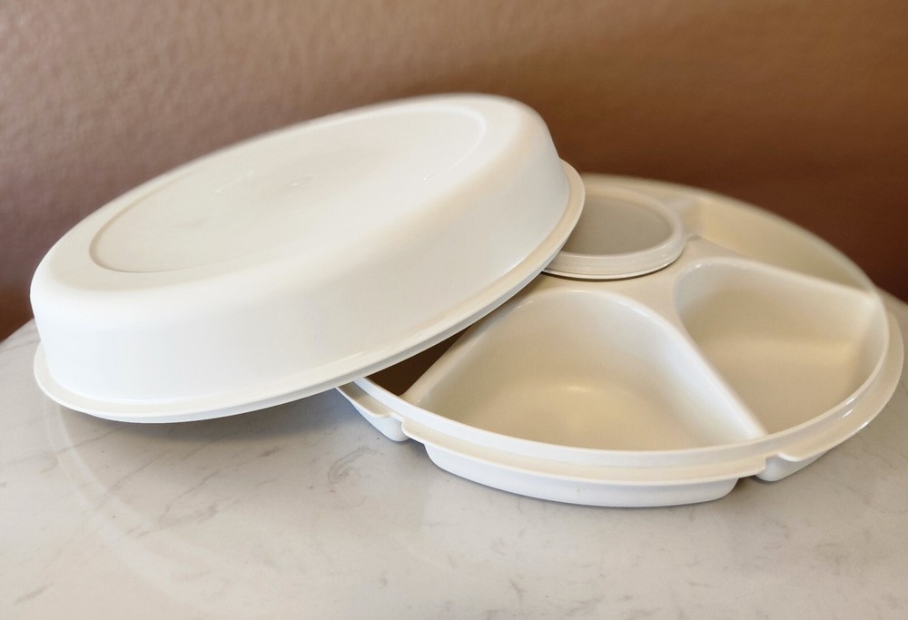 This vintage Tupperware 4-piece tray set is perfect for serving fruits and veggies at your next gathering. The set includes a large round tray with 7 slots, a lid, and a center lidded dip bowl, all in a classic almond color. Made from durable plastic, this original Tupperware set is a must-have for any kitchen or collector. This set is special as it includes the center dip bowl (#1667-11). See others listed and you will rarely, if ever, see this included! I'm not a Tupperware expert, am listing it for a friend. Please see my ebay store for additional Tupperware pieces.