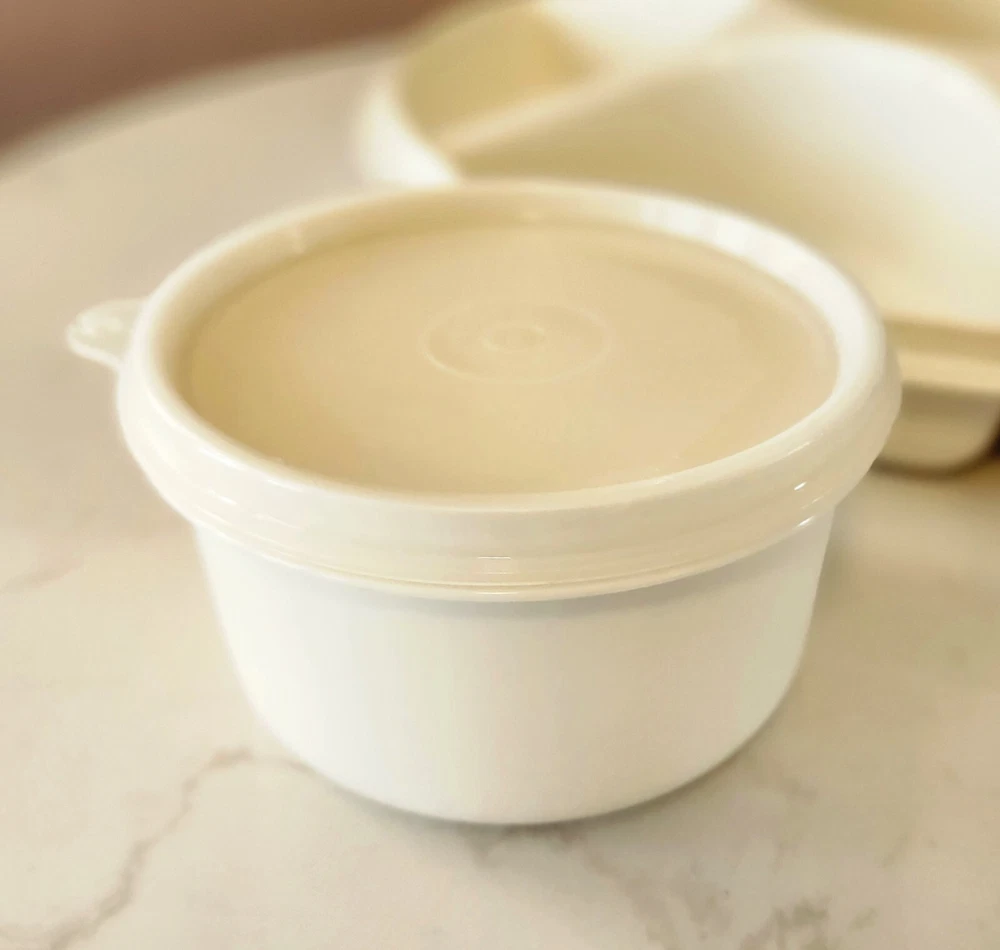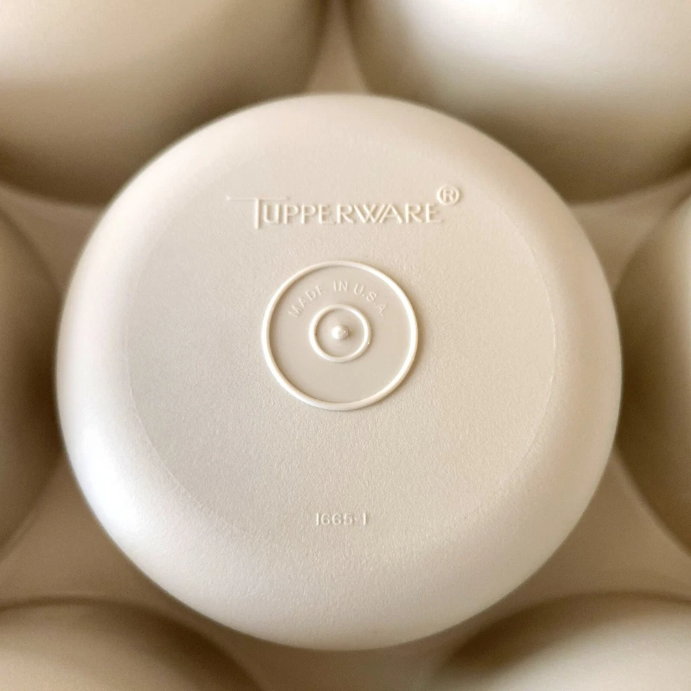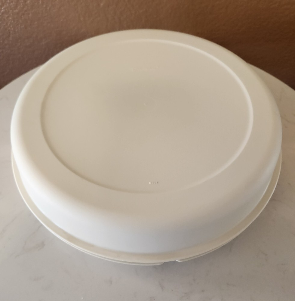 This vintage Tupperware 4-piece tray set is perfect for serving fruits and veggies at your next gathering. The set includes a large round tray with 7 slots, a lid, and a center lidded dip bowl, all in a classic almond color. Made from durable plastic, this original Tupperware set is a must-have for any kitchen or collector. This set is special as it includes the center dip bowl (#1667-11). See others listed and you will rarely, if ever, see this included! I'm not a Tupperware expert, am listing it for a friend. Please see my ebay store for additional Tupperware pieces.