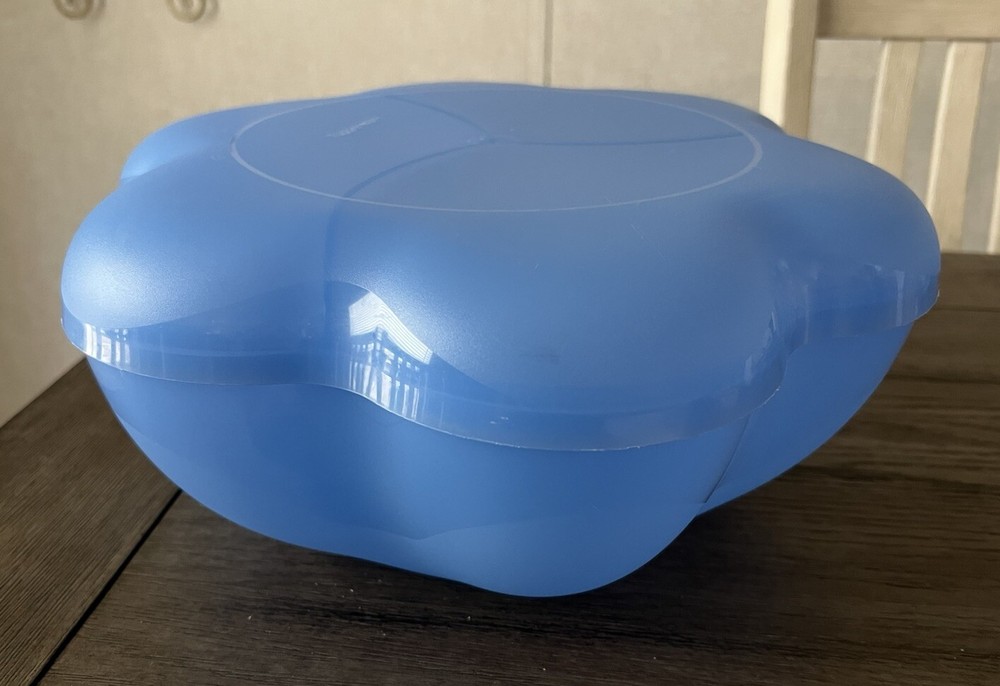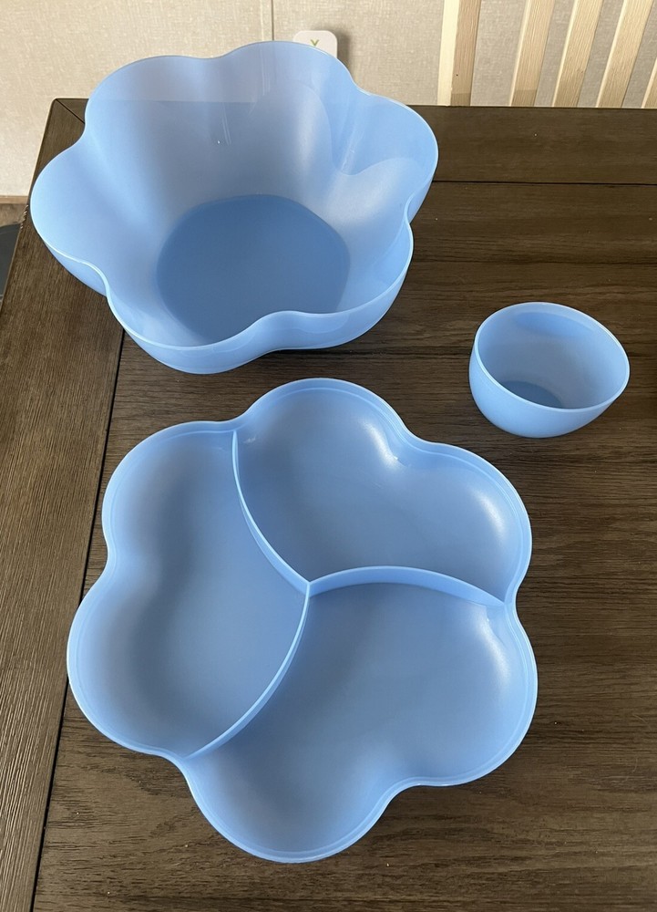 💙This Tupperware Blue Chip n Dip Server #4624 includes a scalloped round serving tray with a divided lid, a dip bowl without a lid, and is suitable for storing 1.5 gallons. It is designed for fun and easy serving, featuring a press-on lid, reusable material, and is easy to clean. The set is perfect for hosting and is an original piece from the Tupperware franchise.💙 Sold as is. See pictures for details. Thank you for shopping with ✨jcfindsco!✨