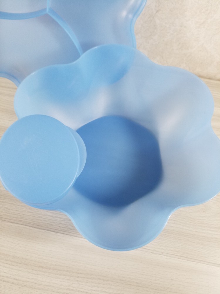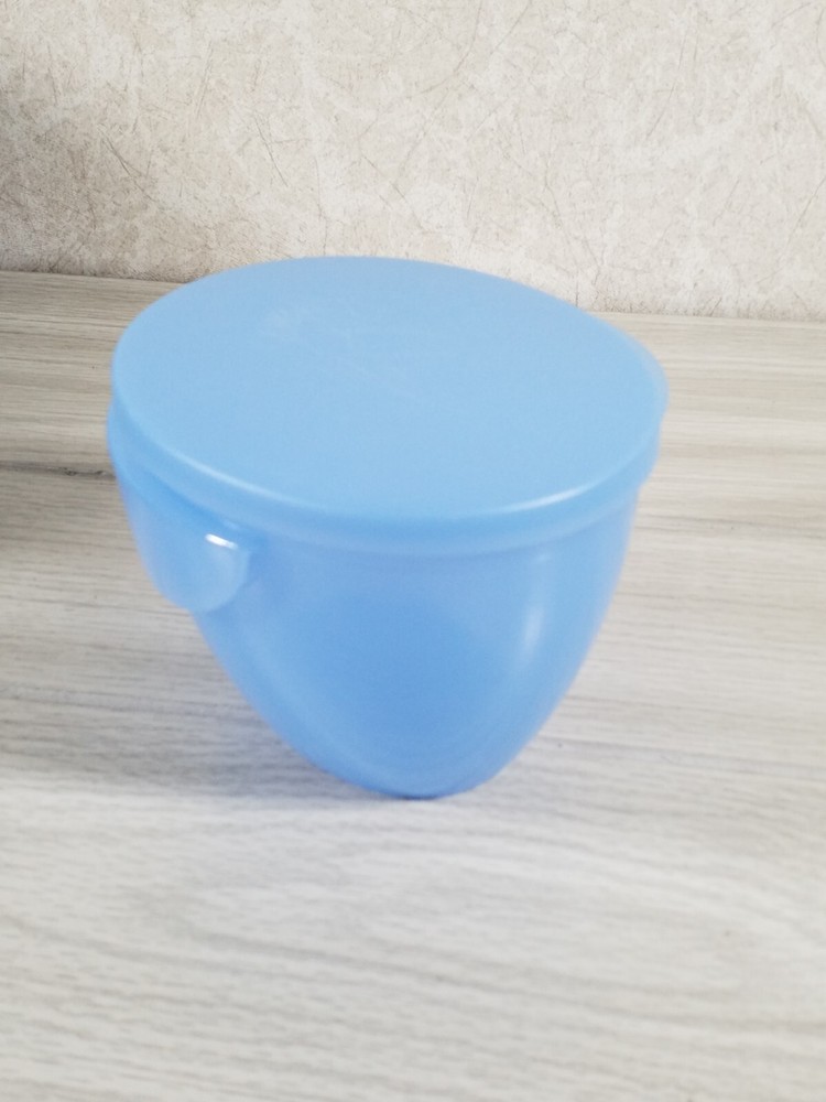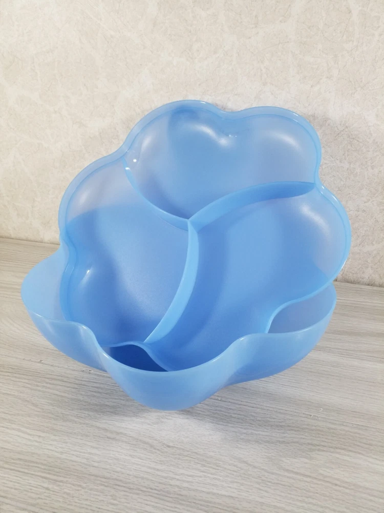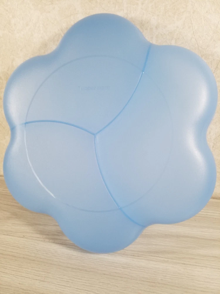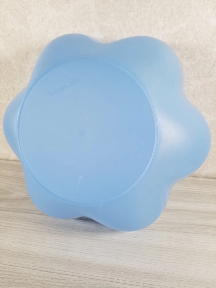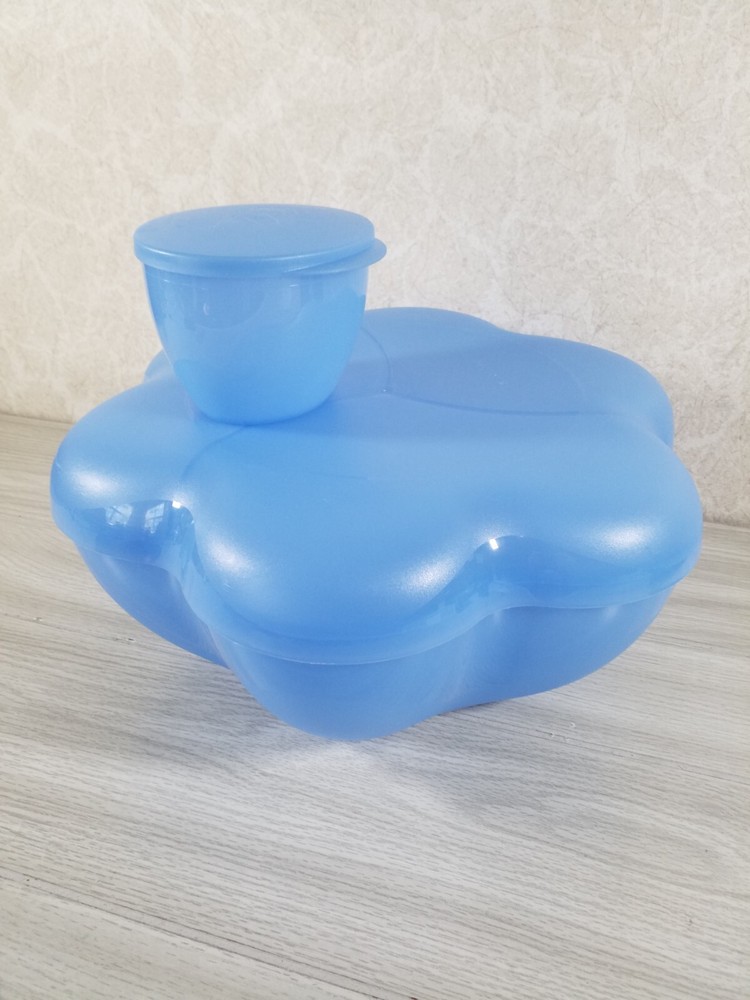 This Tupperware Blue Chip n Dip Server with a Divided Lid and one Dip Bowl with Lid #4624 is a stylish and functional addition to your kitchen. The scalloped round shape and fun blue color make it perfect for any occasion, whether it's a family gathering or a casual get-together with friends. It has a 1.5-gallon capacity and features a press-on lid that keeps your food fresh. With a total of six pieces, including three bowls and three lids, this chip and dip set is multipurpose and can be used for storing other items as well. The plastic material makes it easy to clean and reusable. Get your hands on this Original Tupperware Vintage Chip n Dip Server today! Tupperware Blue Chip n Dip Server w/ Divided Lid & 1 Dip Bowls w/ Lid #4624