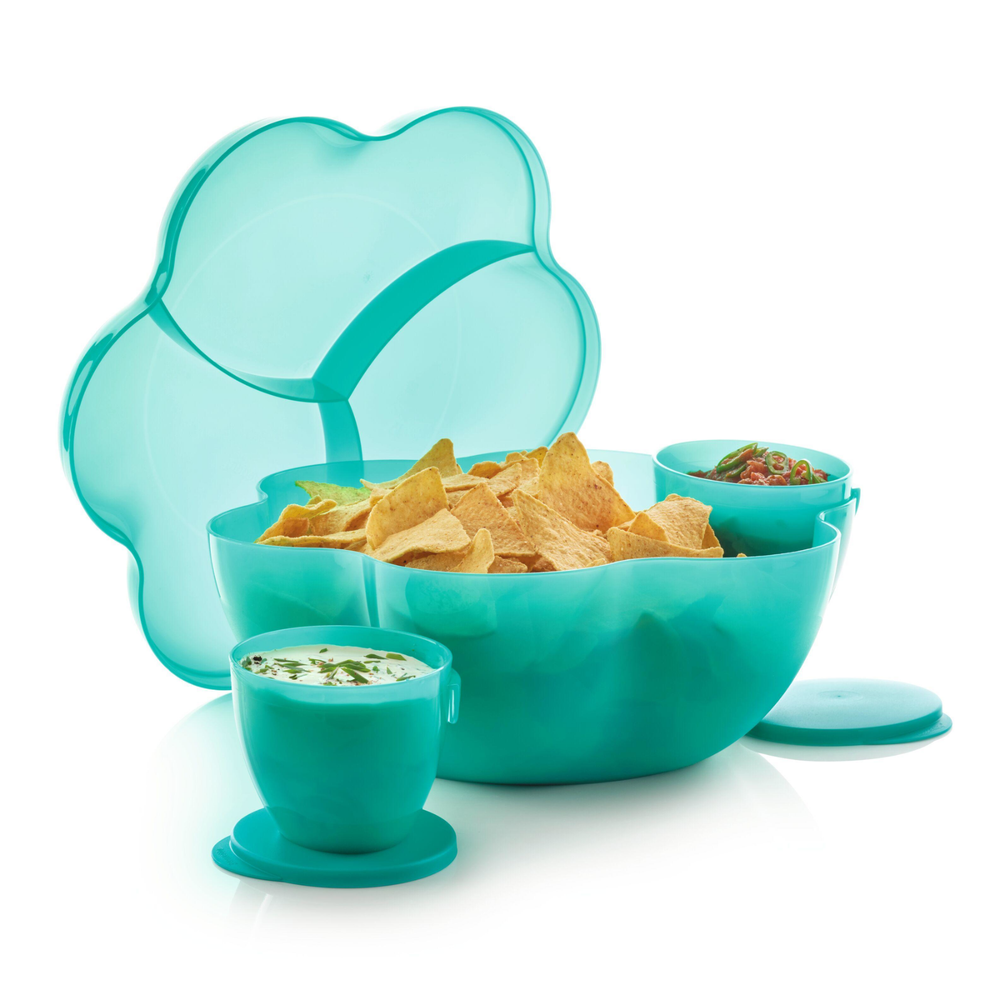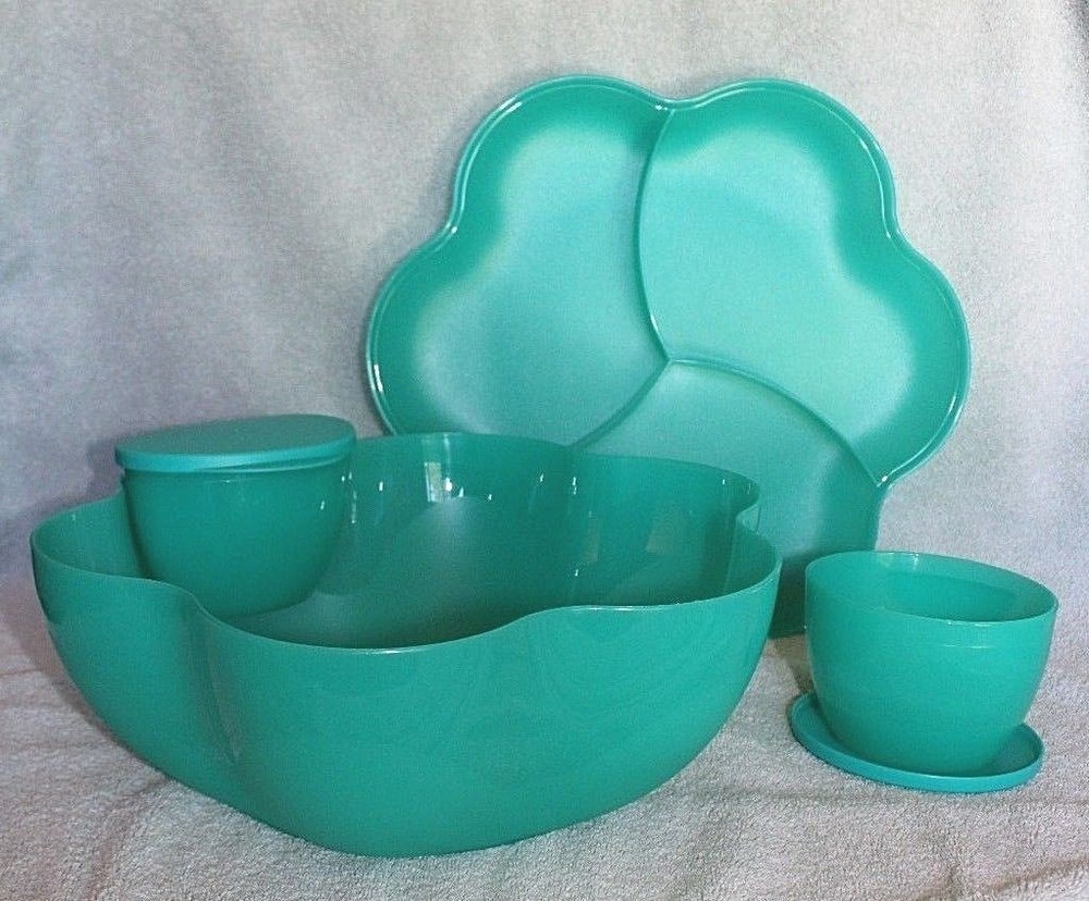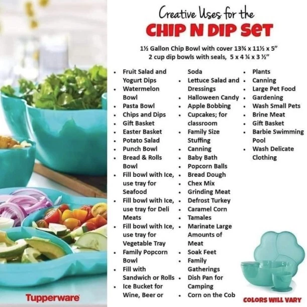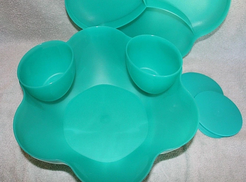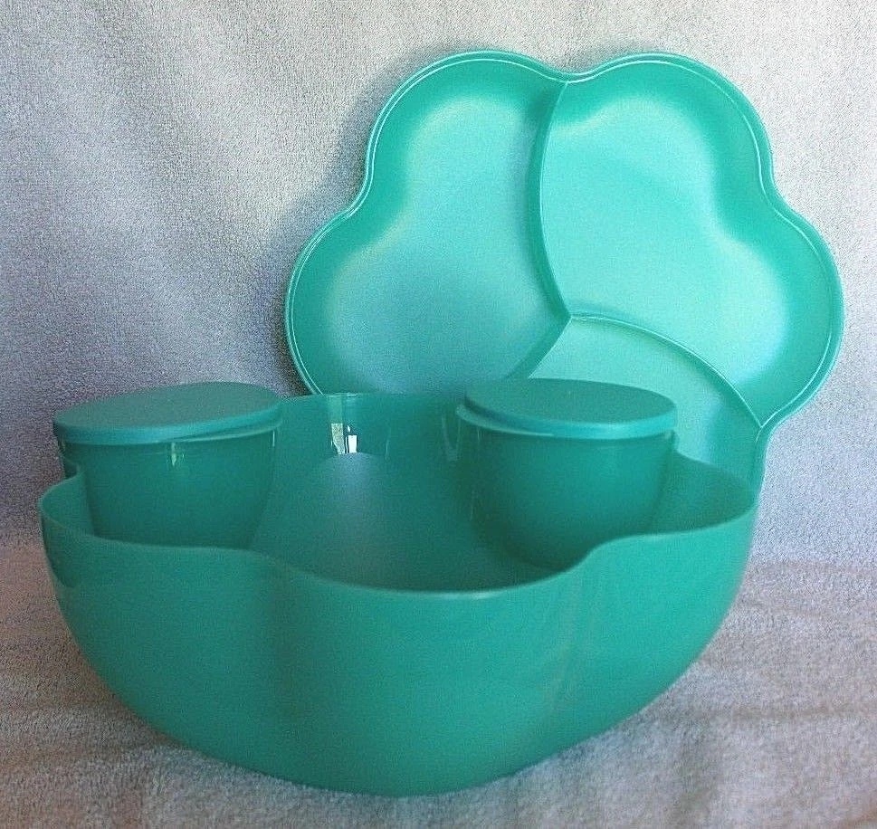 NEVER USED ~ BRAND NEW! ====================================== TUPPERWARE CHIP 'N DIP SERVING SET Perfect for all your party celebrations! Here's a true party-in-a-bowl! It's the ultimate party multi-tasker! You will receive: One 1-1/2 gallon/5.7L chip bowl that can double as a punch bowl. One three-compartment cover/lid that can double as a divided serving tray. Two 16 ounce/500ml microwave reheatable dip bowls with matching seals. (Remove seals before microwaving.) Lightweight and virtually unbreakable, this large capacity serving set features a stylish, innovative bowl that can hold chips or a crowd-pleasing salad. To serve salsa or dip, just hook the small bowls on the rim of the large bowl. Use for chips 'n dip or salsa, salad bar, veggie tray, fruit platter, deli platter, bread bowl, punch bowl, and more. Tupperware refers to color of bowl, lid, and dip bowls as alpine/parrotfish. It is a very pretty teal green color. Dishwasher safe. Factory-direct item; available for immediate shipment. Chip 'N Dip Serving Set has never been used. BRAND NEW! Chip 'N Dip Serving Set will come to you in its original Tupperware packaging. Taken out of packaging for photo purposes only. I am the original owner; stored in a smoke-free environment. Chip 'N Dip Serving Set weighs 1 lb.,14 oz. prior to adding any packaging material(s). Item will be securely packaged and sent USPS Ground Advantage. Please message me with any questions. Thank you! ===================================================================================== INTERNATIONAL SHIPPING: International Buyers Please Note: Import duties, taxes and charges are not included in the item price or shipping charges. These charges are the buyer's responsibility. Please check with your country's customs office to determine what these additional costs will be prior to bidding/buying. These charges are normally collected by the delivering freight (shipping) company or when you pick the item up. Do not confuse import duties, taxes and charges for additional shipping charges.