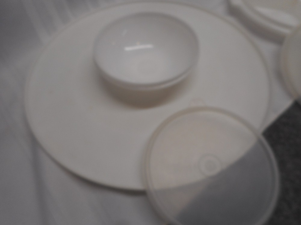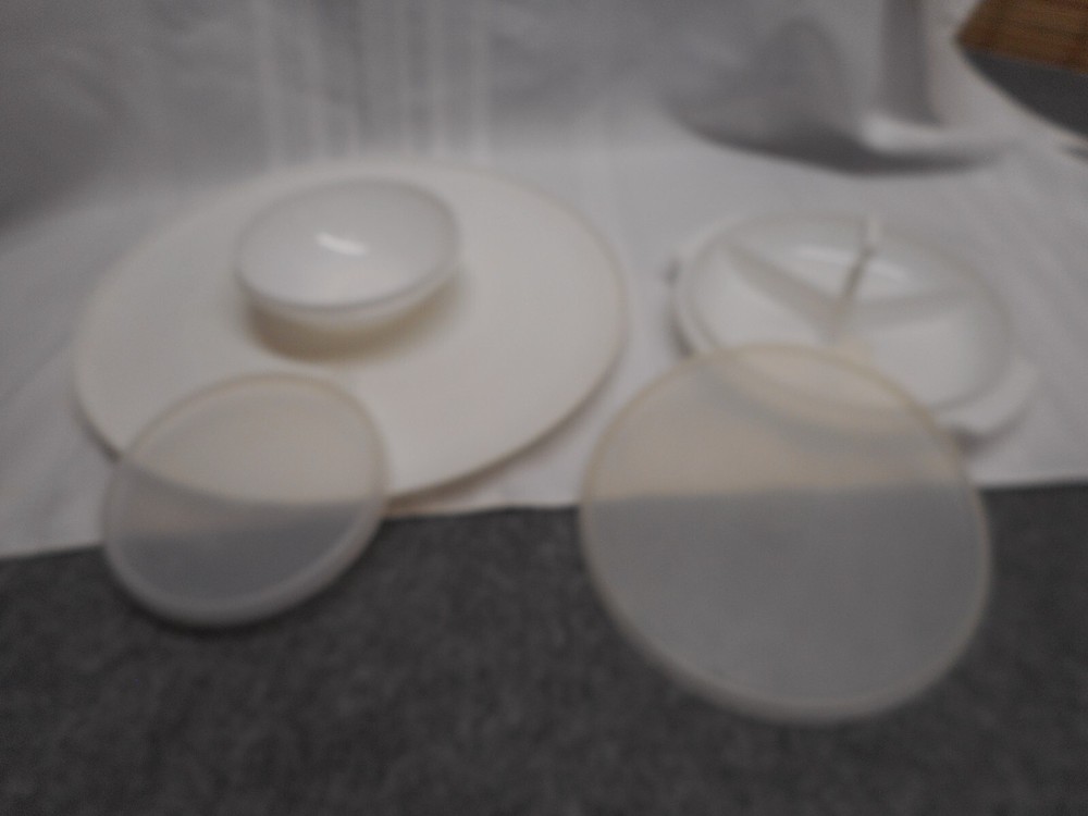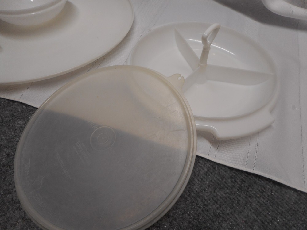 For sale 5 Piece Vintage Tupperware Serving Trays. The large 14" Round White platter has a snap on Bowl with Lid. The 3 Section Divided Dish has a screw-on top for carrying and Lid. These items are GREAT and Nice/Clean (Barely Used). A must in every kitchen. E-Mail with questions and thank you for looking.