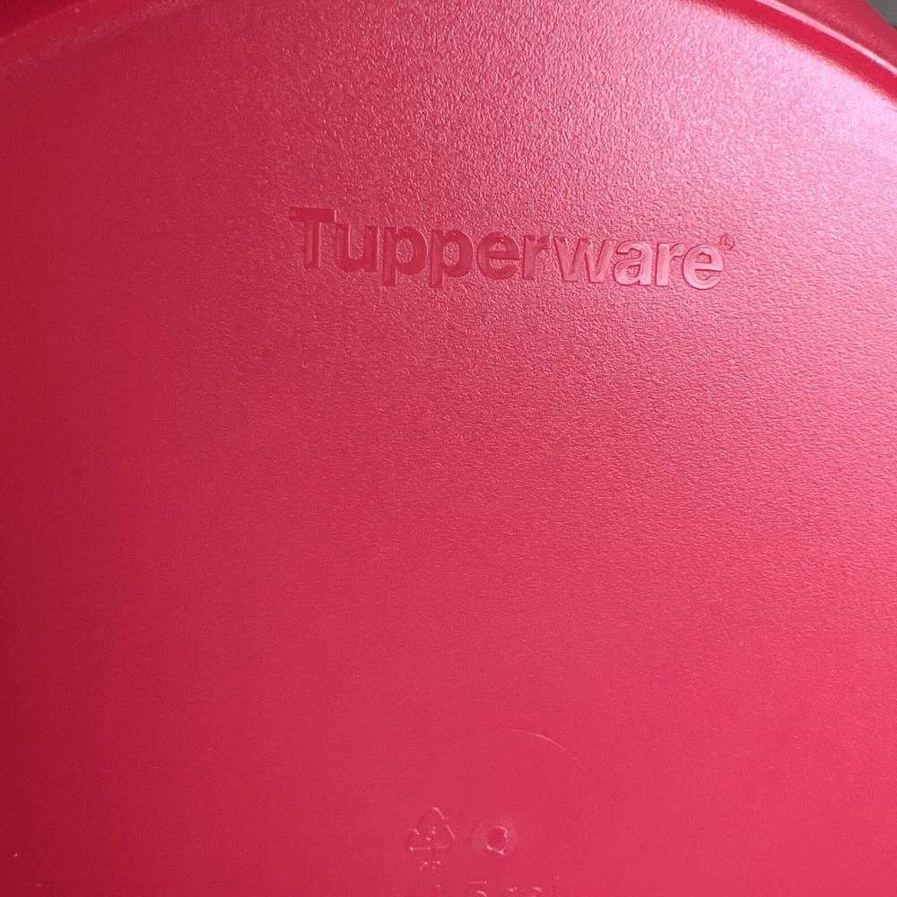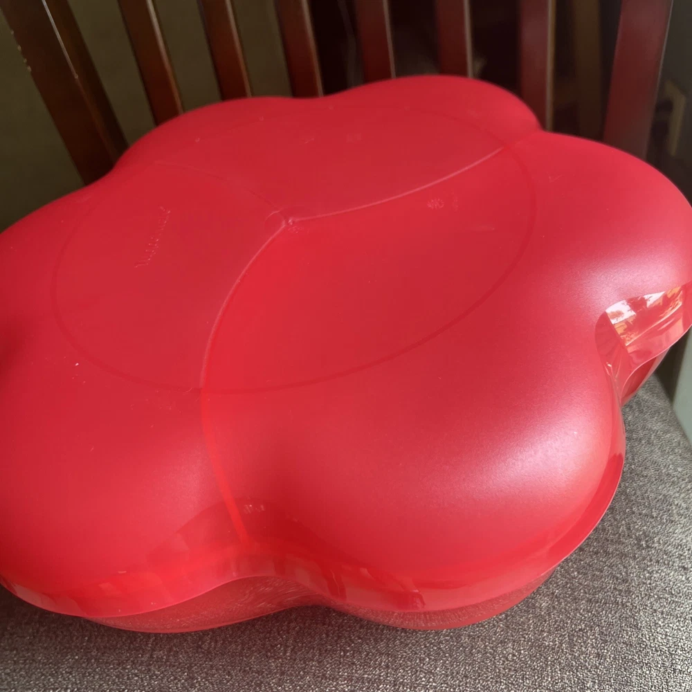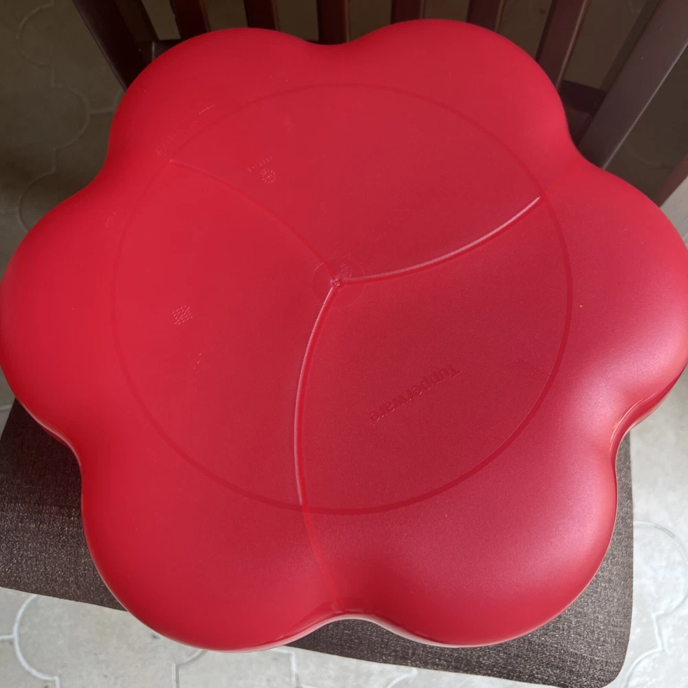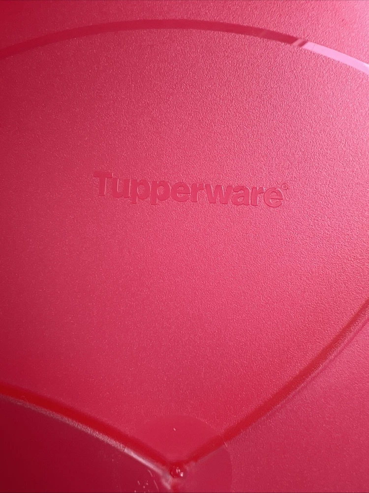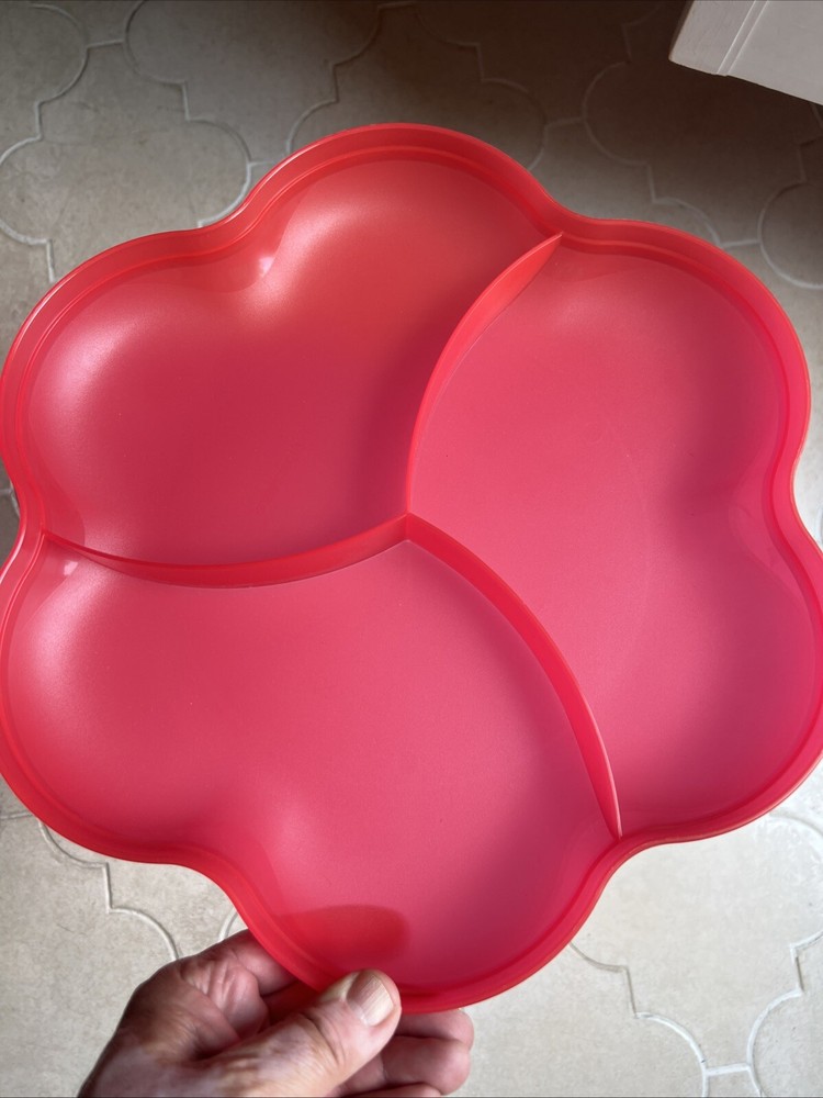 This Tupperware serving tray is the perfect addition to your collection! With a capacity of 1.5 gallons, it's great for hosting parties or gatherings. The tray is designed in a vintage/retro style and features three compartments for your favorite dips and snacks. The lid fits on bowl to keep your food fresh and safe from bugs. Made of durable plastic, this tray is reusable and easy to clean. It's handmade in the United States and measures 13 inches in length and width, with a height of 6.5 inches. The tray comes with a lid and is an original Tupperware product. Add this unique piece to your collection today! It was preowned but was unused dead stock from person who used to sell Tupperware.