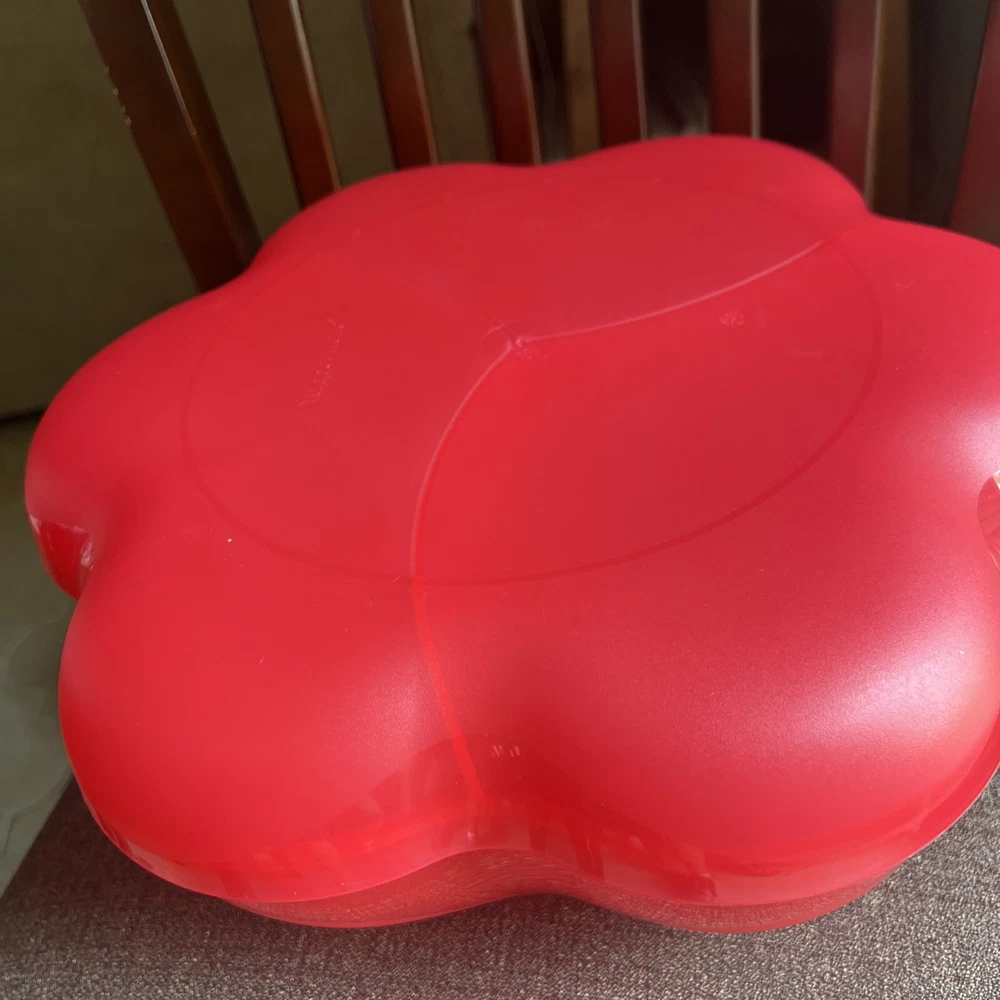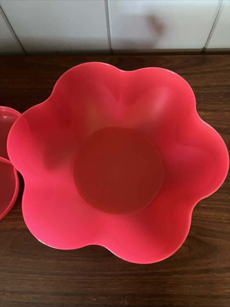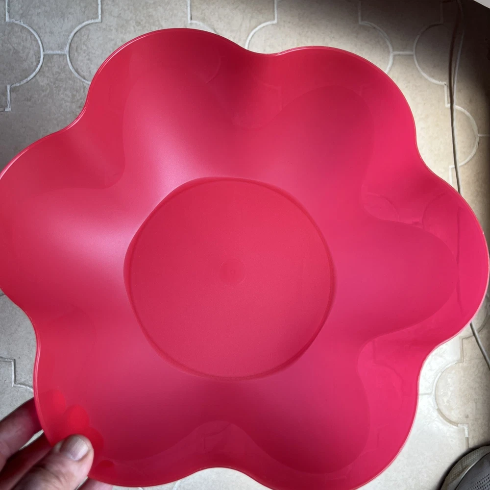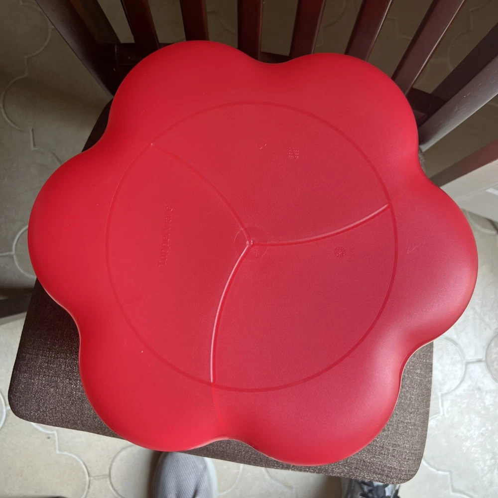 This Tupperware serving tray is the perfect addition to your collection! With a capacity of 1.5 gallons, it's great for hosting parties or gatherings. The tray is designed in a vintage/retro style and features three compartments for your favorite dips and snacks. The lid fits on bowl to keep your food fresh and safe from bugs. Made of durable plastic, this tray is reusable and easy to clean. It's handmade in the United States and measures 13 inches in length and width, with a height of 6.5 inches. The tray comes with a lid and is an original Tupperware product. Add this unique piece to your collection today! It was preowned but was unused dead stock from person who used to sell Tupperware.