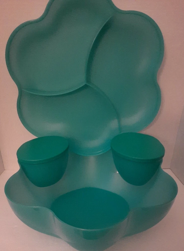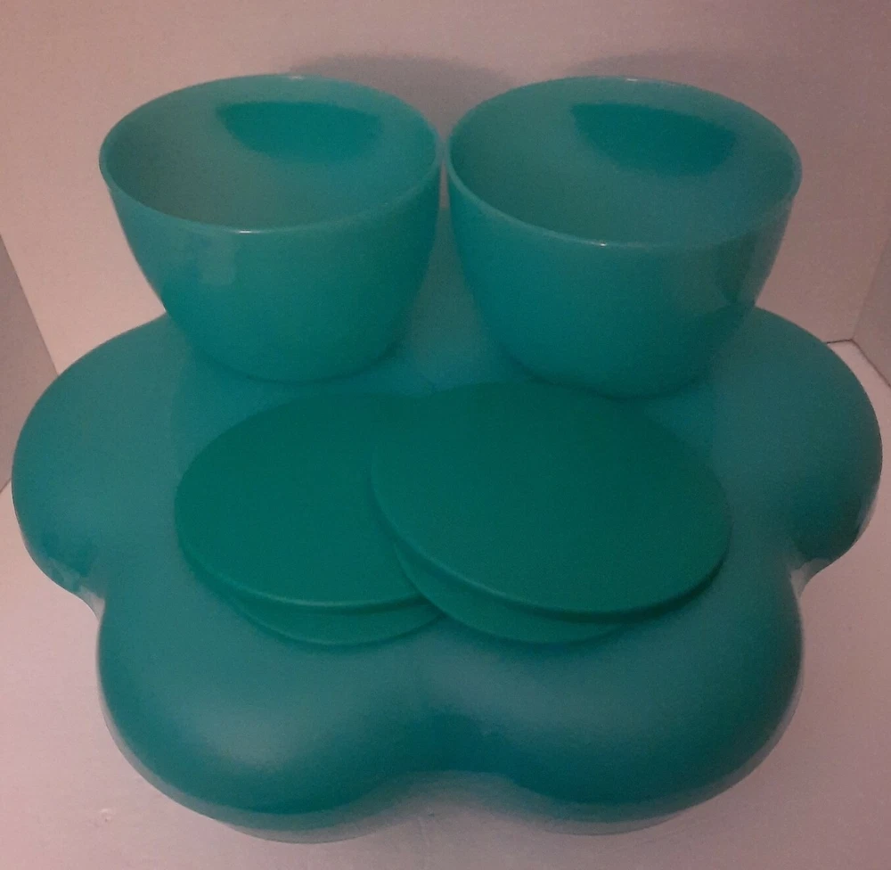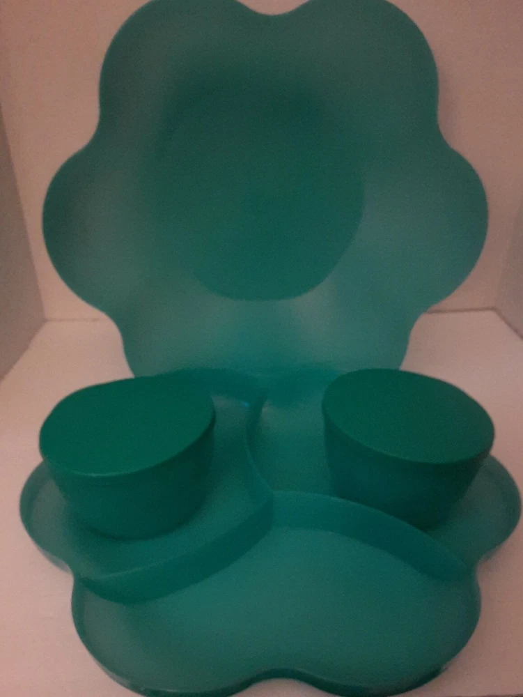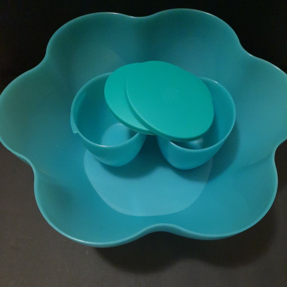 Tupperware Chip N Dip Set Our chip and dip bowl set is the ultimate party multitasker! Lightweight and virtually unbreakable, this large-capacity chip and dip serving set features a stylish, innovative bowl perfect for use as a punch bowl, with chips and salsa, chips and dip or a crowd-pleasing salad. To serve salsa or dip, simply hook the chip and dip smaller bowls on the rim of the larger bowl. The chip and dip set cover adds on-the-go versatility and is divided into separate compartments, making it a great serving tray. The smaller bowls are microwave-safe so you can make the perfect warm queso dip in seconds. Remove seals before microwaving. 1½-gallon/5.7 L chip bowl Two 2-cup/500 mL microwaveable dips bowls with seals (remove seals when reheating) Three-compartment cover/serving tray Color in Teal Green New in Package
