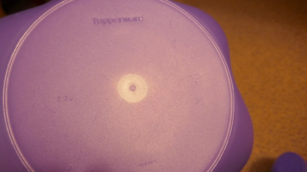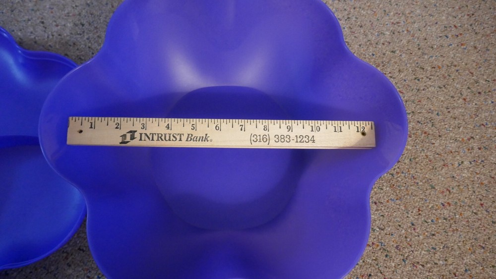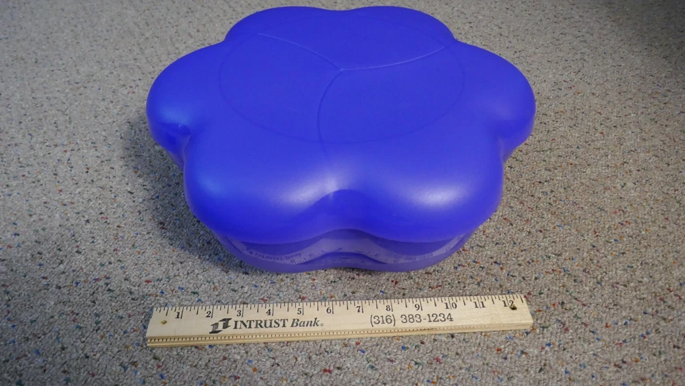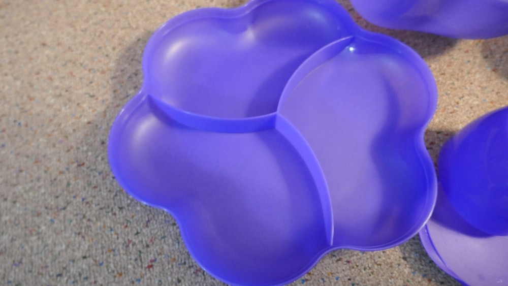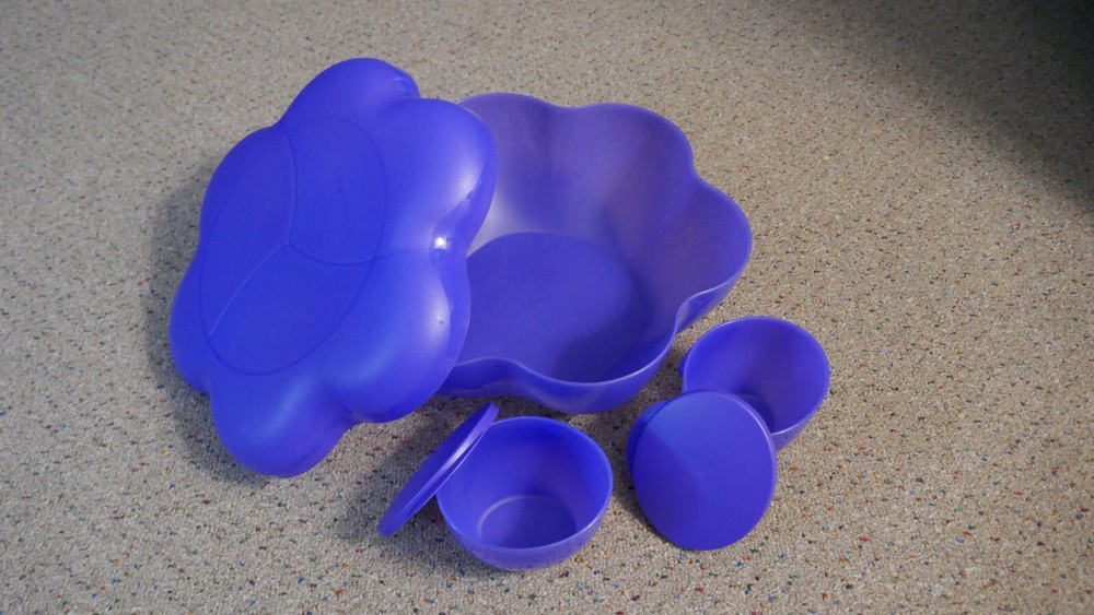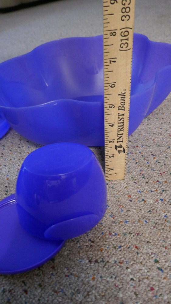 This Tupperware Chip 'N Dip Bowl Set in purple (a bit lighter & more transparent than it appears in the pictures) is the perfect addition to your kitchen storage and organization. It includes a 3 section serving tray, large scalloped bowl and two dip bowls with lids, making it easy to serve a variety of snacks to your guests. The round shape and contemporary style add a modern touch to any occasion, be it a holiday gathering or a casual get-together. Made of high-quality plastic, this original Tupperware set is durable and long-lasting. Whether you're a fan of vintage collectibles or modern kitchen accessories, this Tupperware set is a must-have. Excellent condition!