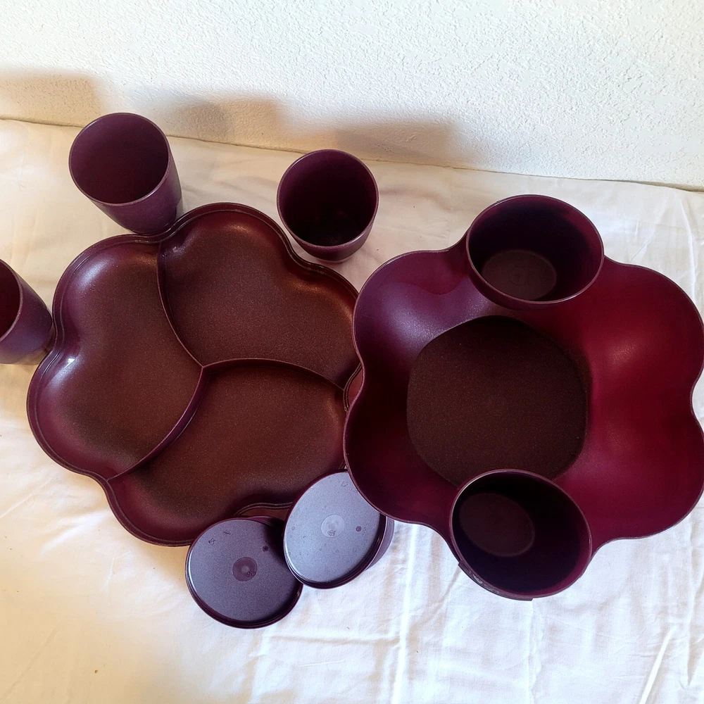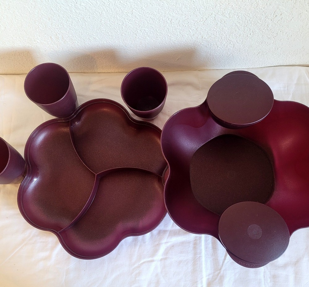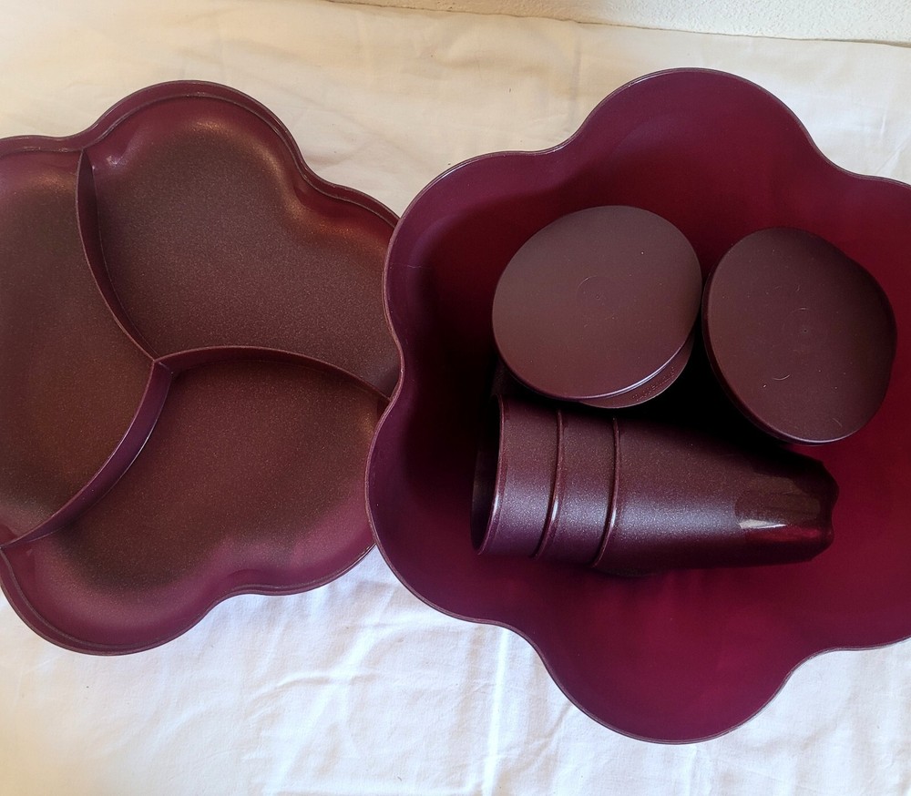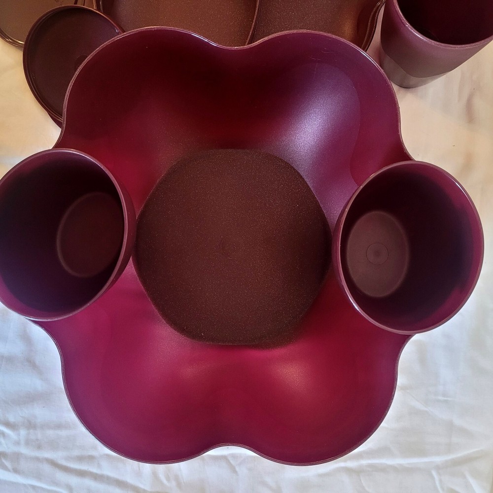 The Tupperware Chip-N-Dip Bowl Set includes a large divided tray with a lid and three extra cups, making it a six-piece set. The set features a solid red color with a flower shape design, perfect for all occasions. The bowls are made of break-resistant plastic with a contemporary style, ideal for serving snacks and dips while entertaining family and friends.