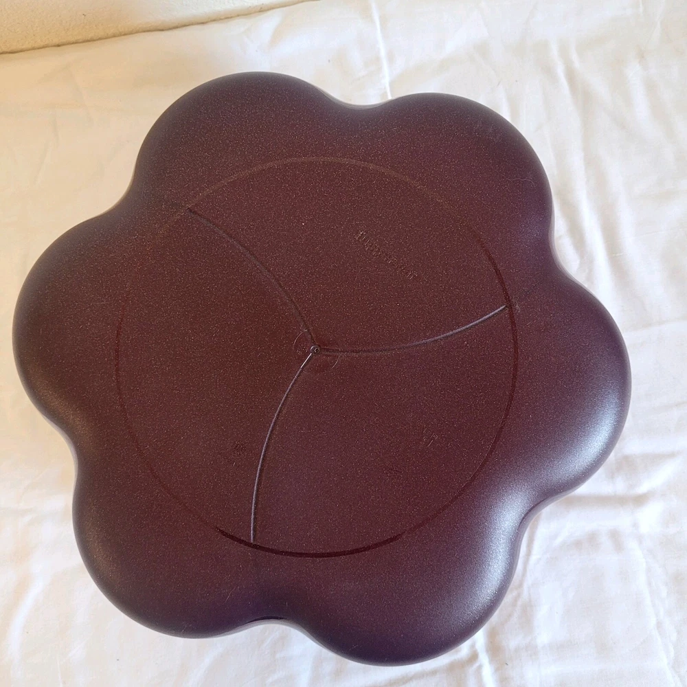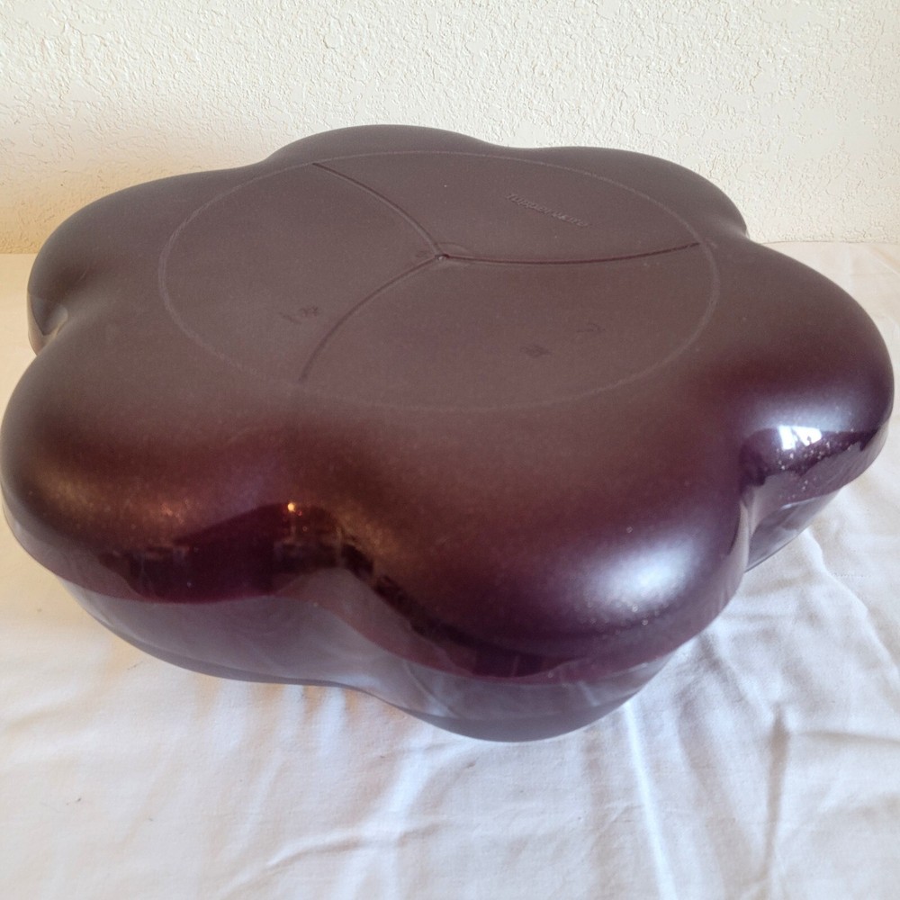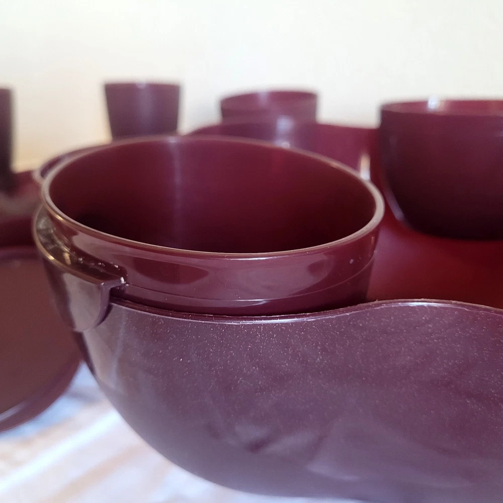 The Tupperware Chip-N-Dip Bowl Set includes a large divided tray with a lid and three extra cups, making it a six-piece set. The set features a solid red color with a flower shape design, perfect for all occasions. The bowls are made of break-resistant plastic with a contemporary style, ideal for serving snacks and dips while entertaining family and friends.