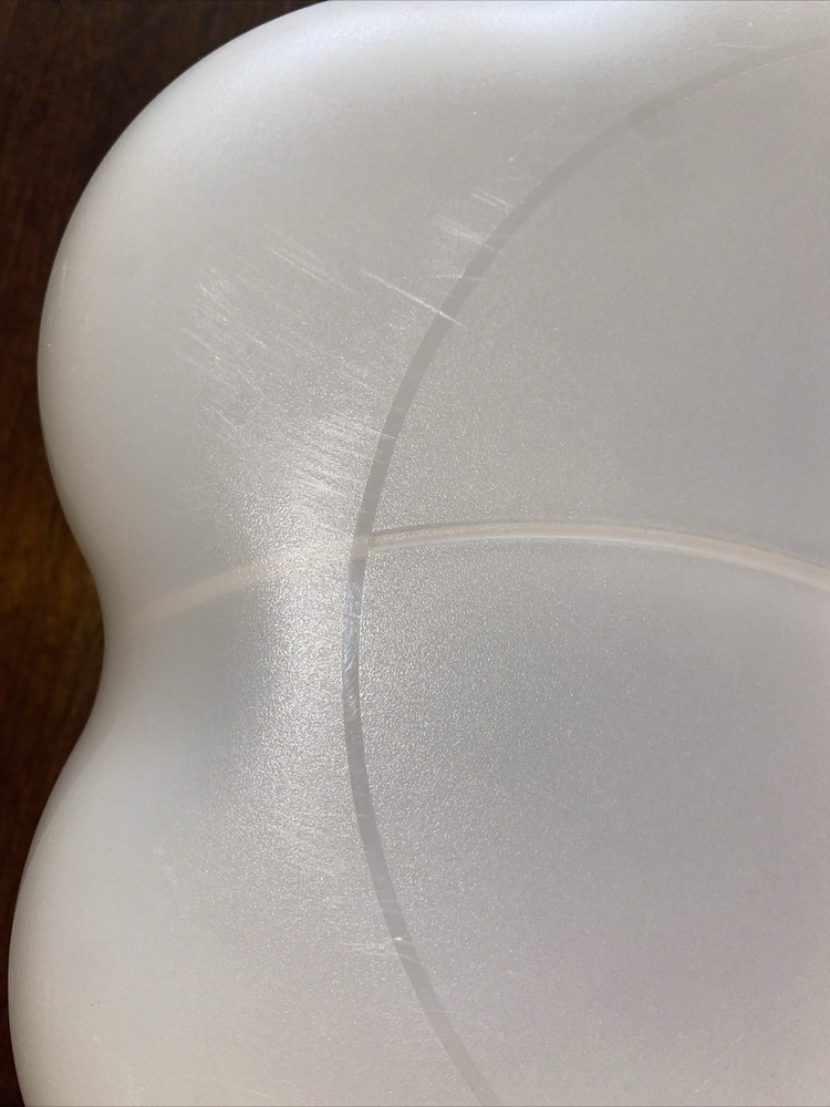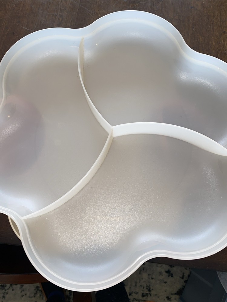 This Tupperware six-piece bowl set is perfect for any occasion. The set includes a large divided tray lid, two 4626 bowls, and two 4627 lids one 4624 bowl, in a crème color with a matte finish. The bowls are made of break and chip-resistant plastic and feature a contemporary style. The set is perfect for serving food to family and friends and is great for all occasions. The bowls are in excellent condition and have been well-cared for. Whether you're hosting a party or just having a family dinner, this Tupperware Chip-N-Dip Bowl Set is the perfect addition to your kitchen.