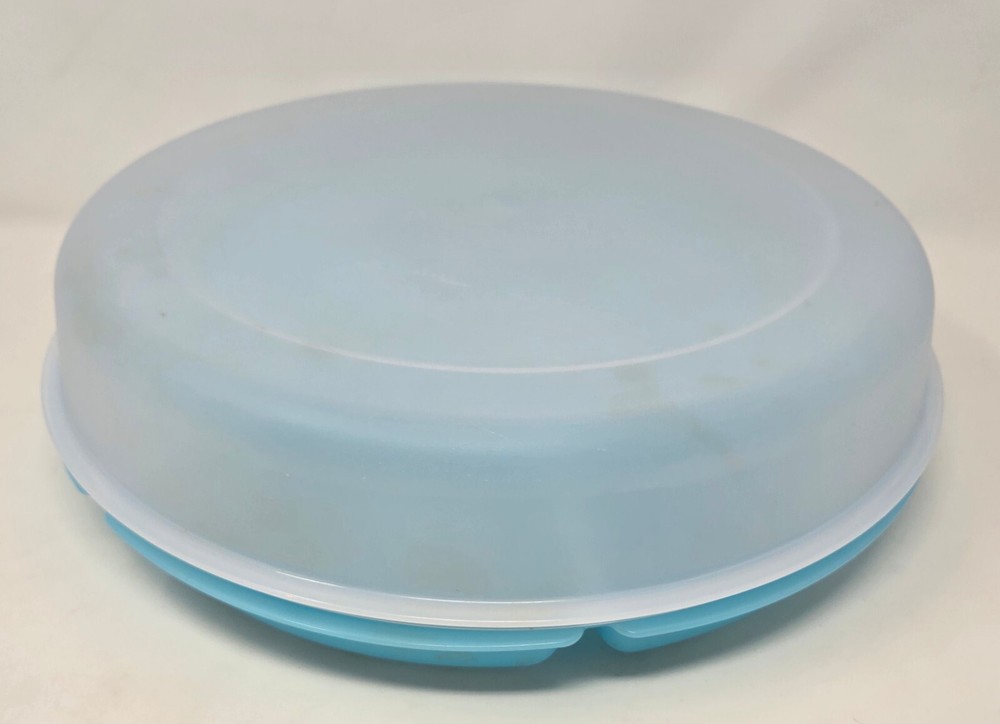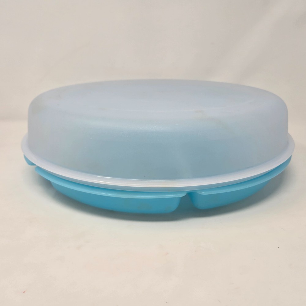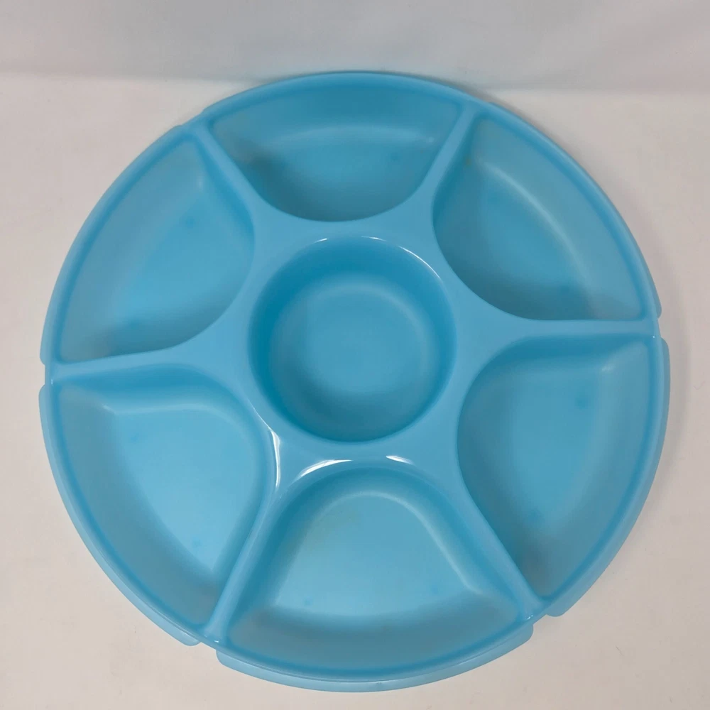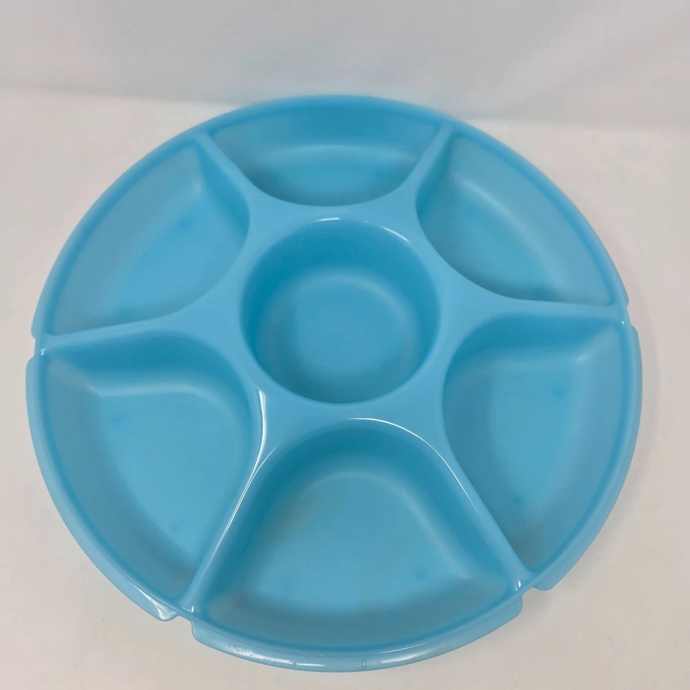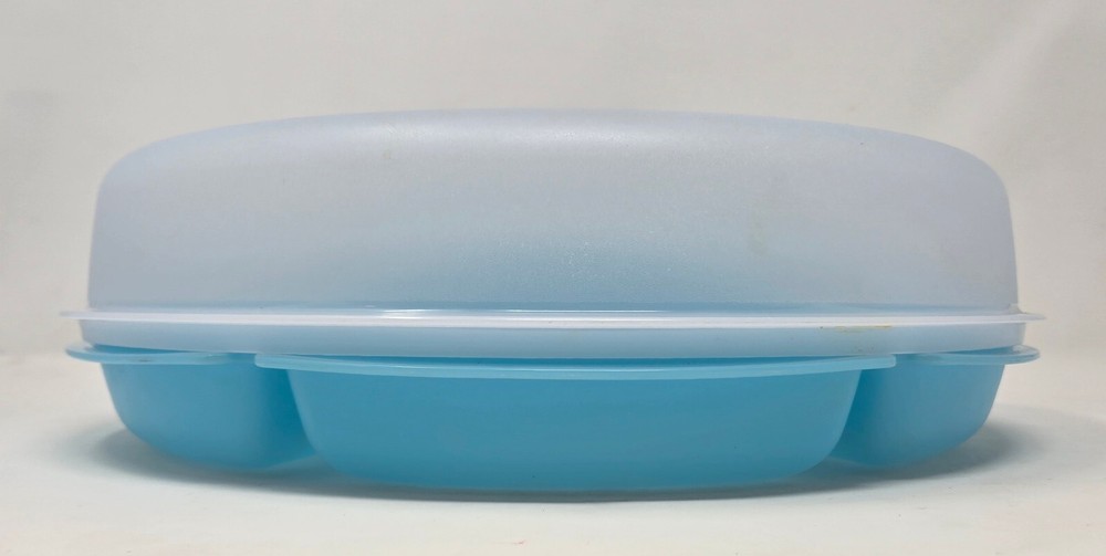 This is a genuine Tupperware Veggie Tray and Relish Dish in Blue with a Transparent Frosted Cover. It is 14 inches diameter and 4 inches tall with 6 compartments around and a center spot for dip. It is item number 1665G-1. This relish tray is barely used and in excellent condition without damage or defects.