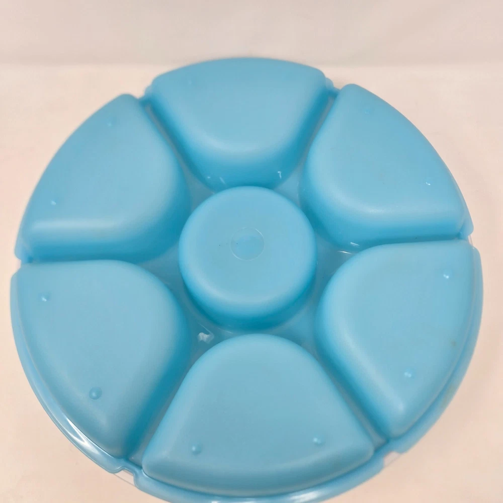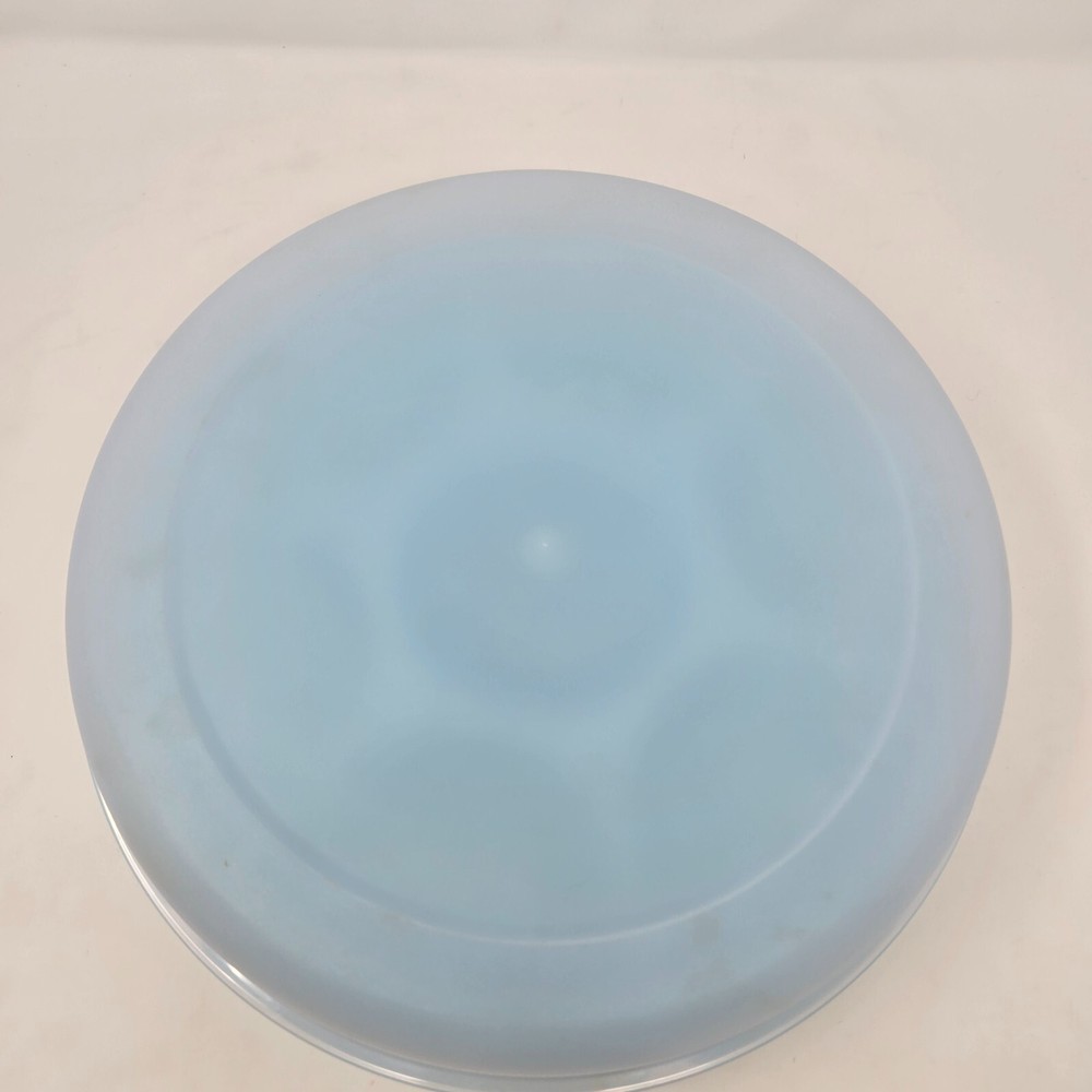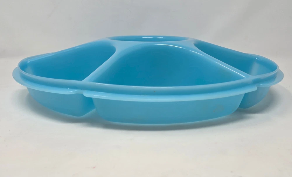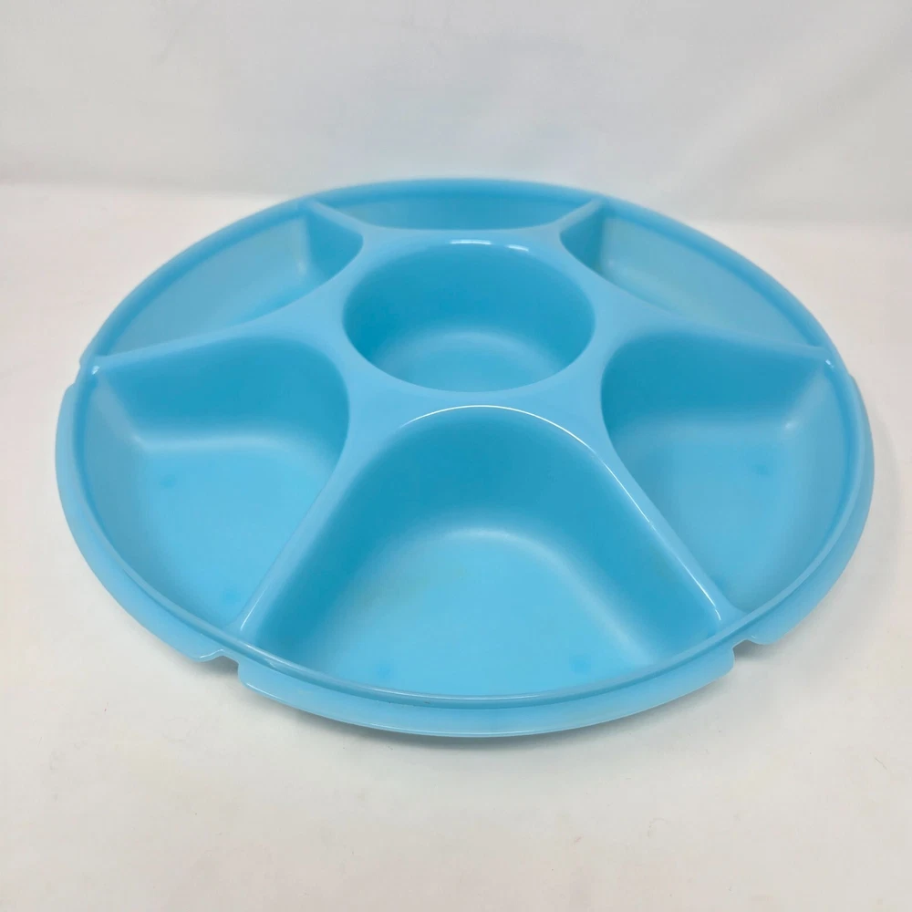 This is a genuine Tupperware Veggie Tray and Relish Dish in Blue with a Transparent Frosted Cover. It is 14 inches diameter and 4 inches tall with 6 compartments around and a center spot for dip. It is item number 1665G-1. This relish tray is barely used and in excellent condition without damage or defects.