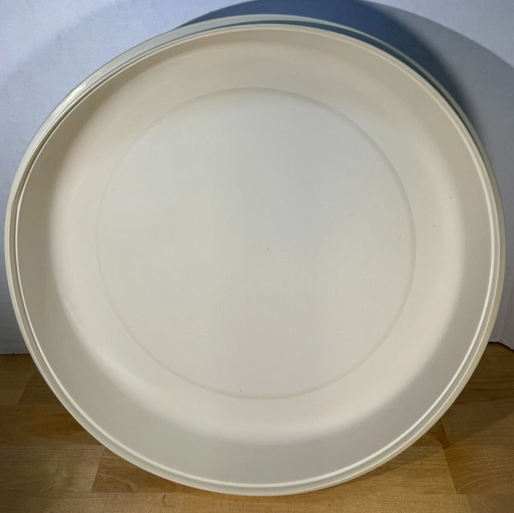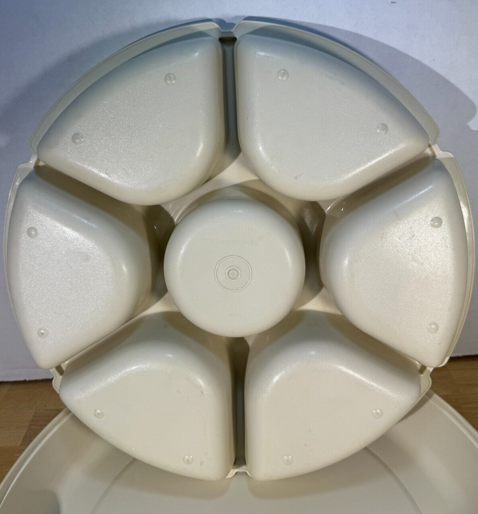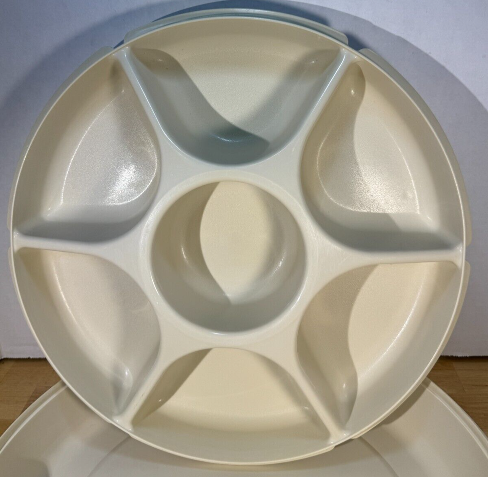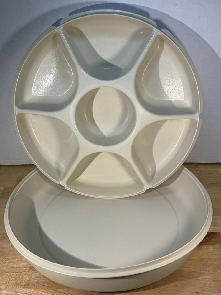 This Tupperware serving tray with lid is a versatile addition to your kitchen storage and organization. With more than 5 compartments and 7 slots, it can be used to store and serve a variety of snacks, chips, and dips. The round tray comes in a beige color and has a twist off lid, making it easy to transport and store. This vintage Tupperware tray is an original and is in good condition. It measures 13.5 inches in length and width, with a height of 4 inches. The set includes 2 trays, numbered 1665-2 and 1666-2, and is ideal for entertaining guests or for everyday use. Add this Tupperware tray to your collection today! We do combine shipping on multiple items purchased!! Check out our store for our other items listed. Give us a like and save to receive special discounts for becoming a member!!