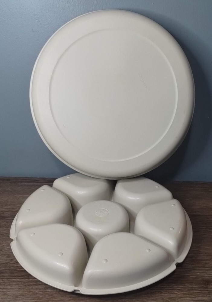Tupperware Divided Serving Party Tray 1665-3 Almond With Lid 1666-3 No Dip Bowl - Used