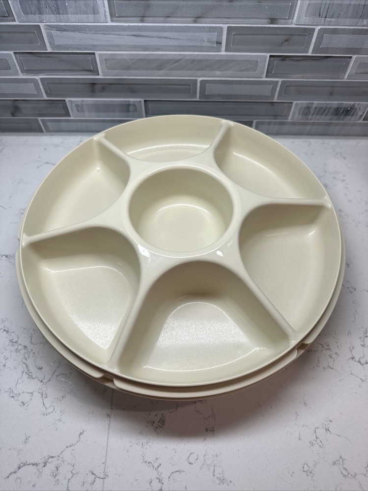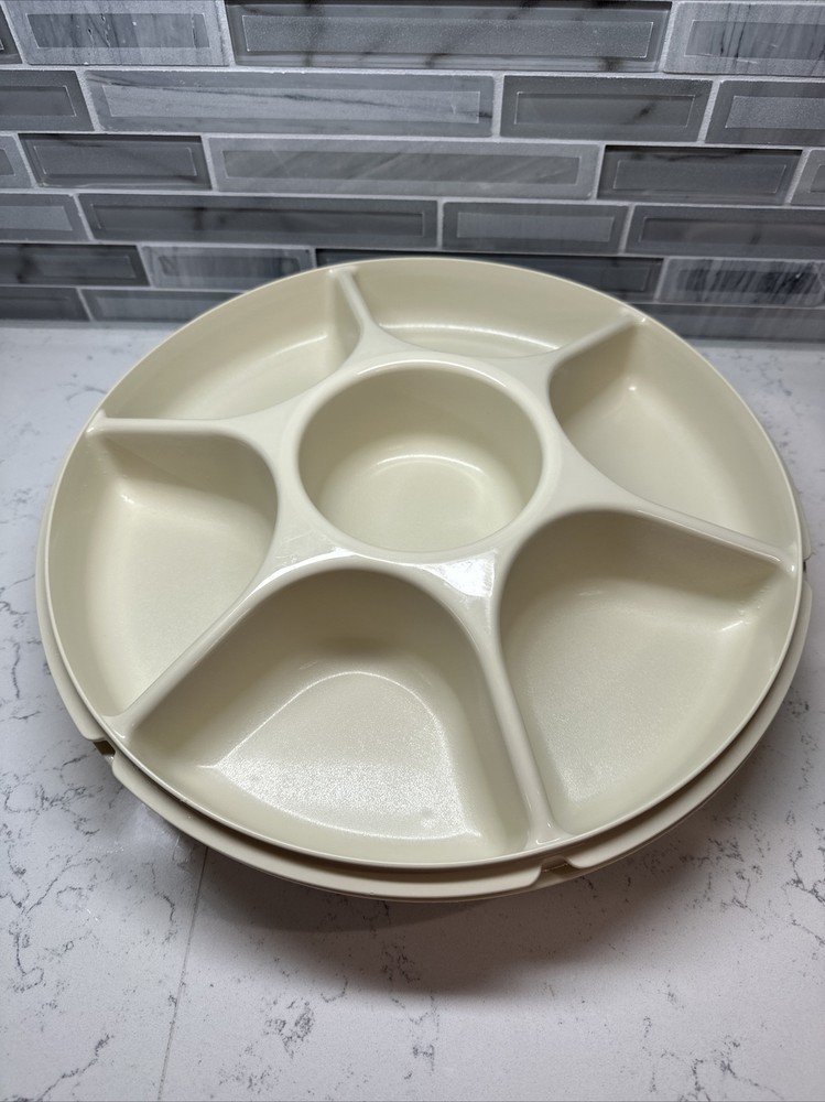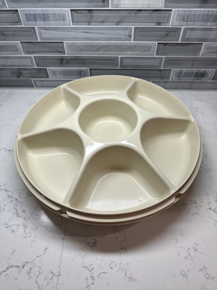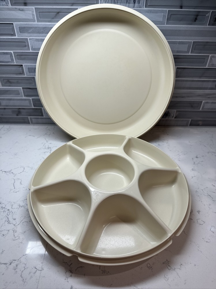 Tupperware Divided Serving Tray 1665-3 Almond With Lid 1666-3 No Dip Bowl 2 pcs. SHIPS FREE!!