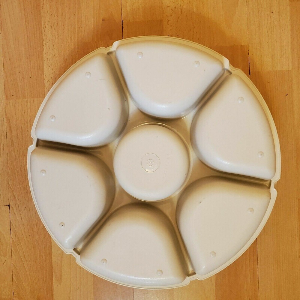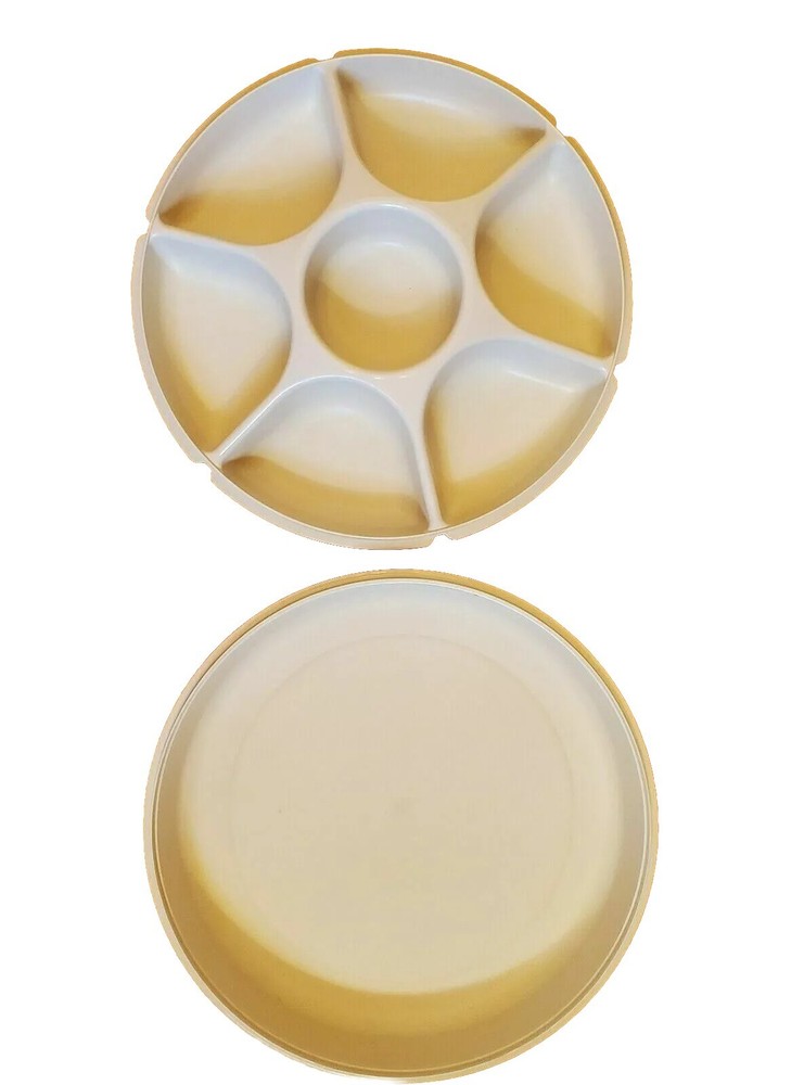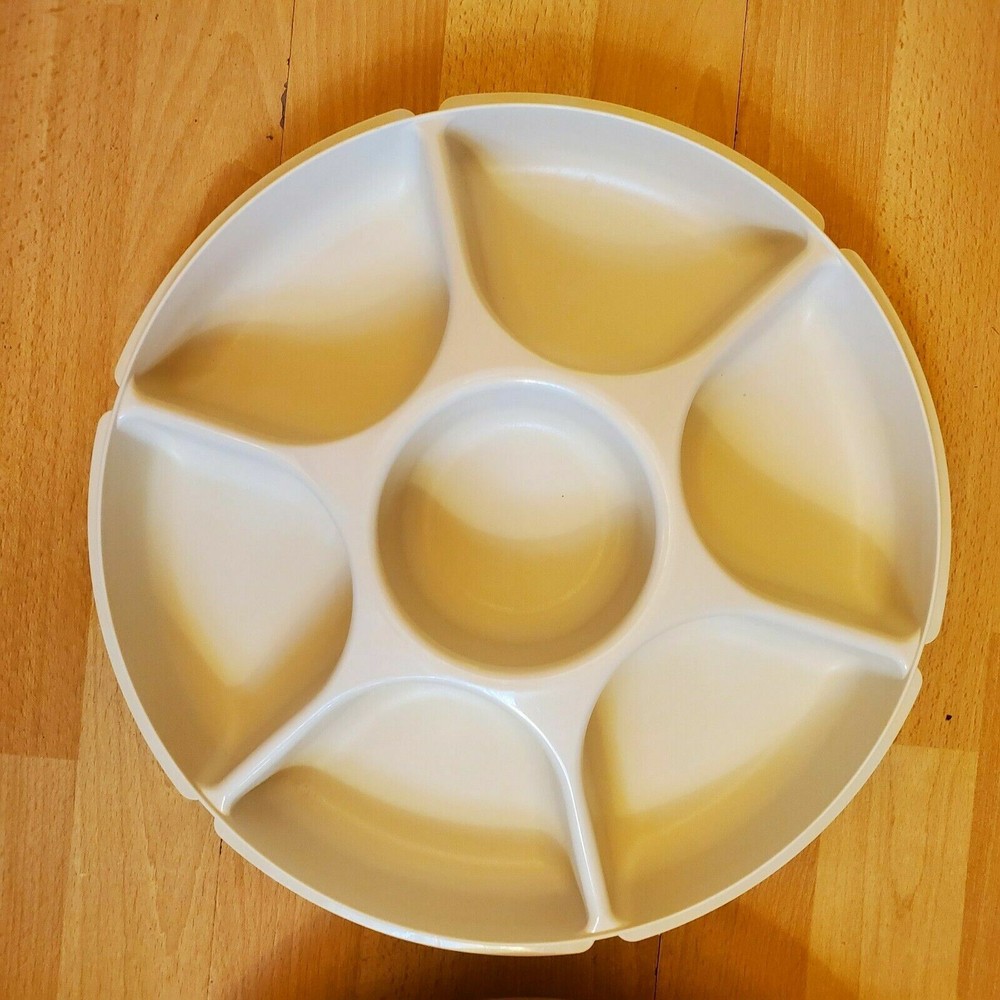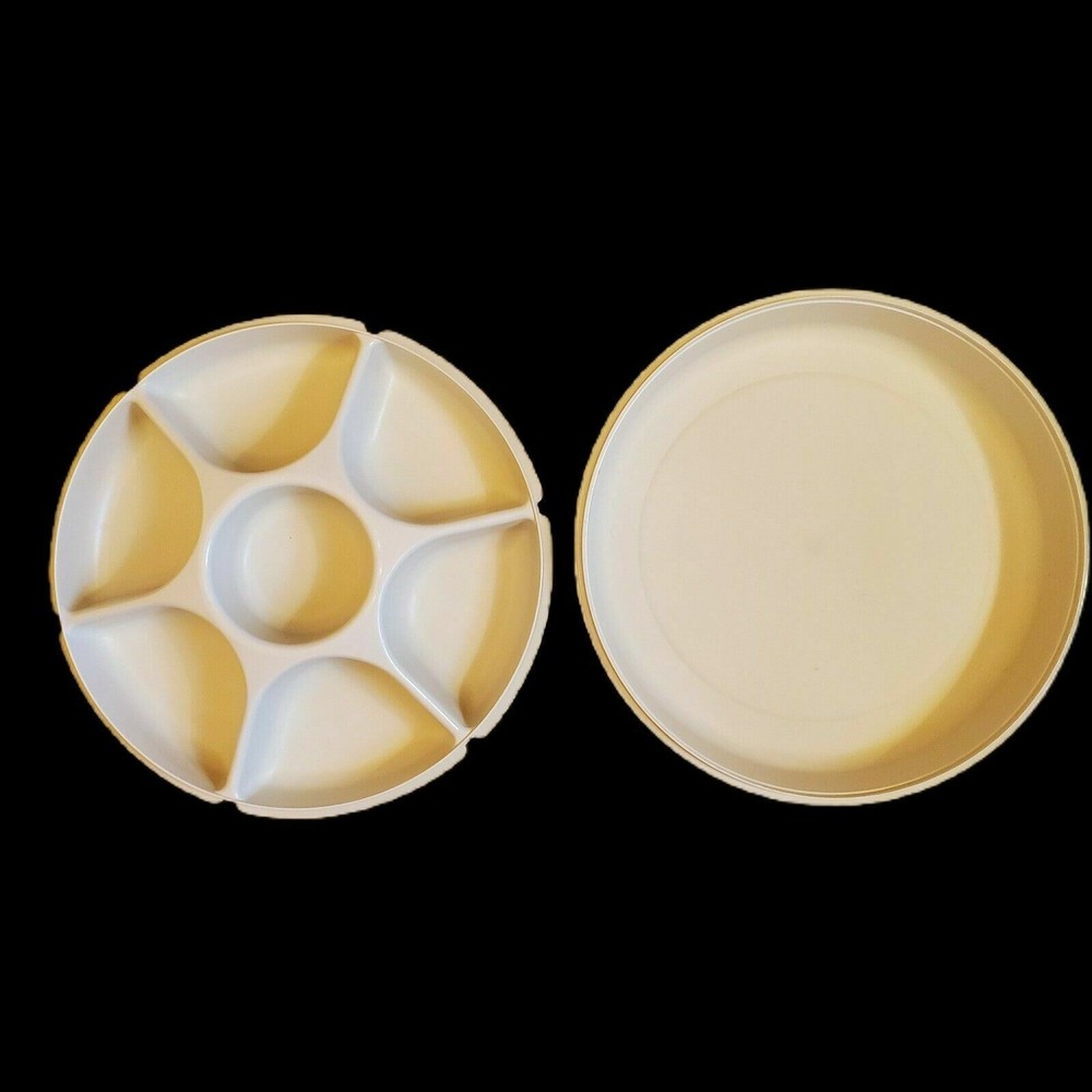 All clothing items are cleaned per ebay policy This Tupperware divided serving tray is a must-have for any kitchen. It comes in a classic ivory color and includes a lid for easy storage. The tray has 5 compartments and 5 slots, perfect for storing vegetables and dip separately. It is made of high-quality plastic and is both vintage and original. The push lid ensures that your food stays fresh and secure. This tray is perfect for entertaining guests or for everyday use in the kitchen.