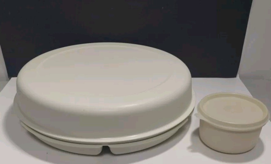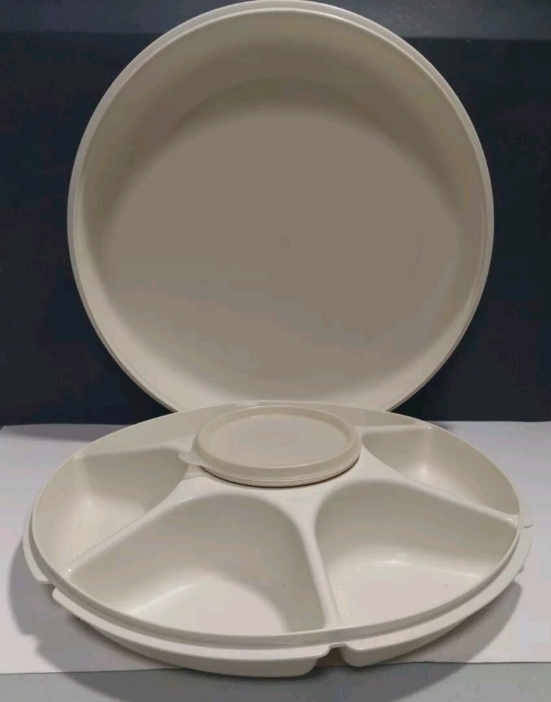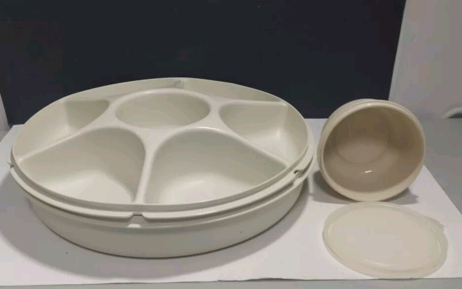 This Tupperware Divided Serving Center Veggie Tray is a vintage piece that will add a retro touch to your kitchen. With a twist-off lid, this large round tray has seven compartments and slots for serving fruits and dips. It measures 13 inches in length and diameter, with a height of 4 inches and a depth of 2 inches. The tray is made of durable plastic and comes with a center dip container keeper and lid. It is perfect for holiday and food-themed occasions, as well as for everyday use. This original Tupperware item was manufactured in the United States in the 1980s and weighs 1 lb and 9 oz.