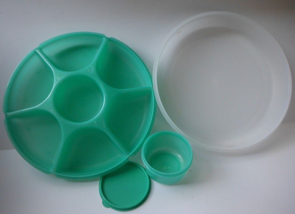 Welcome this Item is presented by Time Travelers Boutique Please read complete description, look at all pictures and check measurements Tupperware Divided Serving Tray lidded Lid Carrier Dip Chips Veggies green Tupperware Divided Serving Tray And Lid Carrier also has lidded center container Dip Chips Veggies green perfect for picnics and out door events Lot # 7104 Thanks for looking Please See My Other Items to save on shipping *please note All measurements are approximate and taken while garment is lying flat and unstretched. Please do not rely on the tagged size of a garment to gauge fit; sizing is never the same and can vary widely. I suggest measuring one of your own favorite fitting clothing items for comparison. If there is a problem with your item please contact me ASAP I am proud of my customer service my goal is to have very happy customers POSTAGE / INSURANCE Winning bidder pays shipping unless stated otherwise Domestic shipping : USPS Ground Advantage(includes $100 insurance) International shipping: USPS Ebay International Standard Delivery Local Pickup: Fullerton Ca Combined Shipping: Items will be combined for winning bidders of more than one item to save on postage costs. BEST OFFER Best offers will be considered some items are on consignment so some may take longer to get back with answer