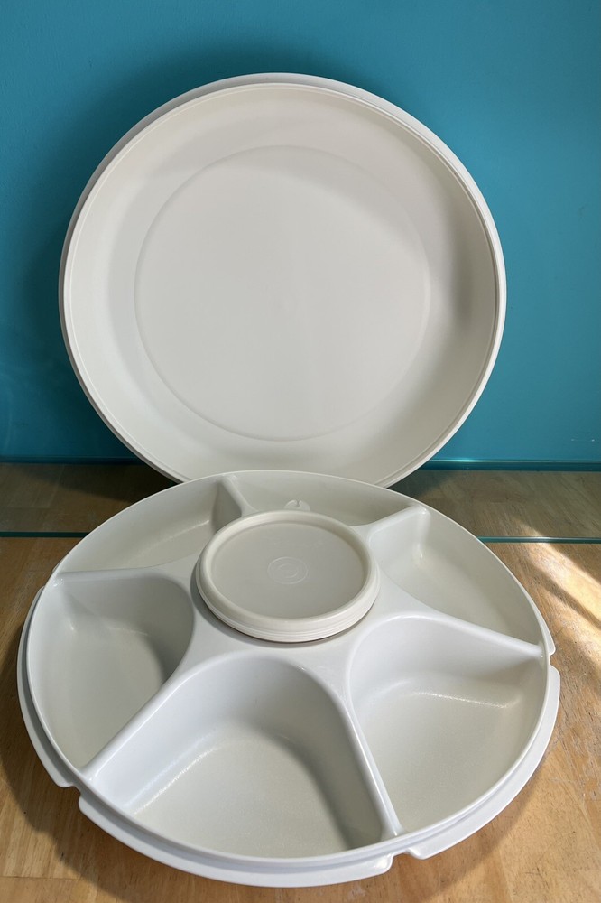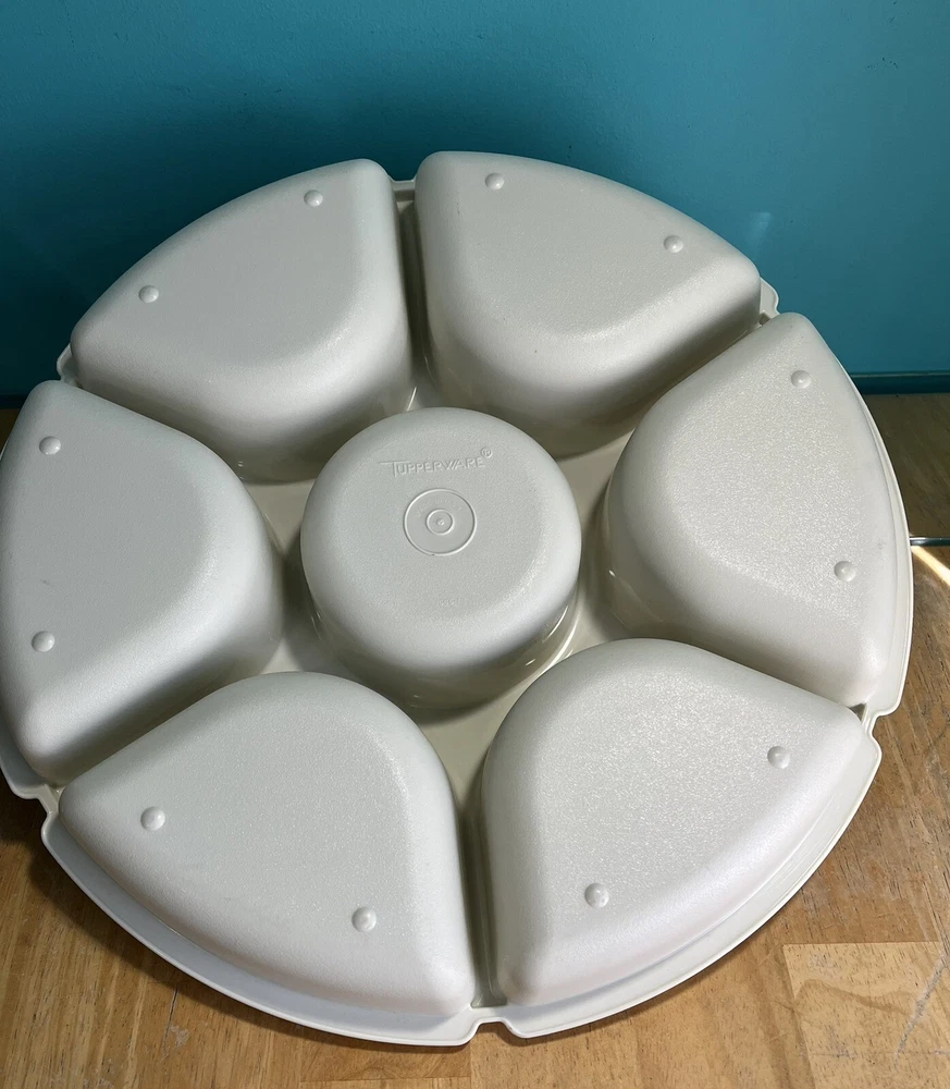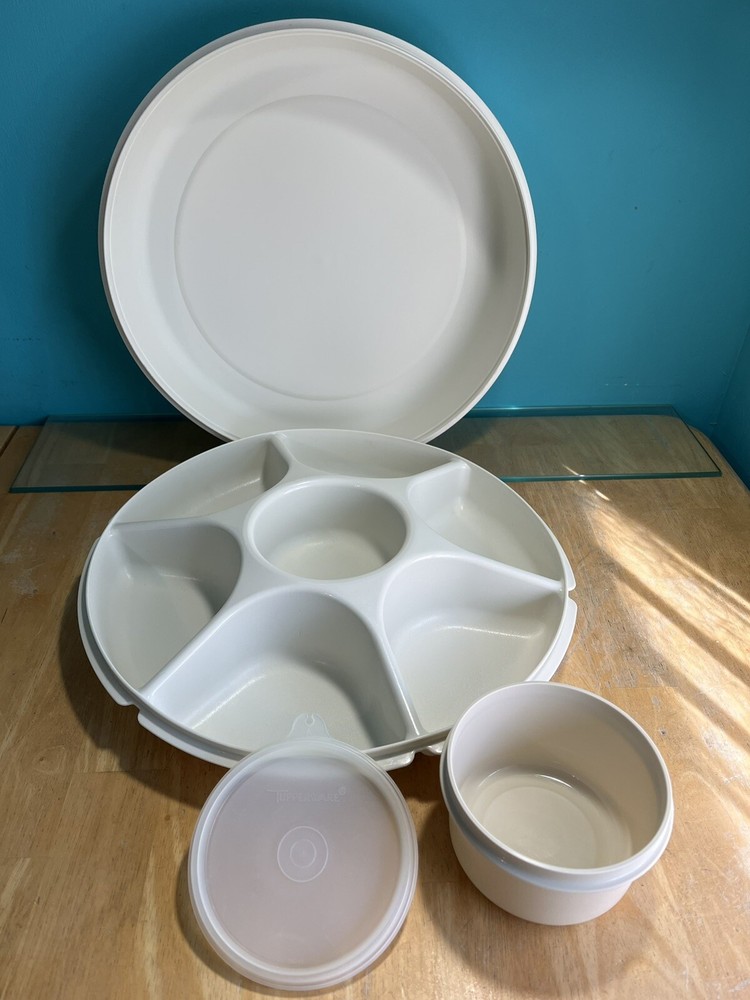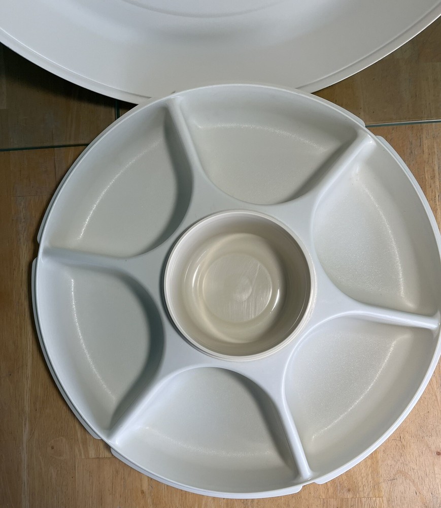 Tupperware Divided Serving Veggie Tray Dip Container Almond 1666-1 Thanks for looking. This Tupperware Divided Serving Veggie Tray Dip Container in Almond is a versatile & practical addition to your kitchen. It features 8 slots if you take out the center bowl you get an extra slot. Making it perfect for serving multiple dishes. The tray comes with a lid as well as the little center bowl. Use it as a sort of lazy susan on your dinner table. Made of durable plastic, this Tupperware tray is in like new condition. It is a contemporary style with a solid pattern. It is perfect for those looking for a reliable & functional kitchen storage solution. It is 4” H, 14” diameter & weighs 1 lb. 6.6 oz. All measurements are approximate. See pictures. A-43