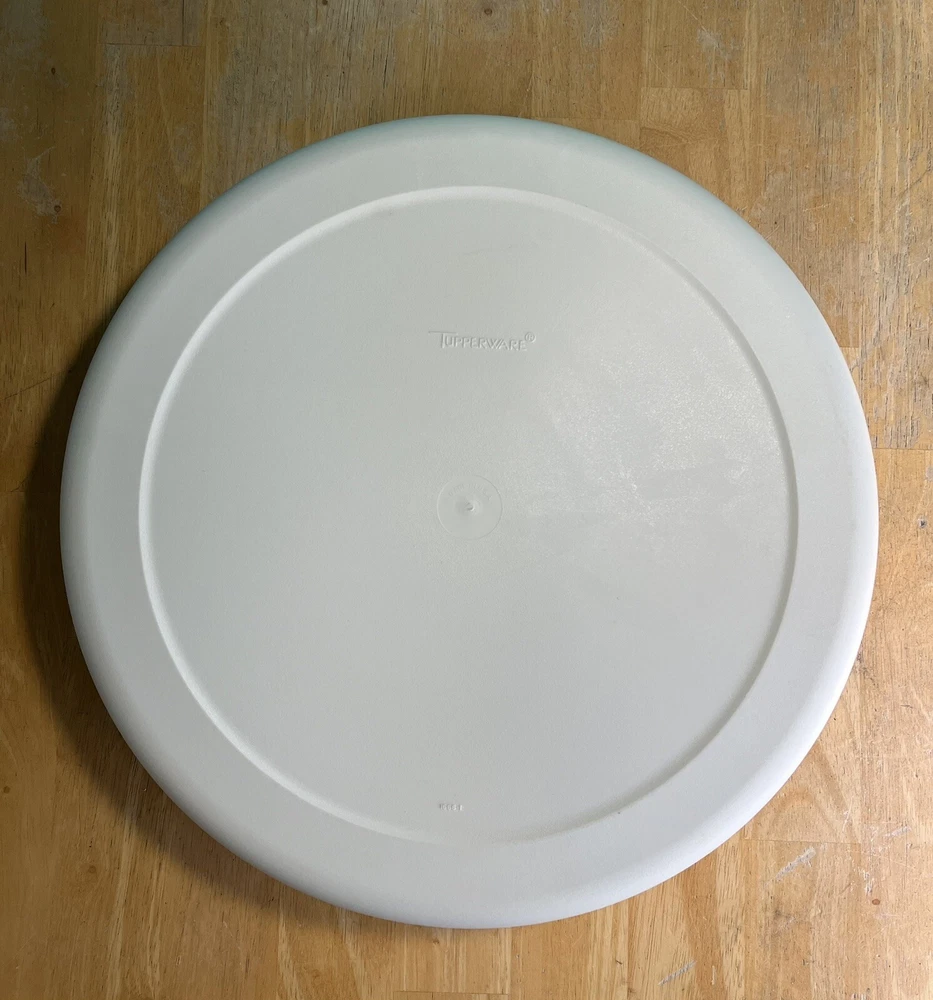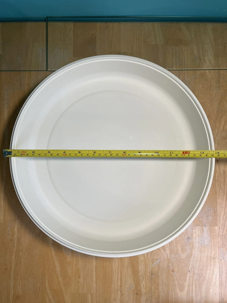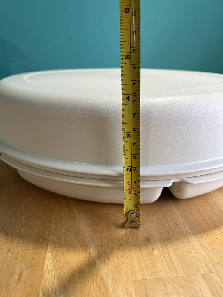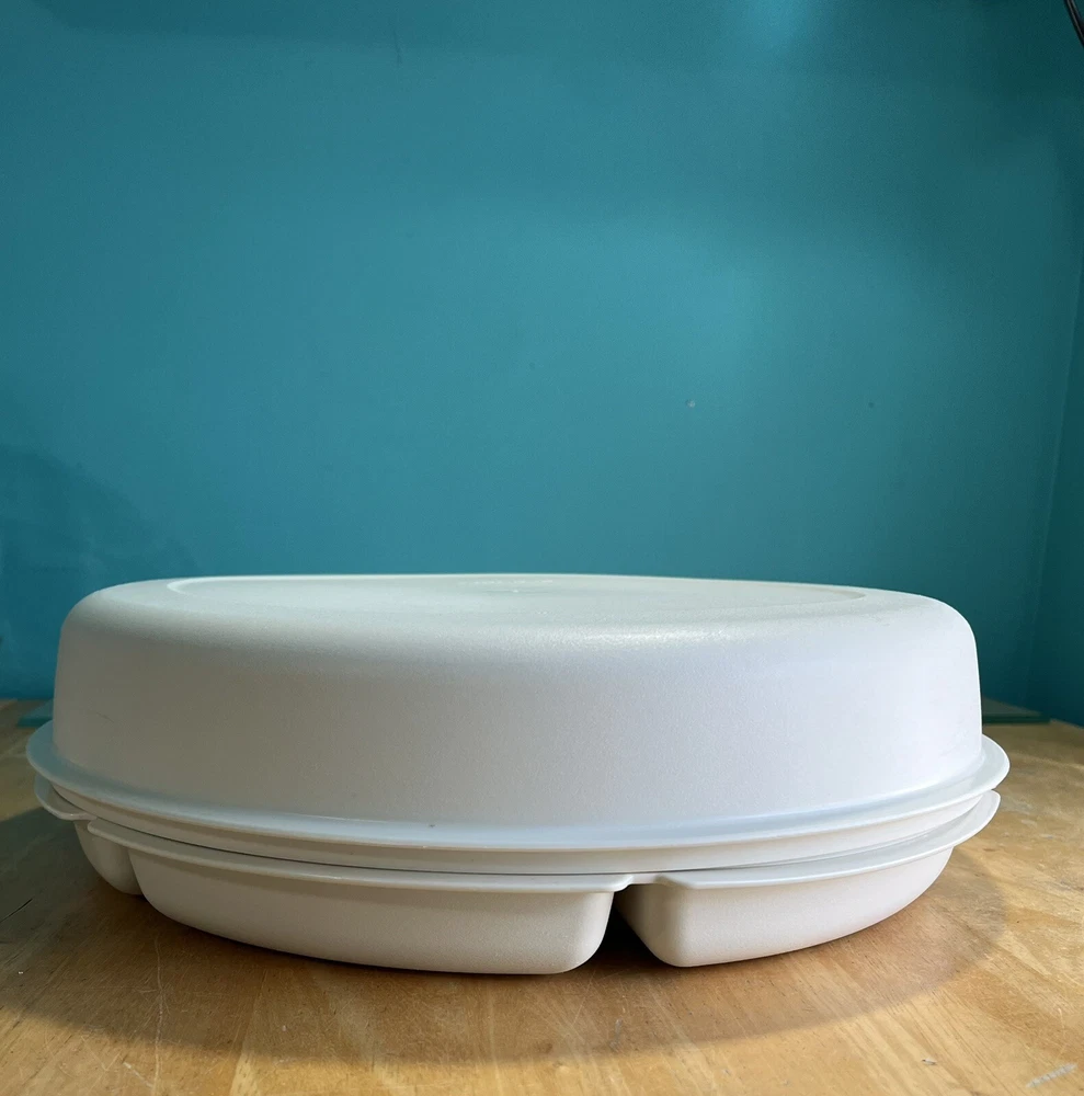 Tupperware Divided Serving Veggie Tray Dip Container Almond 1666-1 Thanks for looking. This Tupperware Divided Serving Veggie Tray Dip Container in Almond is a versatile & practical addition to your kitchen. It features 8 slots if you take out the center bowl you get an extra slot. Making it perfect for serving multiple dishes. The tray comes with a lid as well as the little center bowl. Use it as a sort of lazy susan on your dinner table. Made of durable plastic, this Tupperware tray is in like new condition. It is a contemporary style with a solid pattern. It is perfect for those looking for a reliable & functional kitchen storage solution. It is 4” H, 14” diameter & weighs 1 lb. 6.6 oz. All measurements are approximate. See pictures. A-43