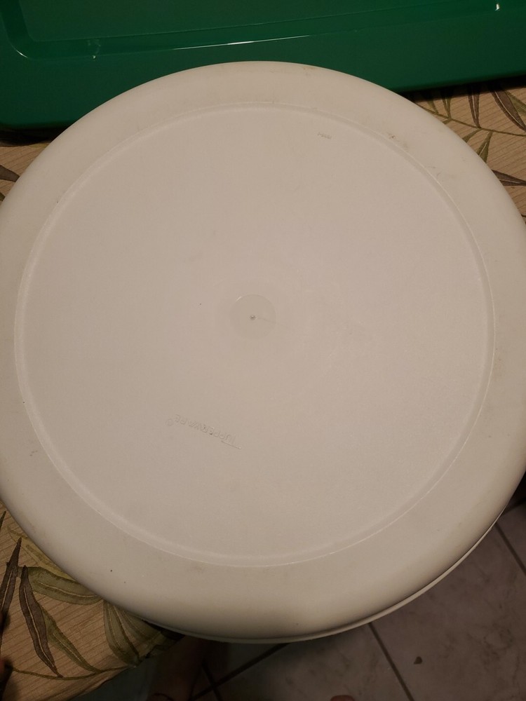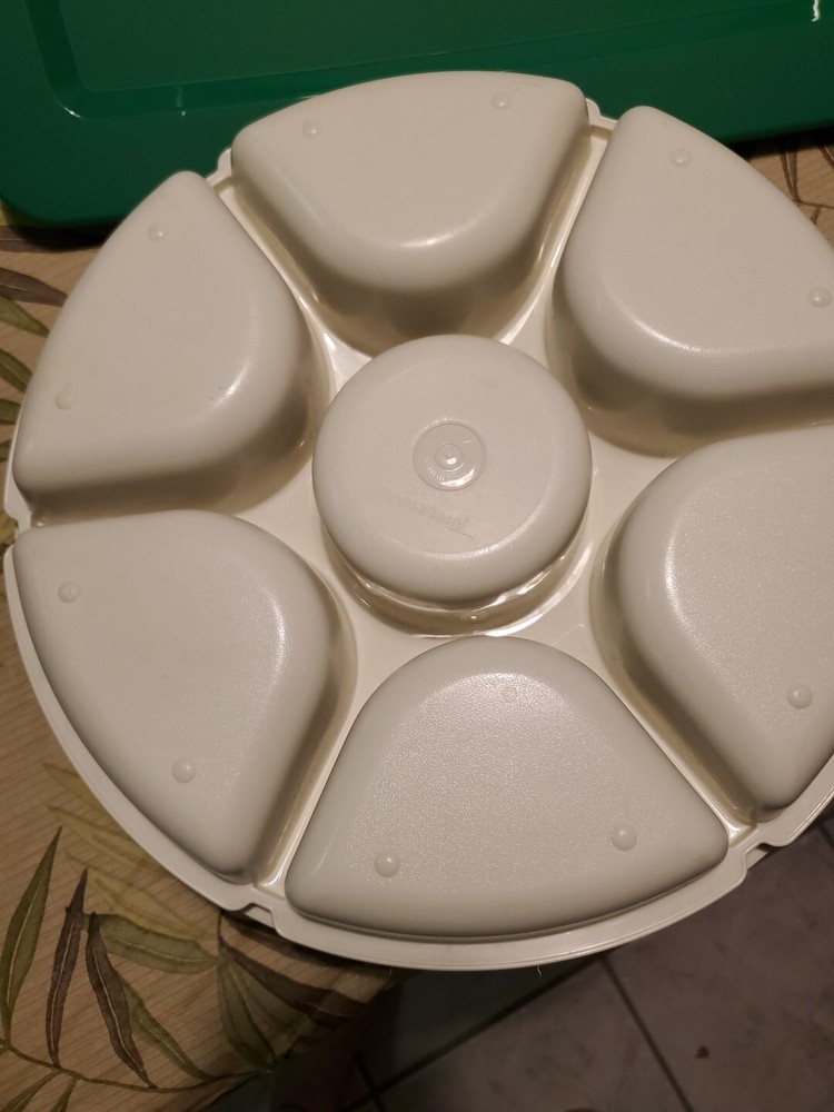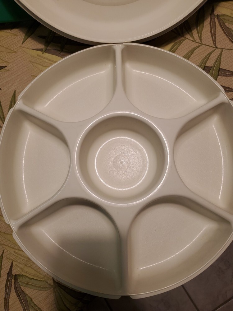 This vintage Tupperware serving tray is a large round divided tray with more than 5 compartments, perfect for serving vegetables, relishes, chips, and dips. The tray features a push-on lid, making it convenient for storing leftovers or transporting food. Made in the United States in the 1970s, this traditional-style tray is beige/tan in color and is part of the Tupperware franchise. The set includes the divided tray with compartments, a lid, and a dip bowl, all in solid patterned plastic material.