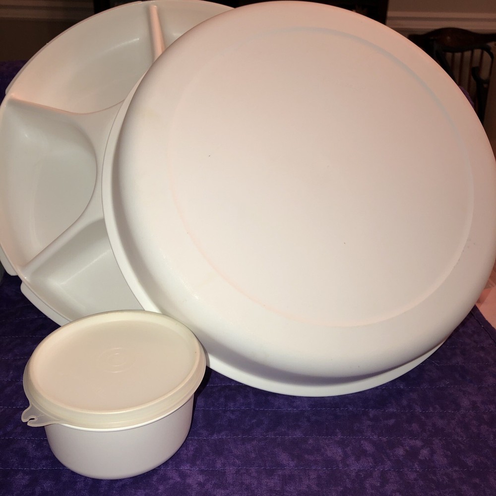 This Tupperware Large Vegetable tray is complete with dip cup & lid in the center. It is preowned but in very nice condition. Snap on lid makes for ease in serving and storing. If you prefer I also have aqua, royal blue and hot pink base with sheer lid. Just let me know quickly.