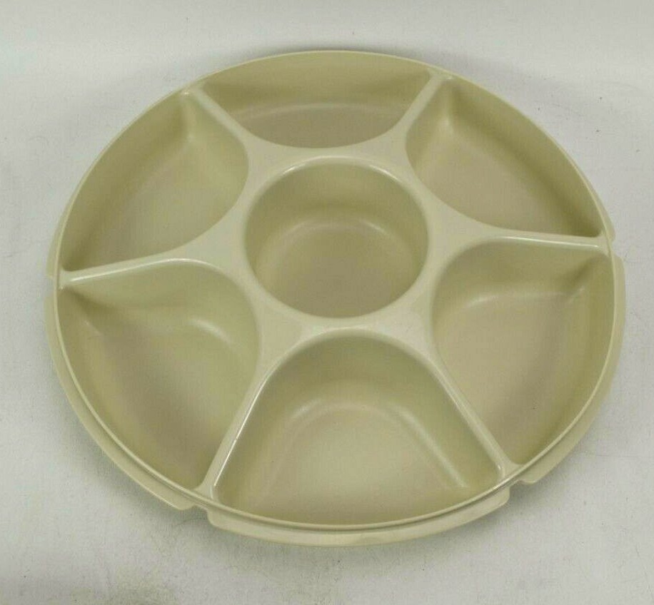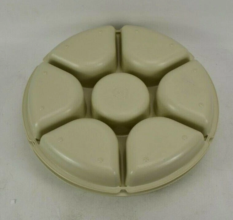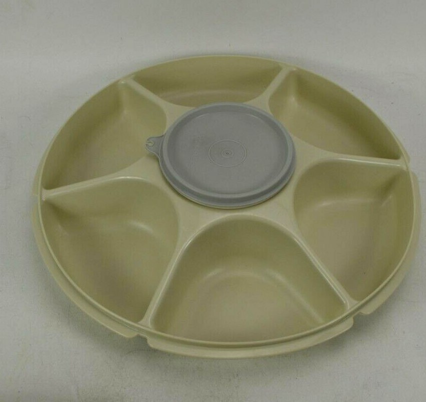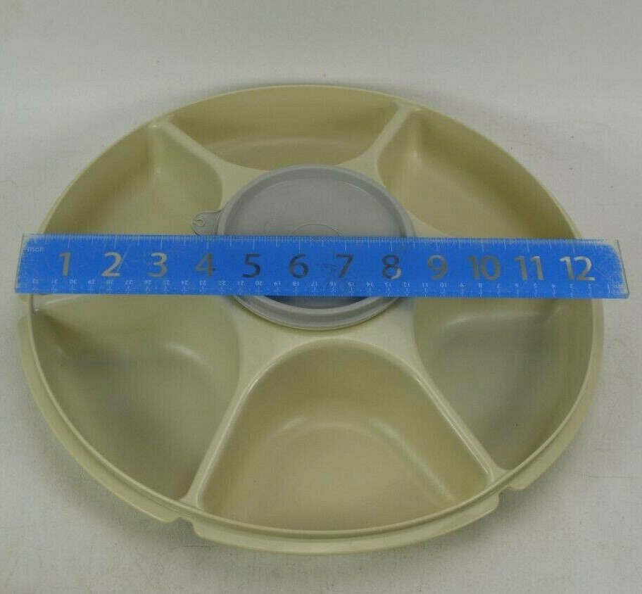 Pre-Owned Tupperware Divided Veggie Fruit Party Tray With Dip Cup Model 1665 Measures Approximately 12.5" Diameter Dip bowl lid did not original come with this bowl, Fits securely