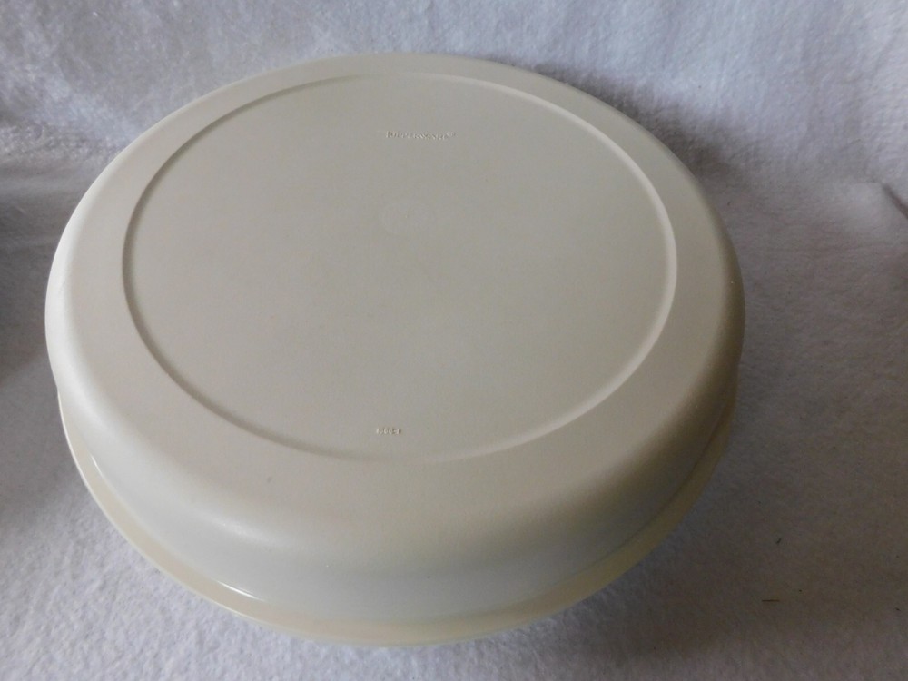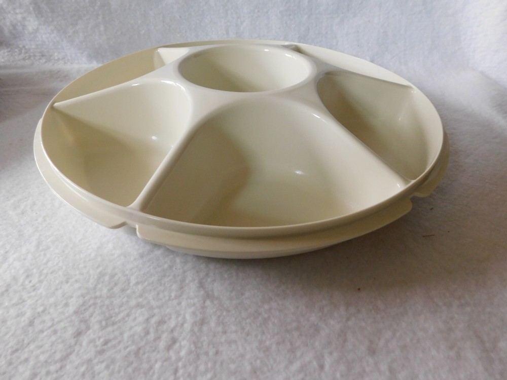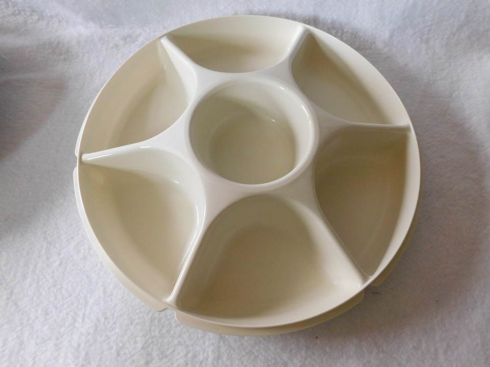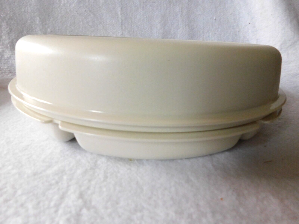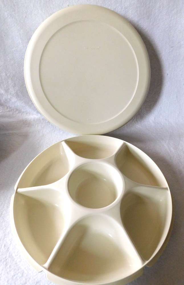 This Tupperware Divided Veggie/Fruit/Dip Snack Party Tray in Almond color is a vintage and original piece that will add a touch of retro style to your kitchen. The tray has more than 5 compartments, including a snap-on lid, and is made of durable plastic material. Measuring 12 inches in length and width, and 3.75 inches in height, this round tray is perfect for serving snacks, dips, and small dishes. The item comes as a set of two pieces, with a total of 7 slots, and is ideal for collectors and enthusiasts of vintage kitchen storage and organization. The tray is a great addition to any kitchen, and its unique design makes it a perfect choice for serving snacks at parties and gatherings.