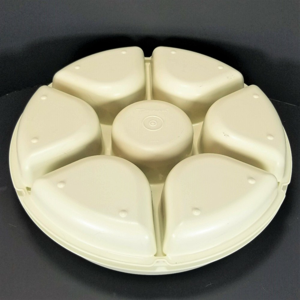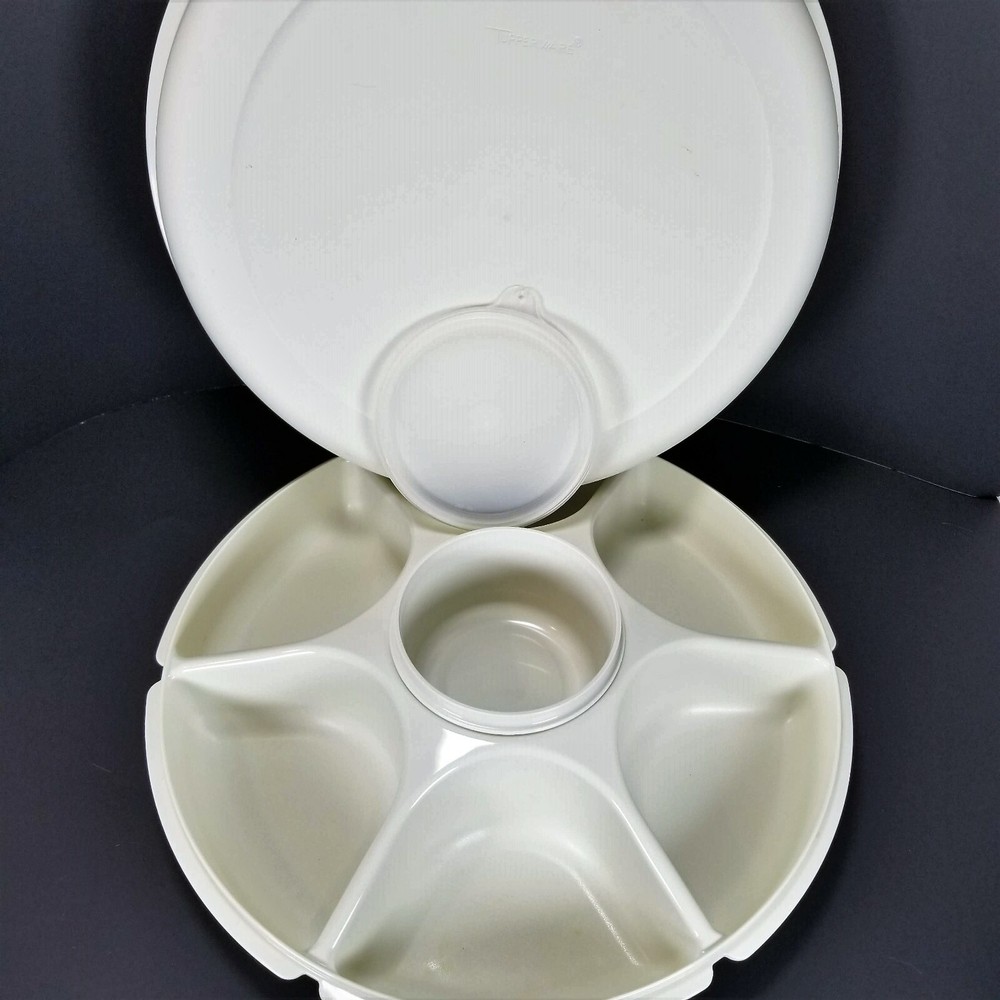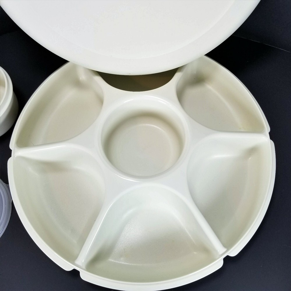 Tupperware Divided Veggie Relish Party Tray 1667-12 w/ Dip Bowl 1665-1 + Lid Very clean and complete. Includes 13 inch diameter base with 6 veggie slots and a center bowl for dip. See photos for more ...