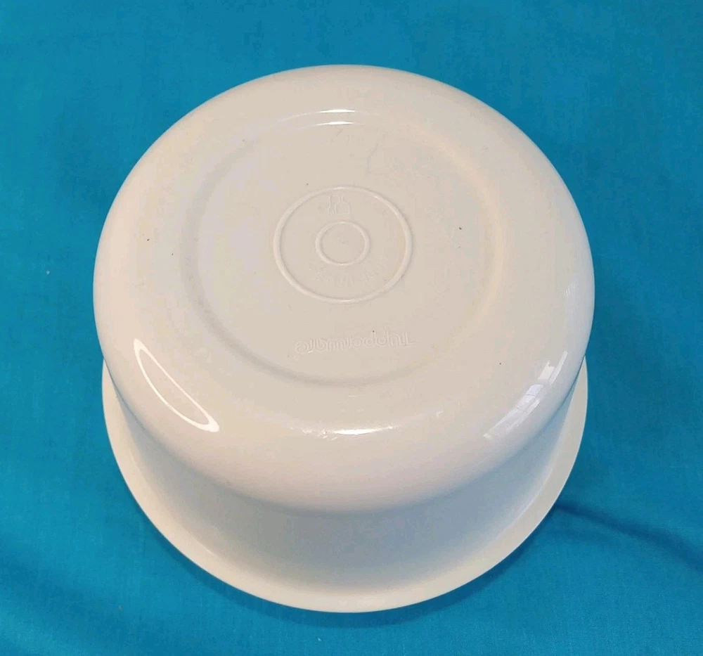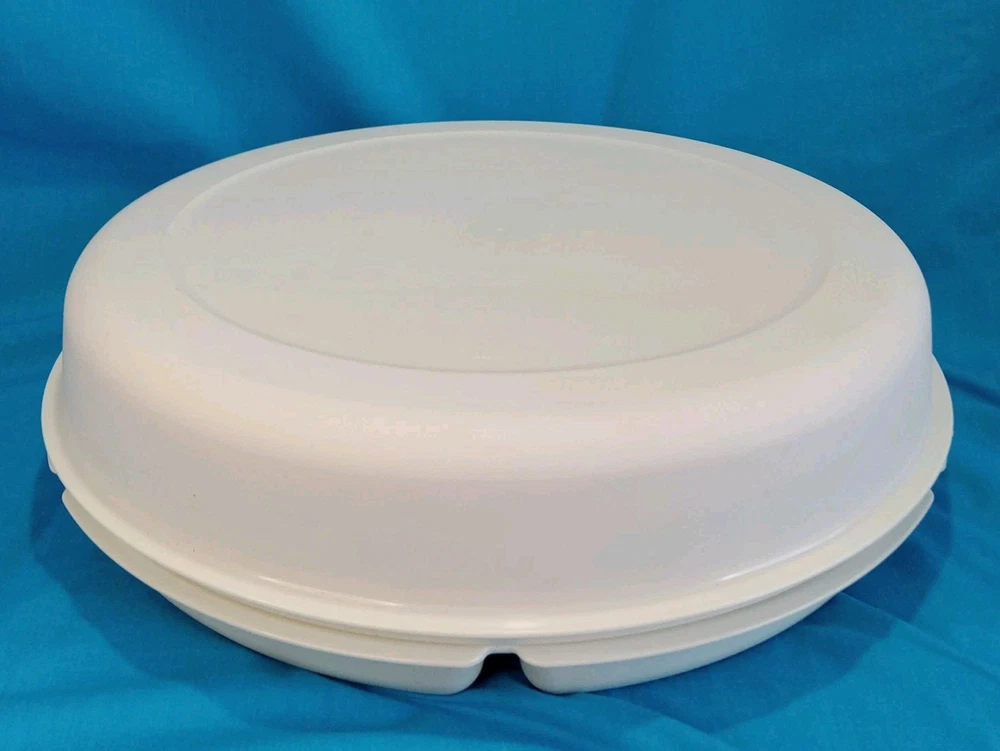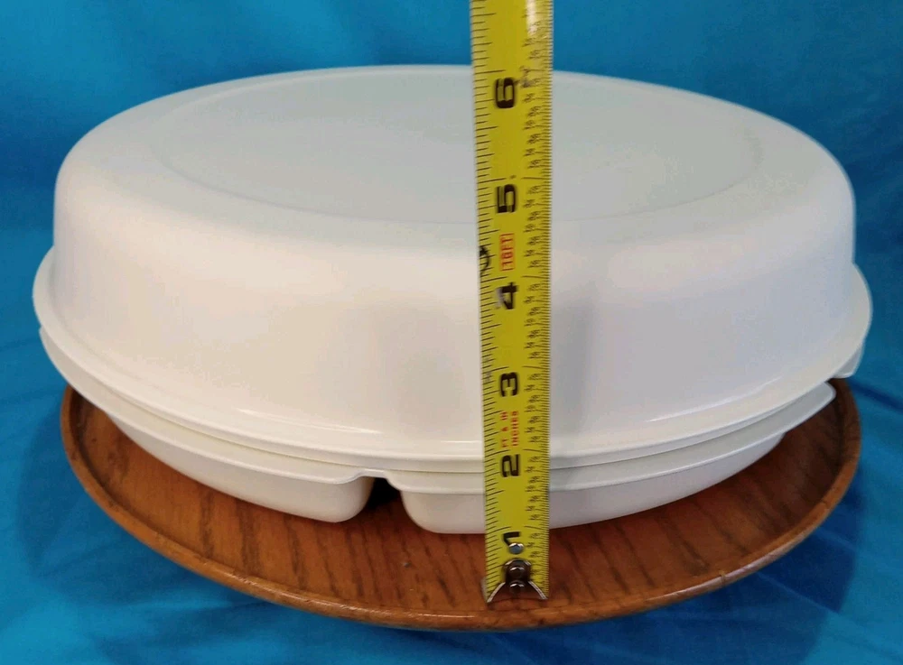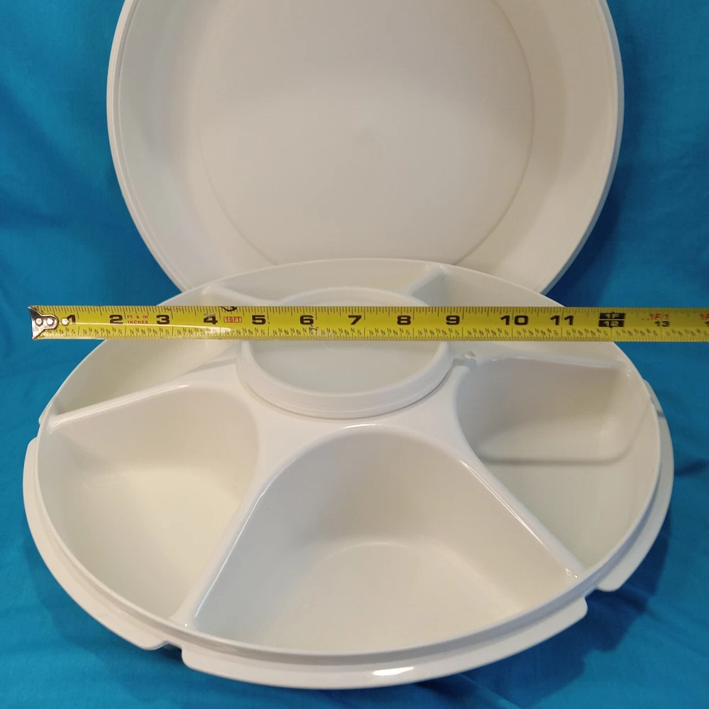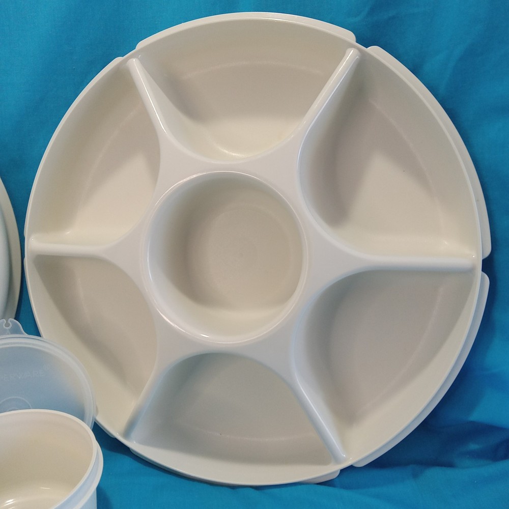 This Vintage Tupperware Divided Veggie Serving Tray with sealing lid #1665-4 is a large round tray with 6 compartments, including a dip bowl with lid. Made in the 2000s in the United States, this vintage Tupperware piece is designed for serving and storing various foods. The tray is stackable, waterproof, and shatterproof, making it easy to clean and multipurpose for organizing vegetables or snacks in one convenient container. Its sealed air-tight Tupperware lid ensures freshness, while the solid almond color adds a retro touch to any kitchen or dining setting.