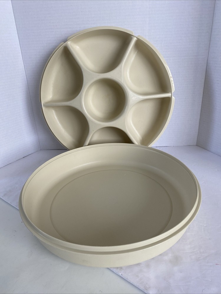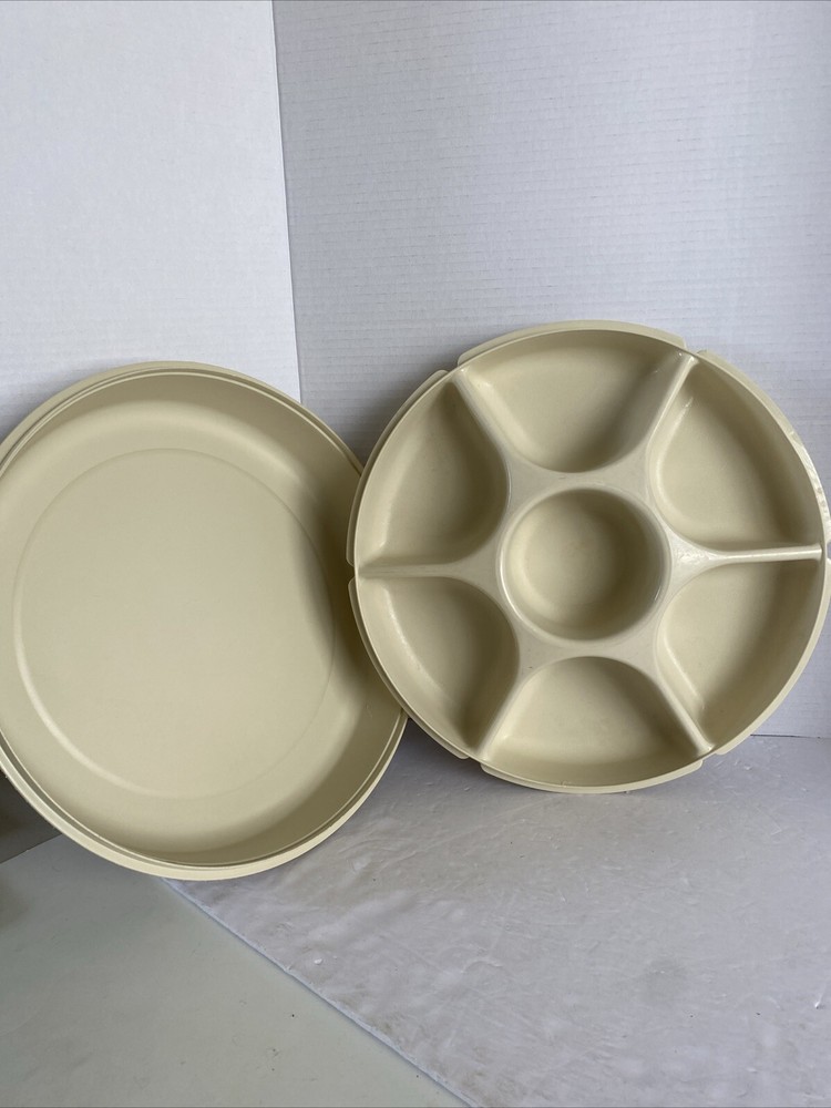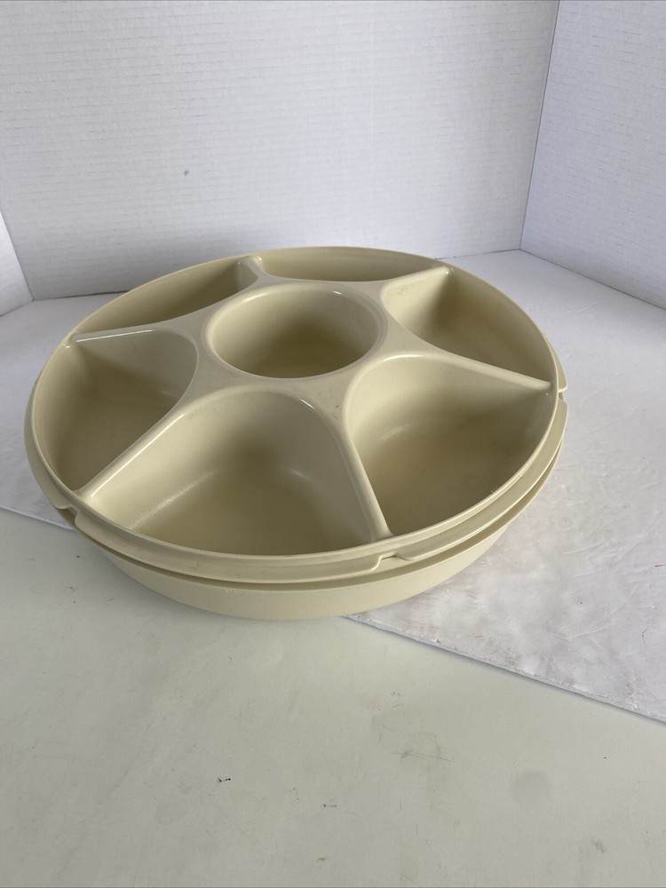 This Tupperware server is a game-changer for parties and meal prep! The spacious compartments keep fruits and veggies neatly separated, while the center dip bowl adds convenience. I love how the secure lid turns it into instant storage—no more transferring food to another container. The vintage almond color gives it a classy look, and the sturdy plastic holds up well. Perfect for picnics, potlucks, or just keeping healthy snacks organized at home. A practical and stylish addition to any kitchen!