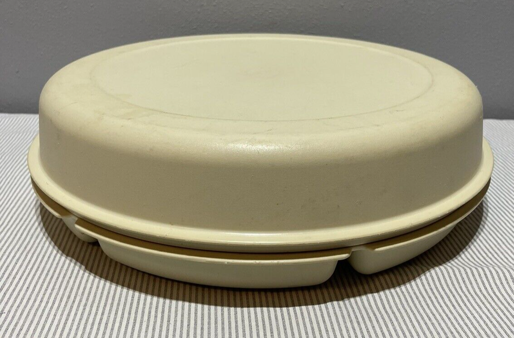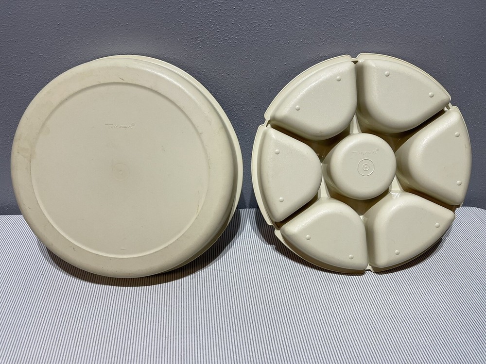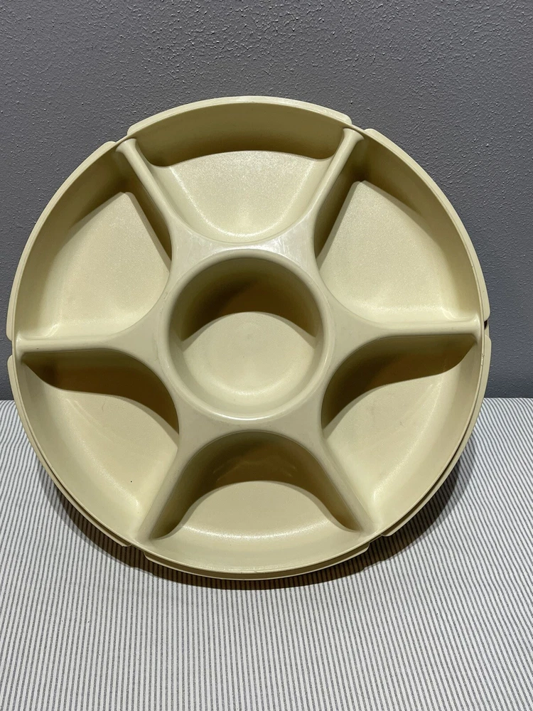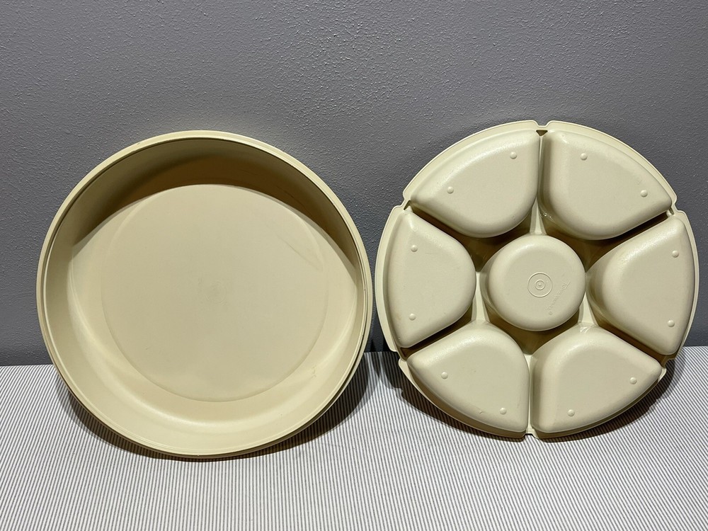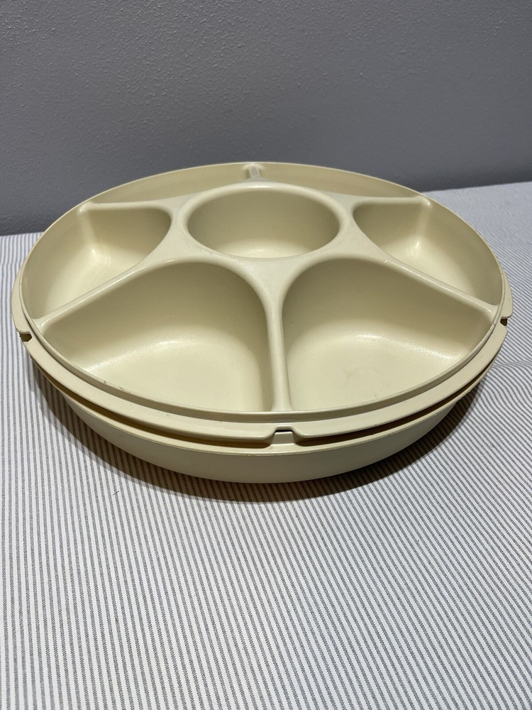 Tupperware Divided Veggie/Fruit/Dip Snack Party Tray Almond 1665-3 W/Lid 1666-1 CONDITION: minor scratches, used condition.