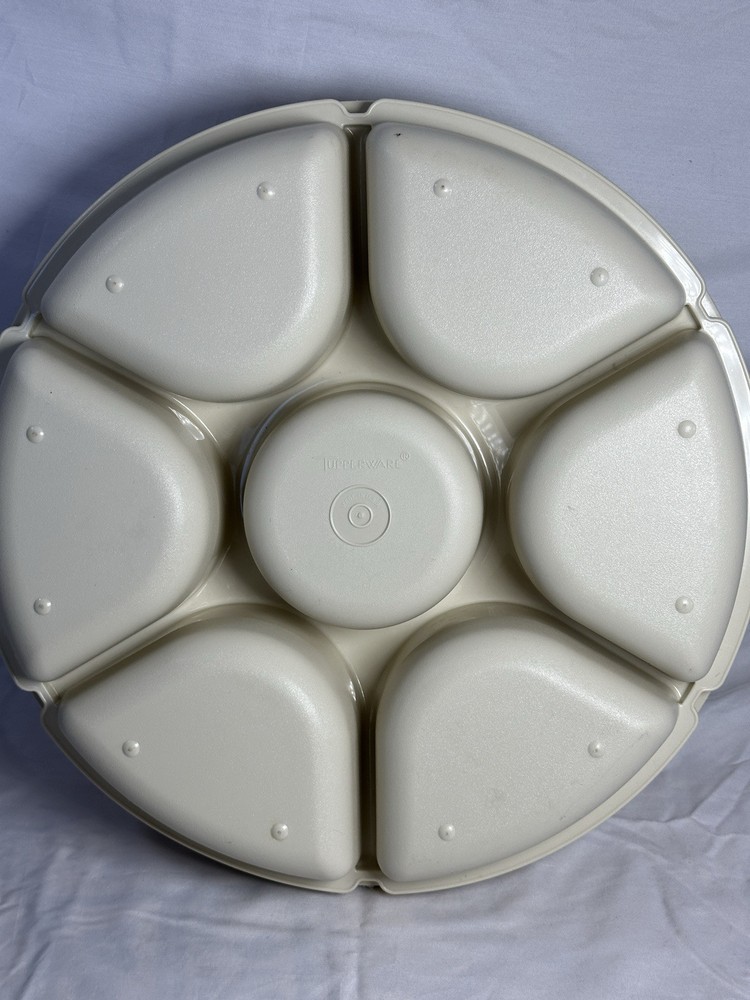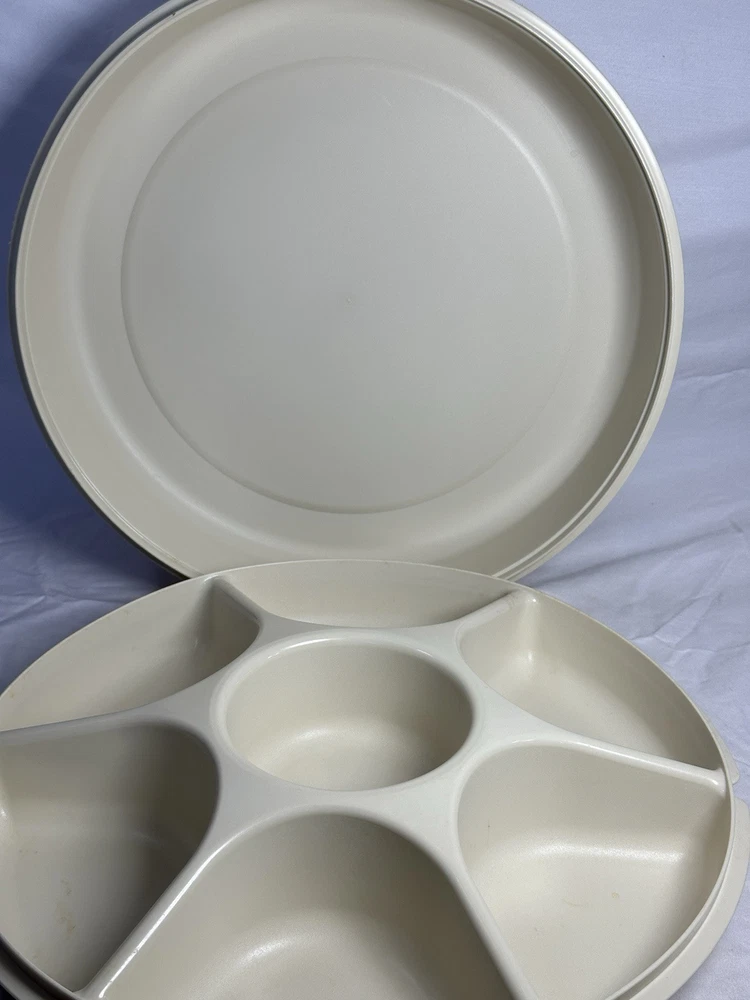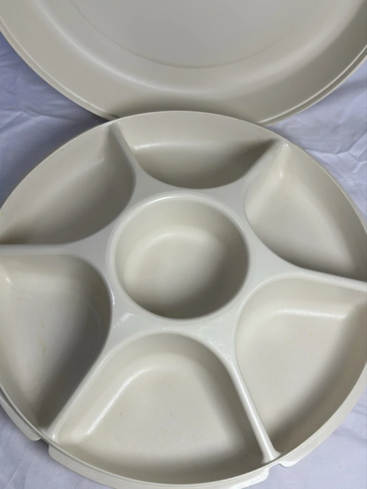 Tupperware Divided Veggie/Fruit/Dip Snack Party Tray Almond 1665-3 W/Lid 1666-5. Condition is Used. Shipped with USPS Ground Advantage....