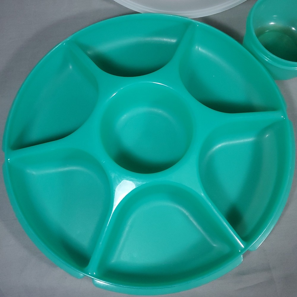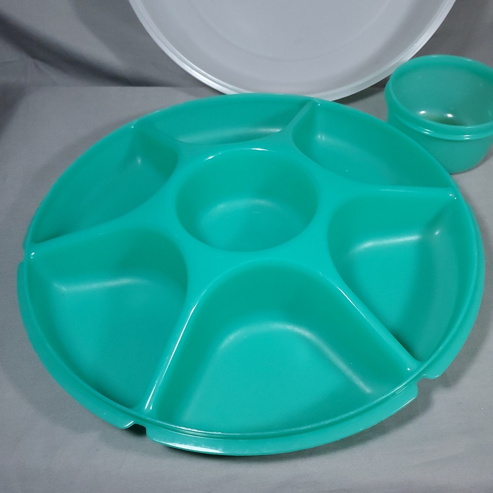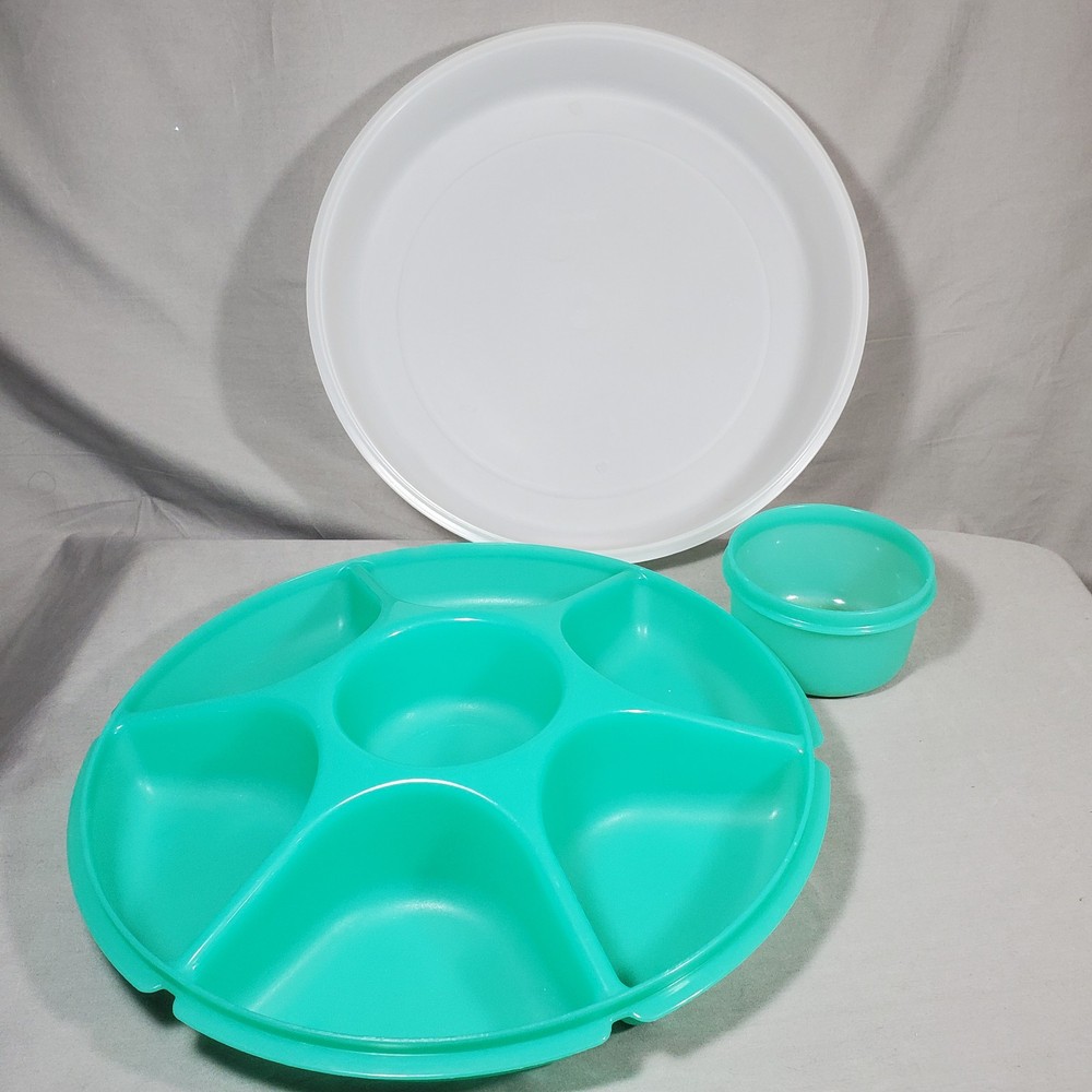 Item: Tupperware Green Divided 14" Serving Tray with Lid & Dip Bowl 1665 1666 1667 VTG Brand: Tupperware Model: Divided Serving Tray with Dip Bowl Color: Green Material: Plastic Height: Approximately 3.5 inches Diameter: Approximately 14 inches Slots: 6 Condition: Pre-owned - No noticeable issues Shipping: USPS